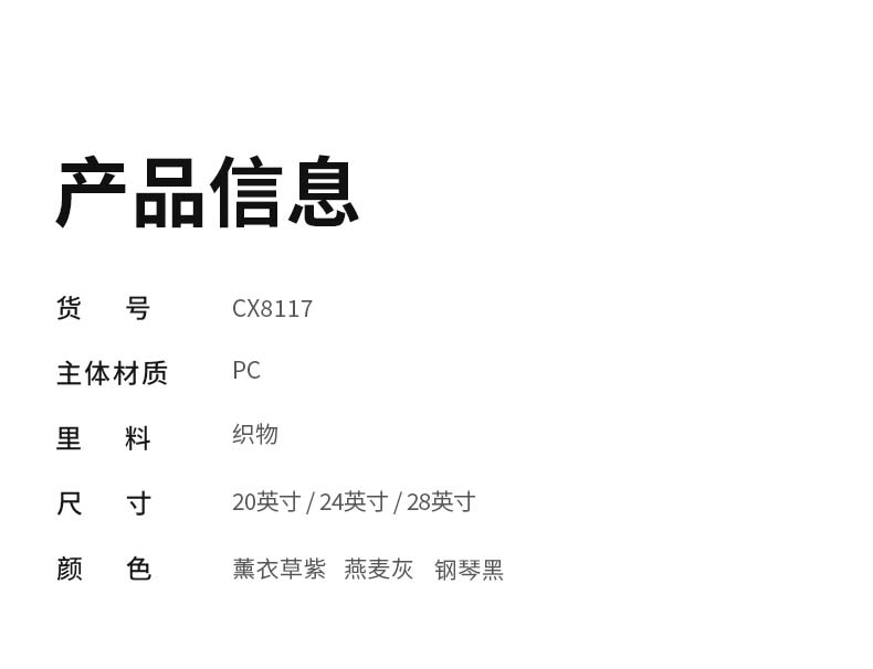 货号:CX8117-20 主体面料:聚碳酸酯(PC);里料:织物 20寸颜色: 薰衣草紫 净重:2.85kg/38L
