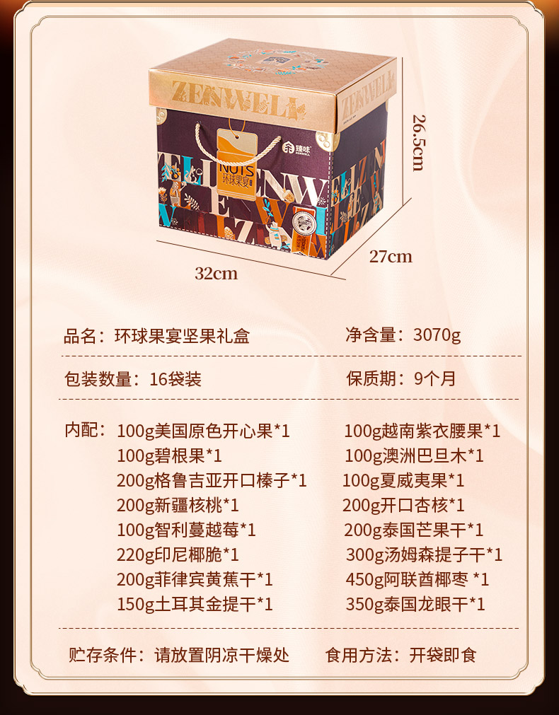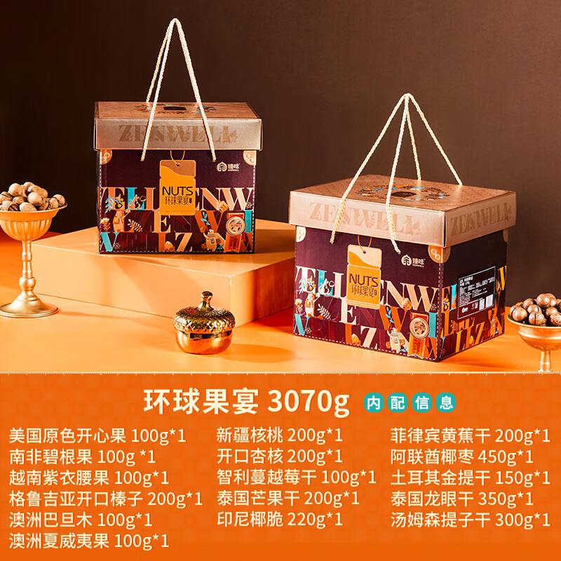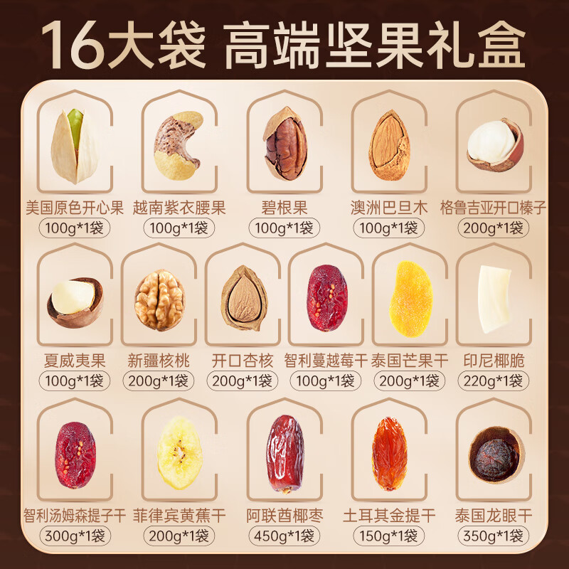 臻味-100g美国原色开心果*1 臻味-100g越南紫衣腰果*1 臻味-100g南非碧根果*1 臻味-100g澳洲巴旦木*1 臻味-200g格鲁吉亚开口榛子*1 臻味-100g夏威夷果*1 臻味-200g新疆核桃*1 臻味-200g开口杏核*1 臻味-100g智利蔓越莓干*1 臻味-200g泰国芒果干*1 臻味-220g印尼椰脆*1 臻味-300g智利汤姆森提子干*1 臻味-200g菲律宾黄蕉干*1 臻味-200g土耳其金提干*1 臻味-450g阿联酋椰枣*1 300g泰国龙眼干*1