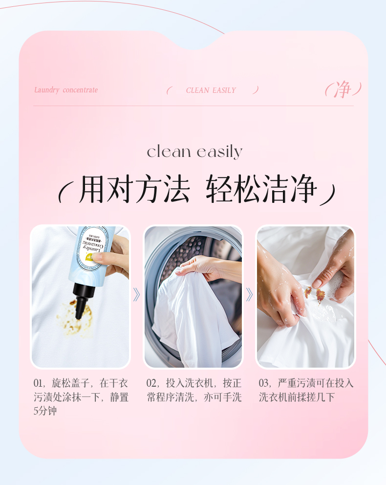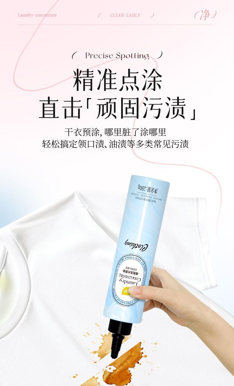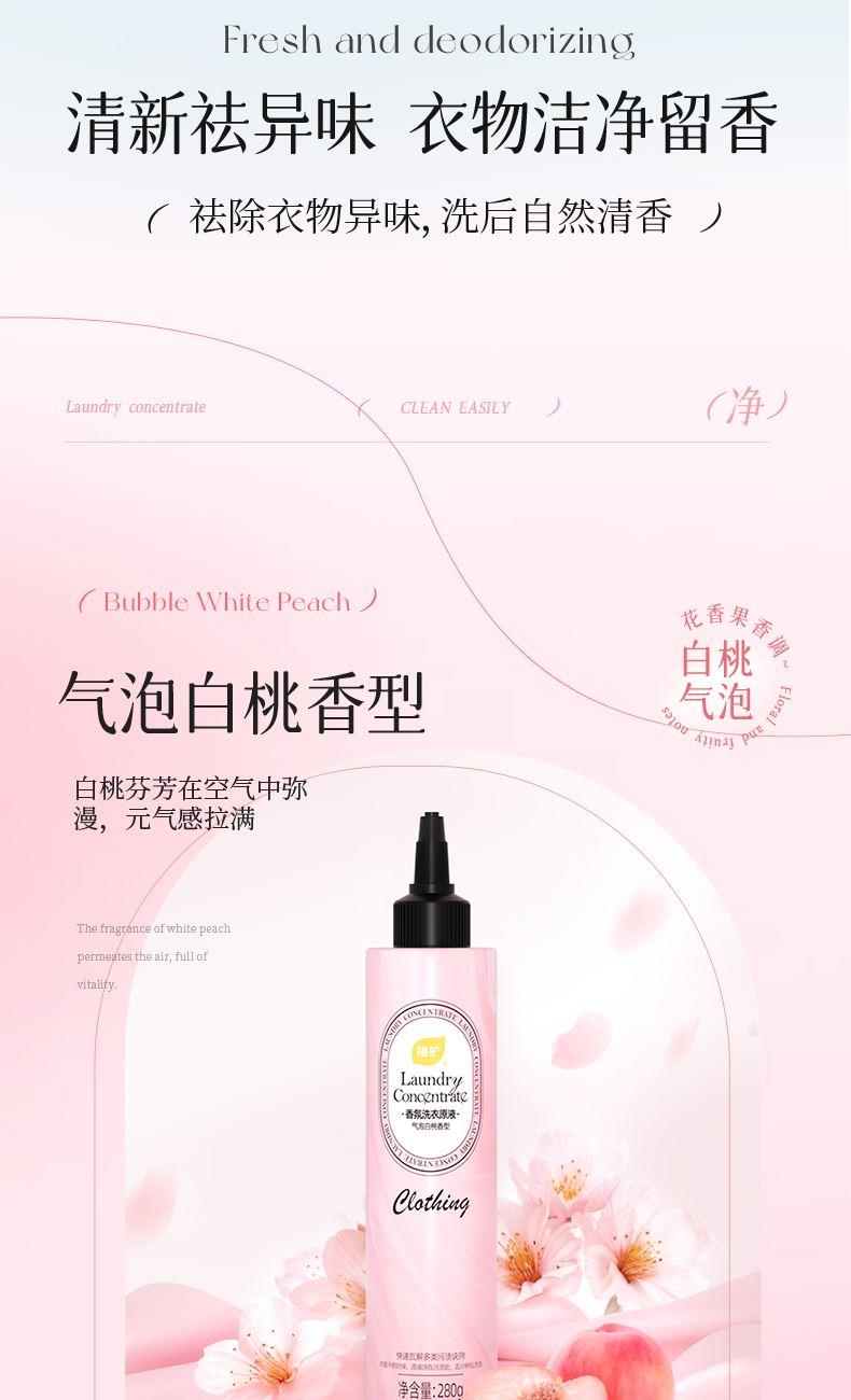 香型:日光橙子香/云朵甜心香/气泡白桃香 香型随机 净含量:280g 主要成分:水、表面活性剂、椰子油表面活性剂、香精、蛋白酶、抗重沉积剂等 适用范围:适用于棉、麻、合成纤维、混纺等质料衣物的局部重污。 1、活性洁净因子,深层渗透 ,有效去污; 2、清新祛异味,衣物洁净留香; 3、点涂直击顽固污渍; 4、干衣预涂,哪里脏了涂哪里轻松搞定领口渍、油渍等多类常见污渍; 5、蛋白酶靶向去渍无需费力搓 6、去除生理期血渍、衣领汗渍,洗衣没烦恼