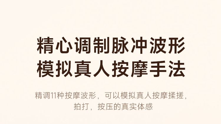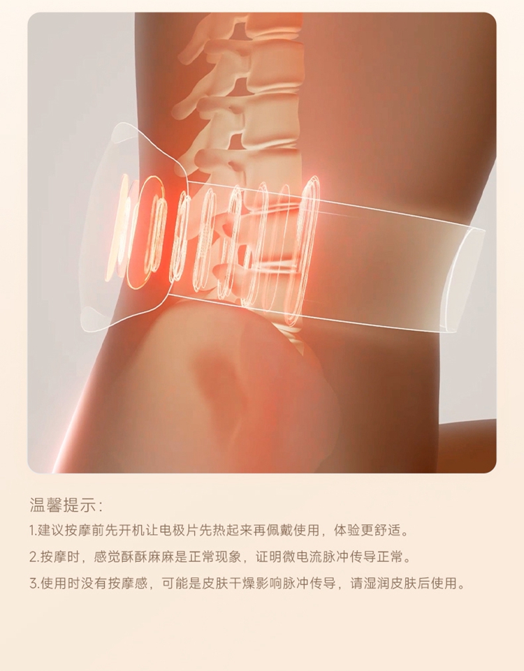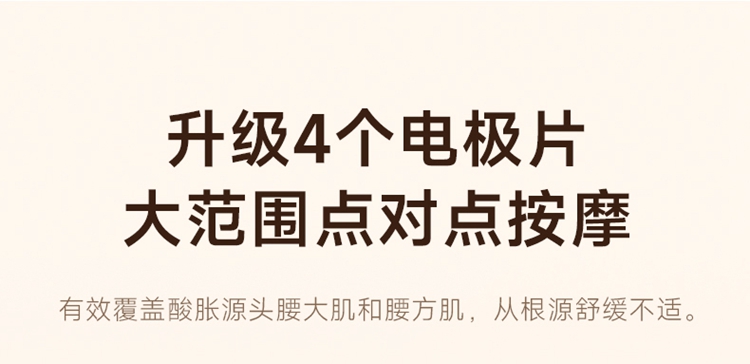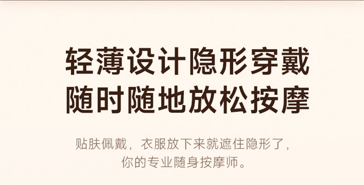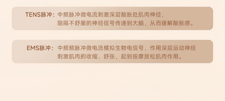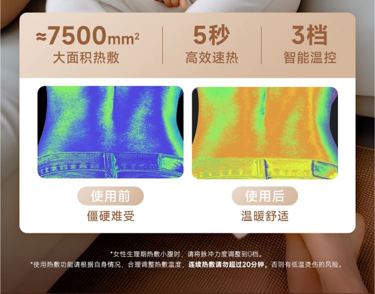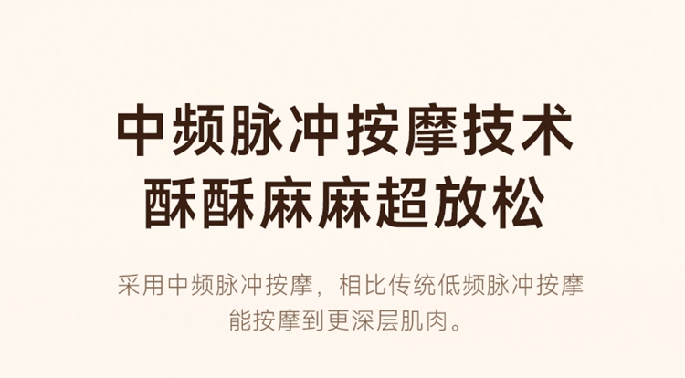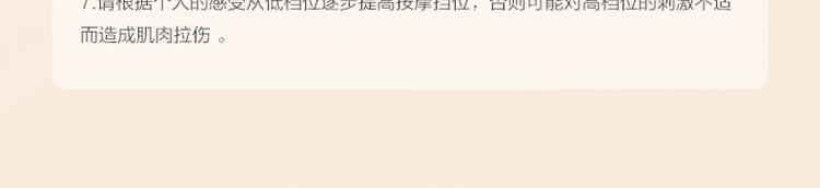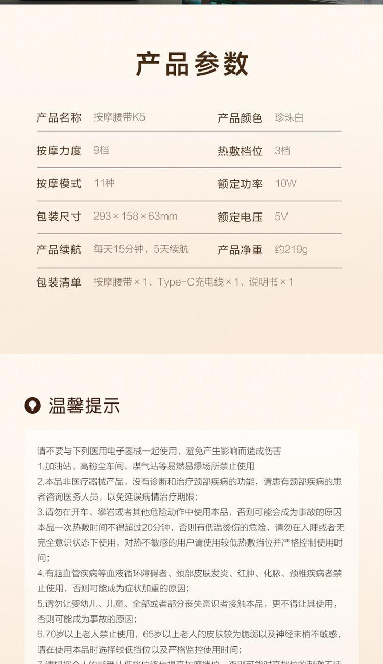 产品描述: 升级4区中频按摩(1KHz) 脉冲调频技术 10种按摩手法,9档按摩力度 7500mm2大面积热敷 分体式设 轻盈无感隐形佩戴 产品参数: 机身材质:徕卡/皮革/亲肤硅胶 电源电压:5V/10W 充电接口:type-C 控制方式:机身按键+APP智控 语音播报:无 电池容量:2000mAh锂电池 续航时间:5天(90分钟) 按摩时间:15分钟 按摩模式:10种 9档力度 热敷档位:3档 温度挡位:38/40/42℃ 单台毛重/净重:0.487/0.219kg 彩箱尺寸:286*147*56mm