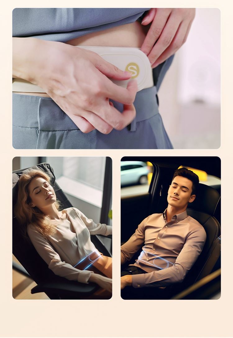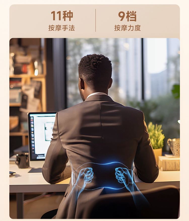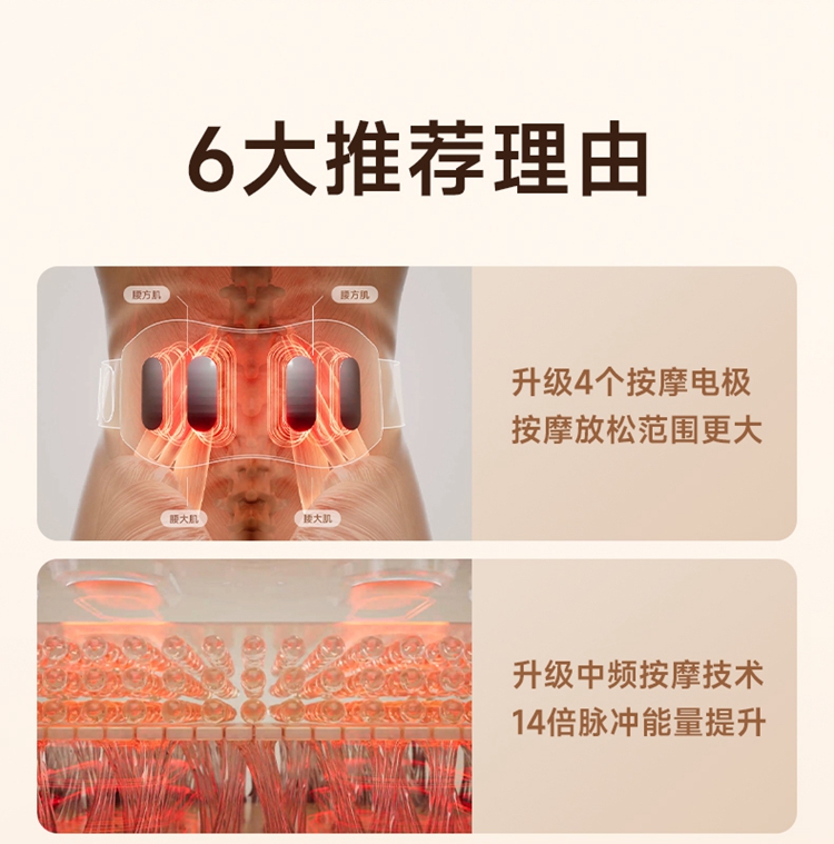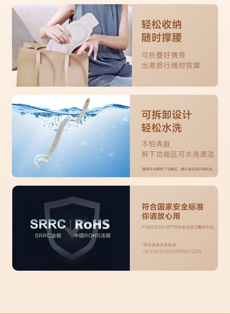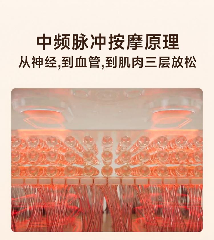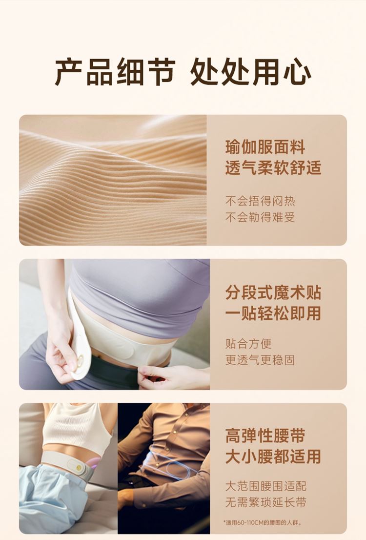 产品描述: 升级4区中频按摩(1KHz) 脉冲调频技术 10种按摩手法,9档按摩力度 7500mm2大面积热敷 分体式设 轻盈无感隐形佩戴 产品参数: 机身材质:徕卡/皮革/亲肤硅胶 电源电压:5V/10W 充电接口:type-C 控制方式:机身按键+APP智控 语音播报:无 电池容量:2000mAh锂电池 续航时间:5天(90分钟) 按摩时间:15分钟 按摩模式:10种 9档力度 热敷档位:3档 温度挡位:38/40/42℃ 单台毛重/净重:0.487/0.219kg 彩箱尺寸:286*147*56mm