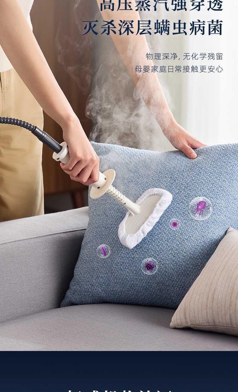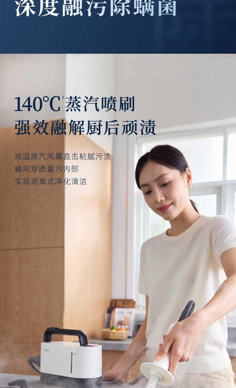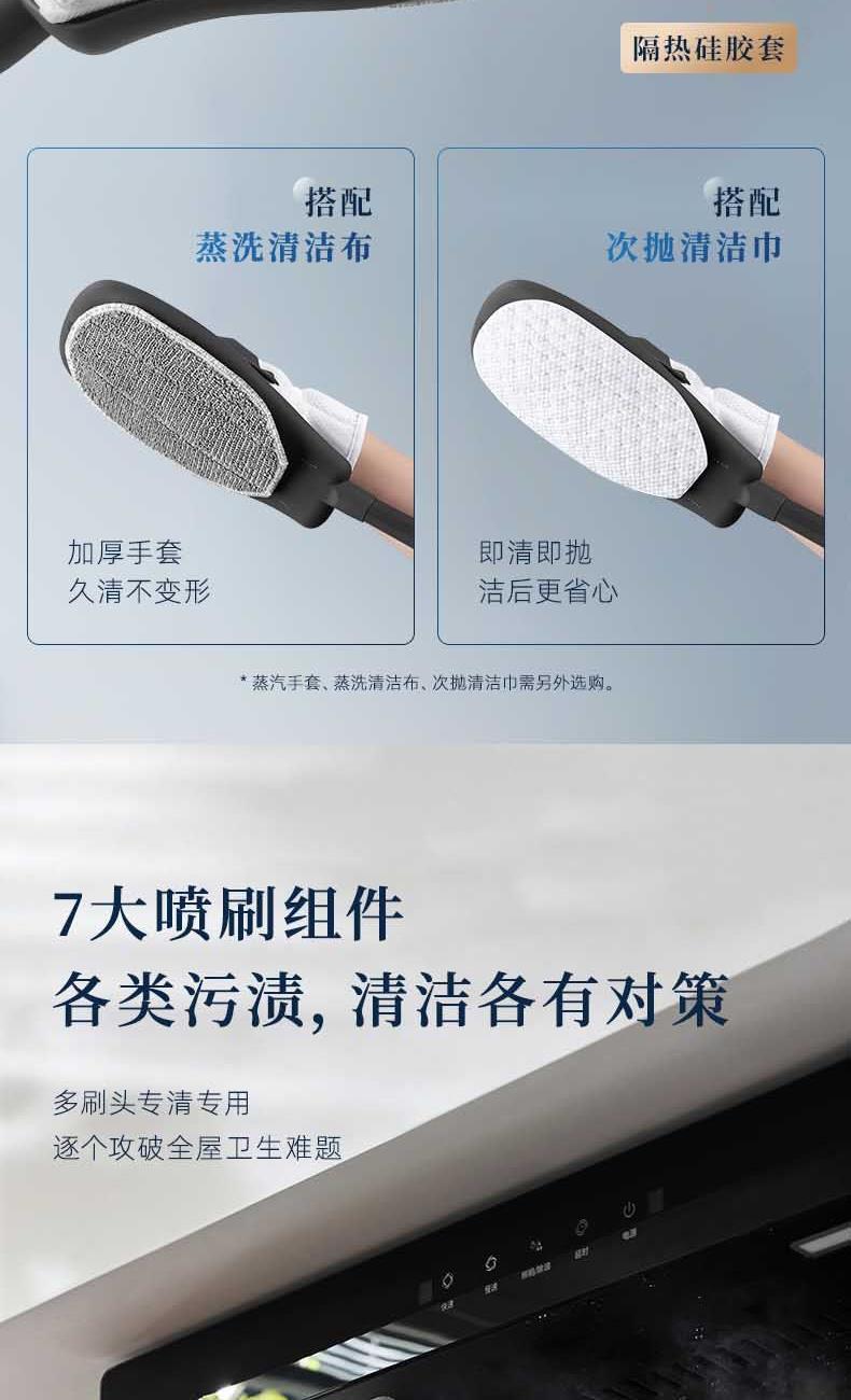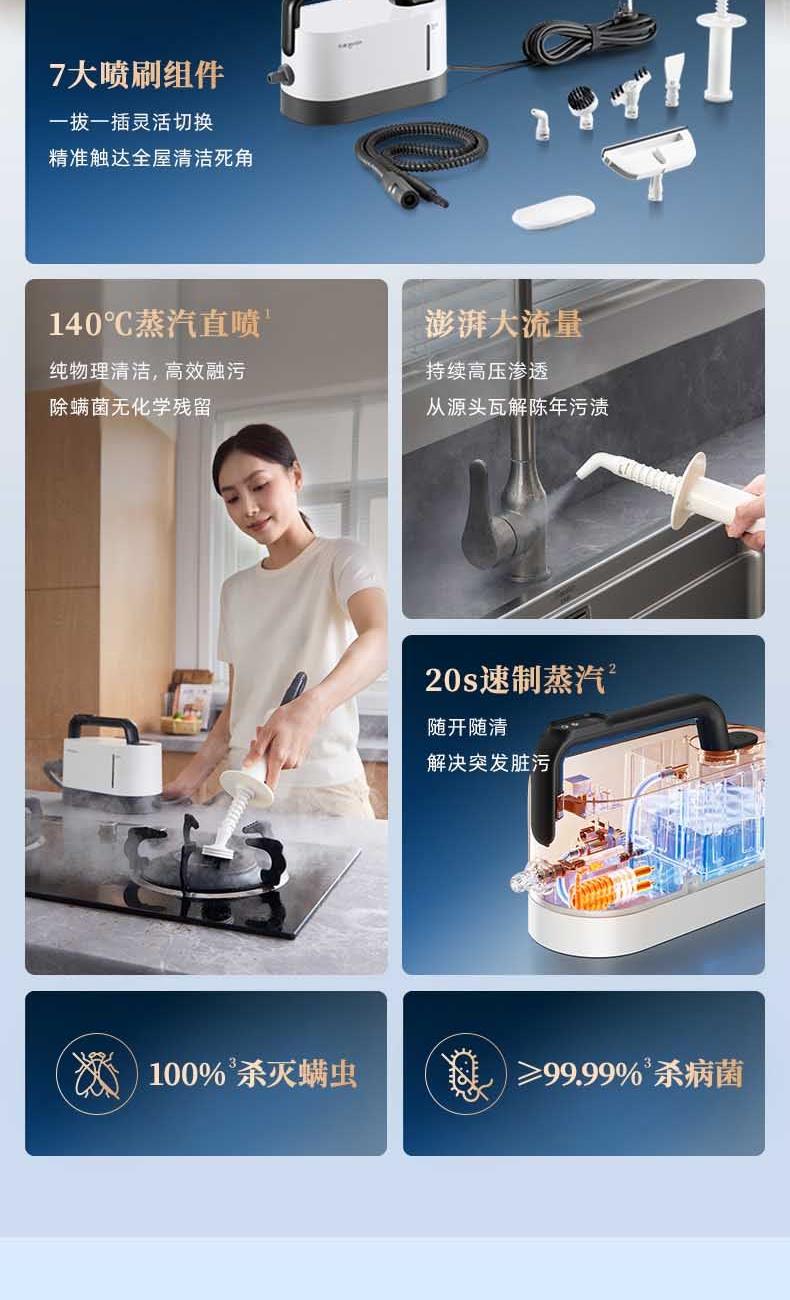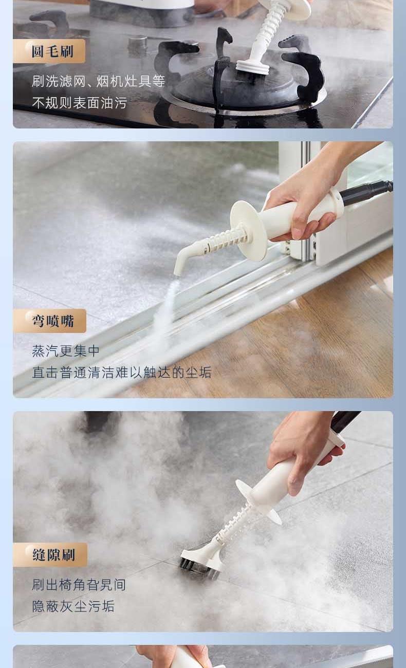 20秒140℃蒸汽3bar高压直喷,纯物理高效融污,除螨菌无残留 澎湃大流量,持续高压渗透,从源头瓦解陈年污渍 7大喷刷组件,精 准触达全屋清洁死角 4米电源线+1.3米延长软管覆盖每个角落