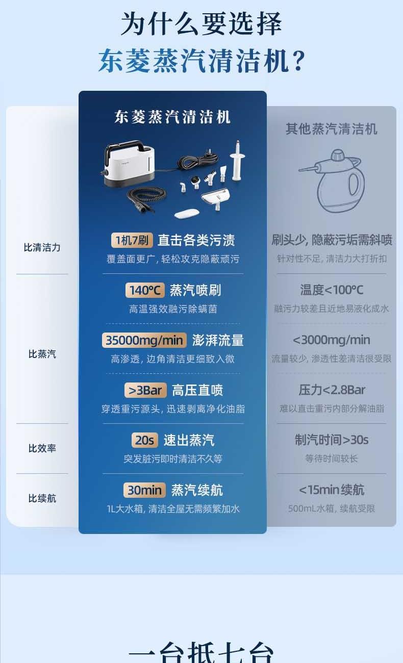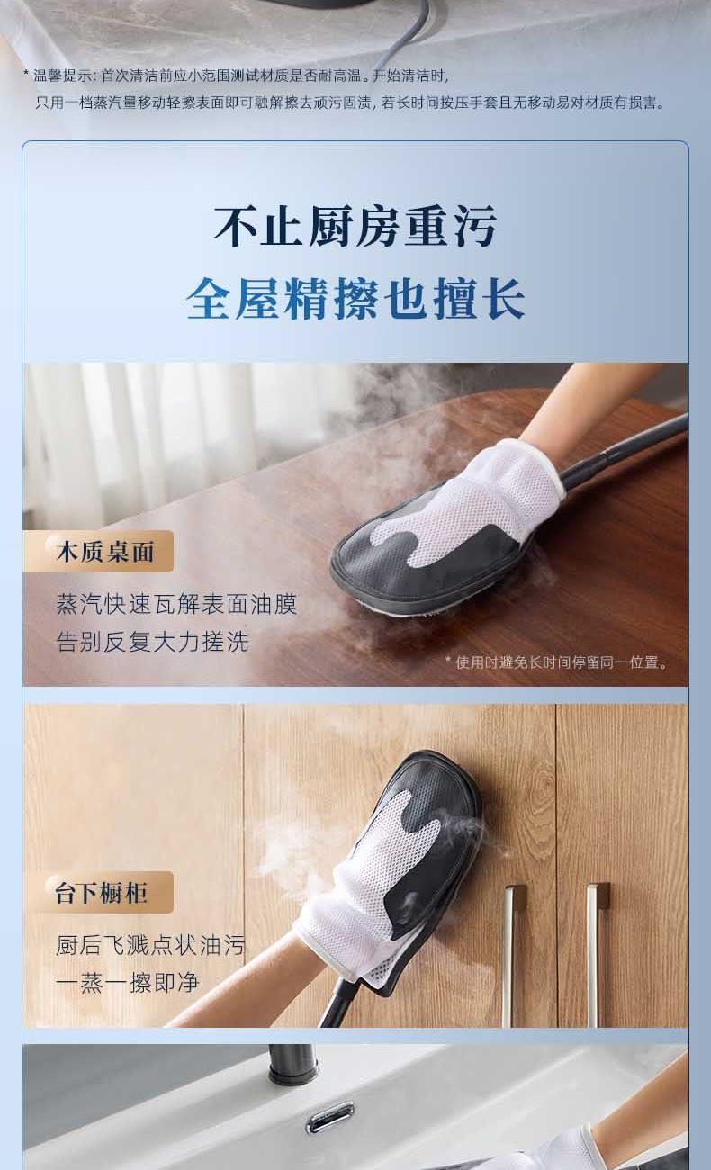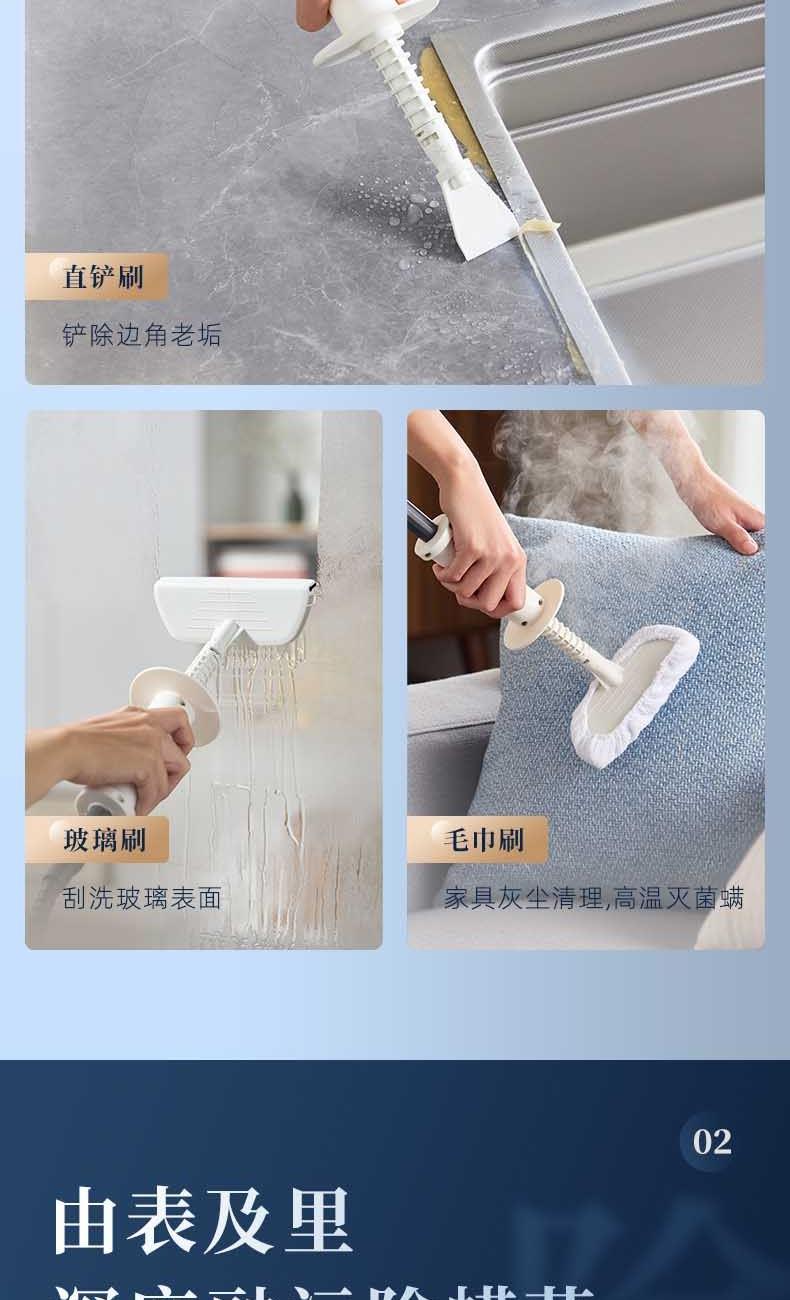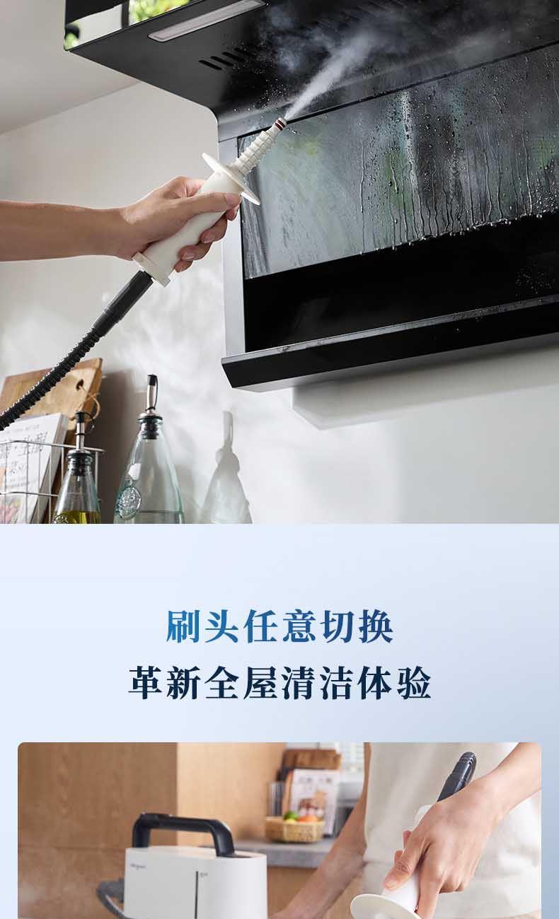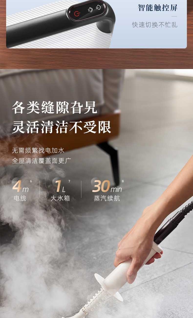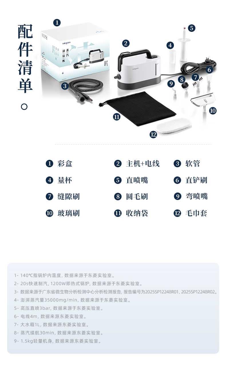 20秒140℃蒸汽3bar高压直喷,纯物理高效融污,除螨菌无残留 澎湃大流量,持续高压渗透,从源头瓦解陈年污渍 7大喷刷组件,精 准触达全屋清洁死角 4米电源线+1.3米延长软管覆盖每个角落