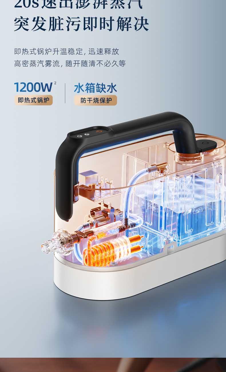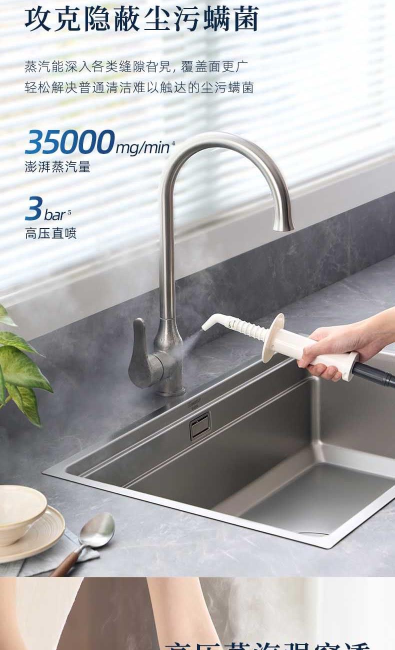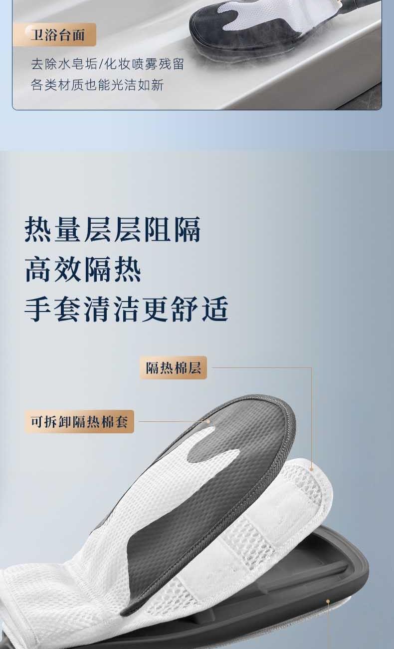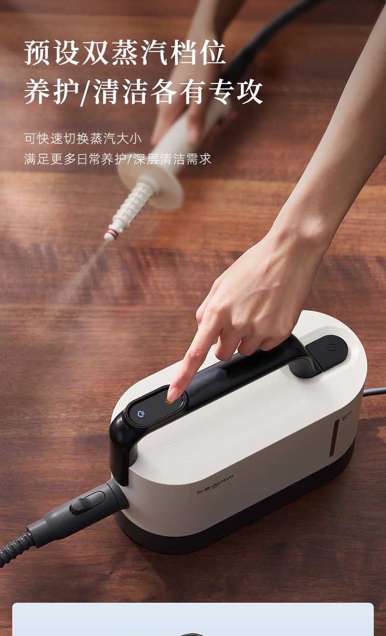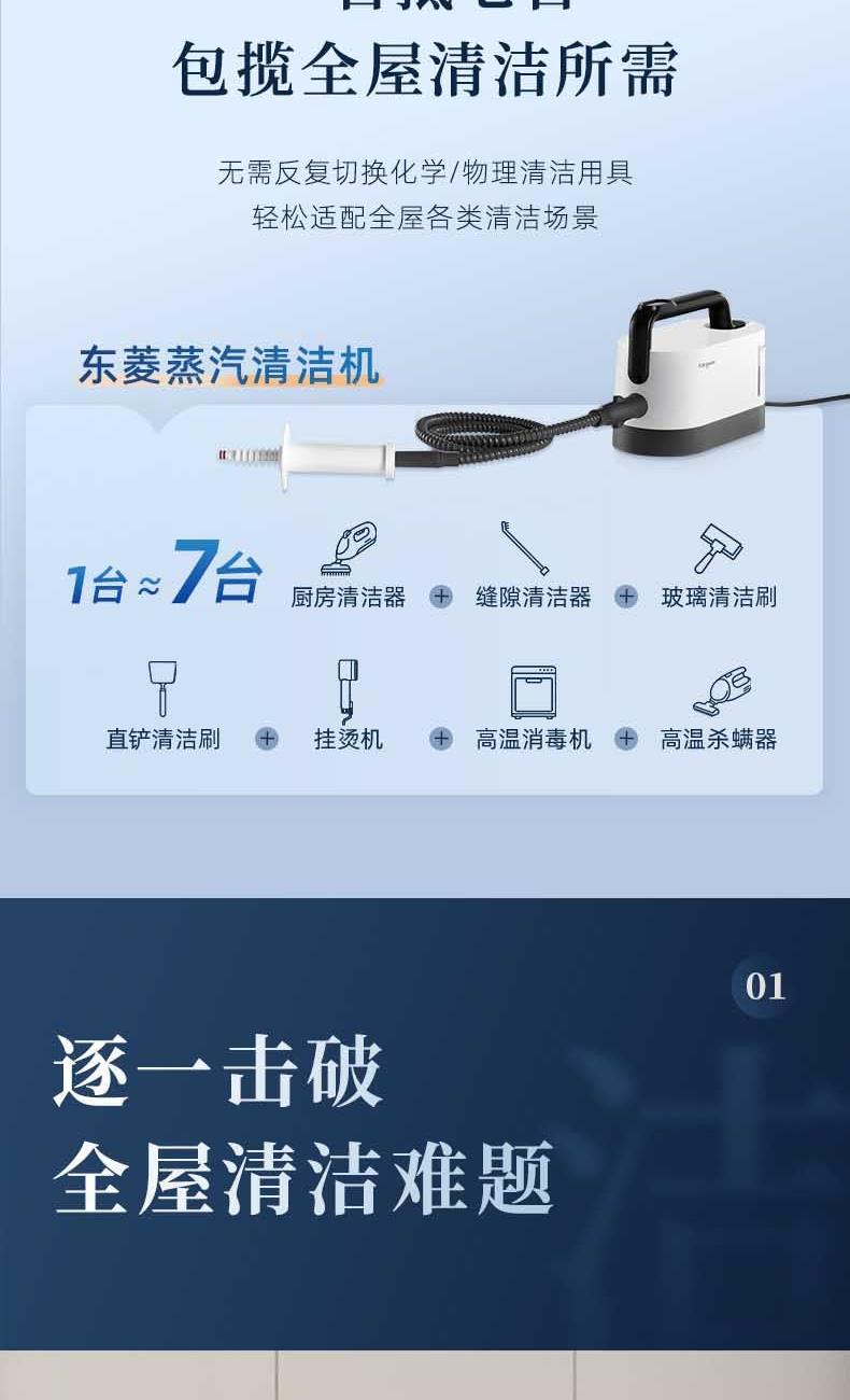 20秒140℃蒸汽3bar高压直喷,纯物理高效融污,除螨菌无残留 澎湃大流量,持续高压渗透,从源头瓦解陈年污渍 7大喷刷组件,精 准触达全屋清洁死角 4米电源线+1.3米延长软管覆盖每个角落