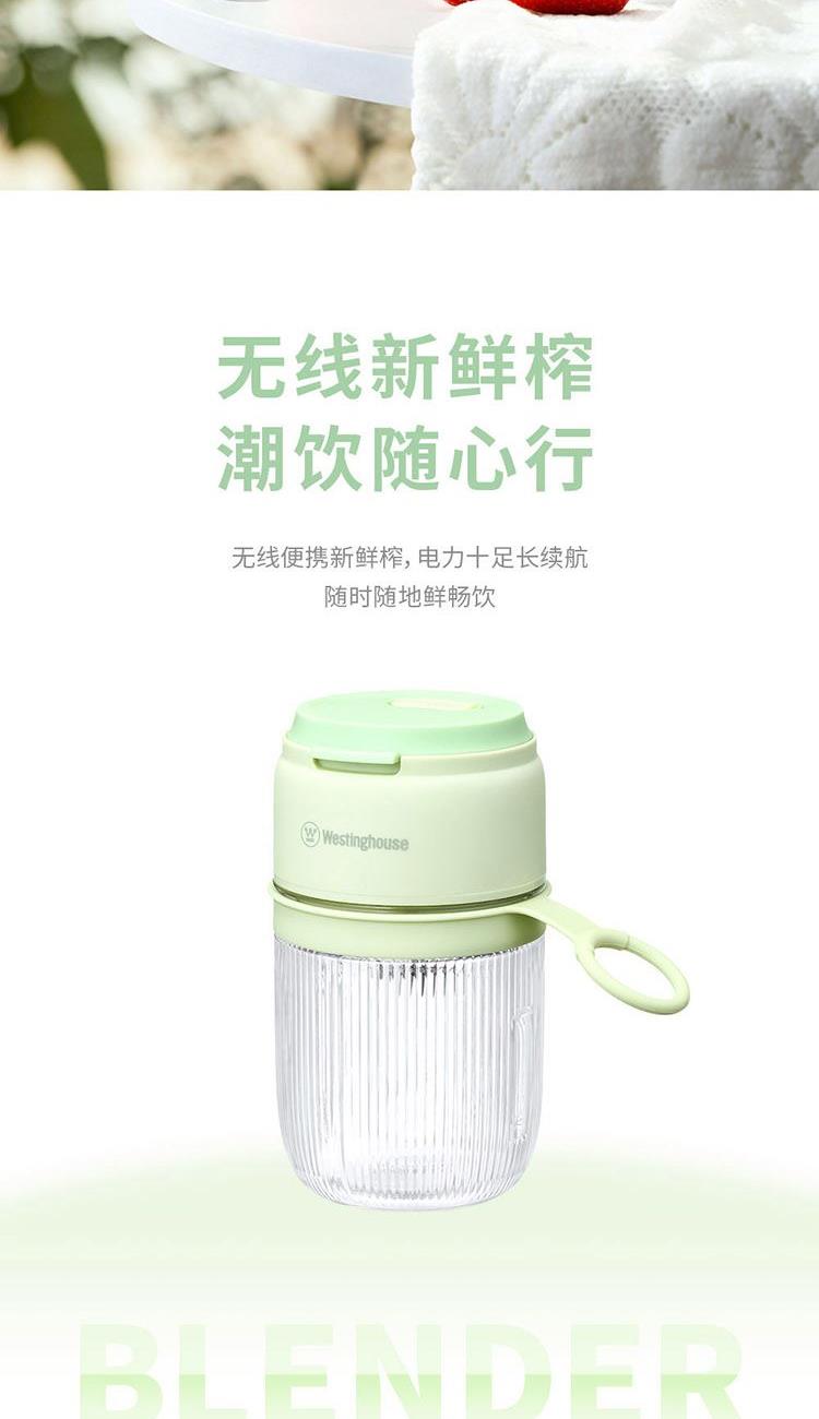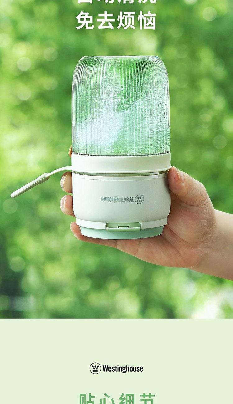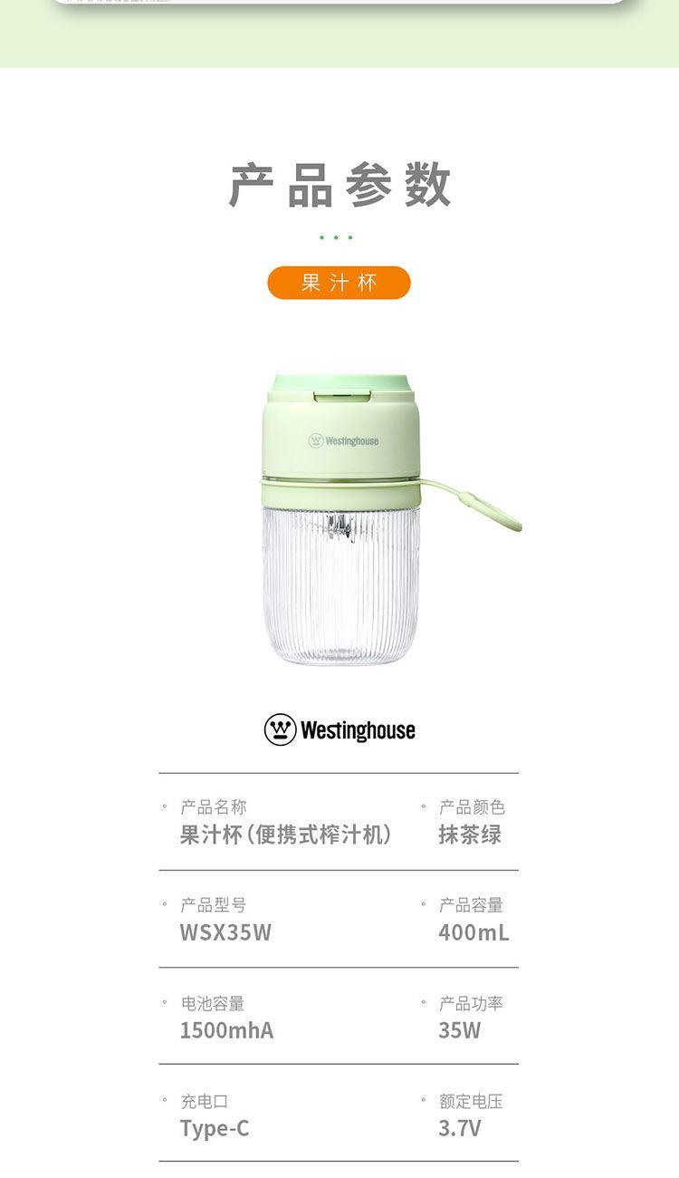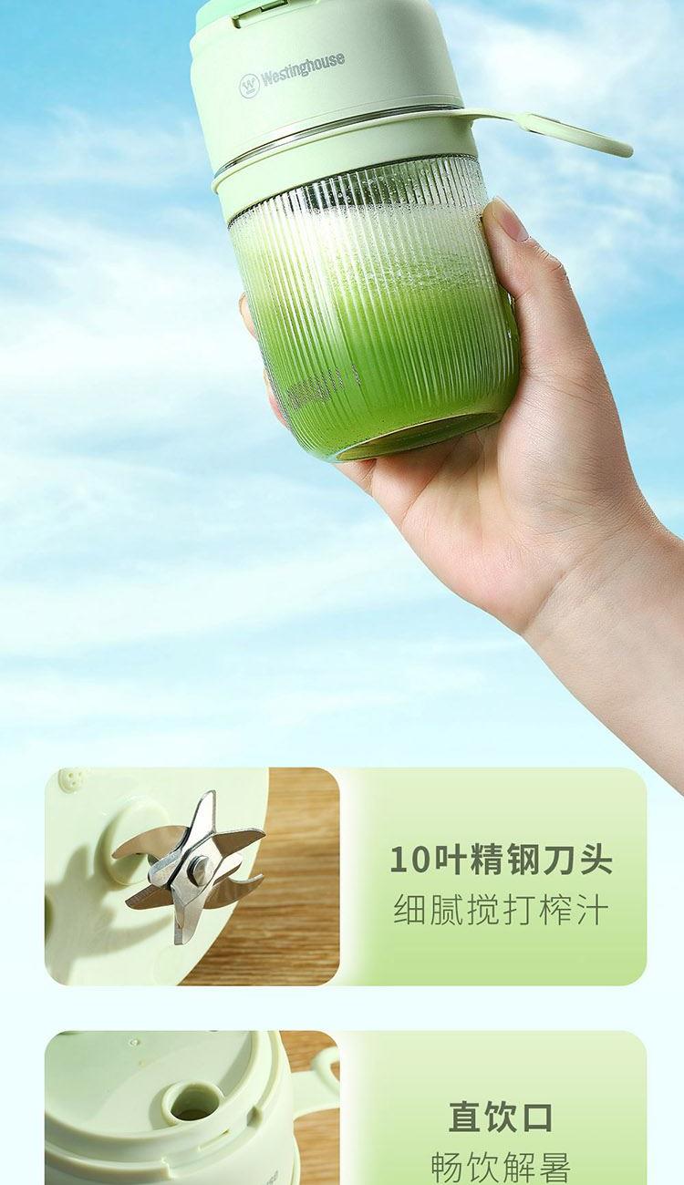产品规格: 工作电压:3.7V 工作功率:35W 杯体容量:400ml 电池容量:1500mhA 充电口:Type-c 产品颜色:抹茶绿 产品特点: 400ml私享容量,轻便小巧; 10叶304精钢刀头,快速切割; 1500mhA电池,久用长续航; Type-c充电口,随行随充,充电不受限; 双击榨汁,开盖直饮; 硅胶提手,舒适提拿。