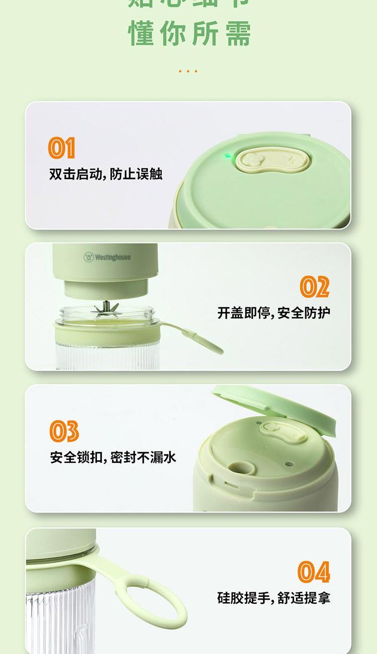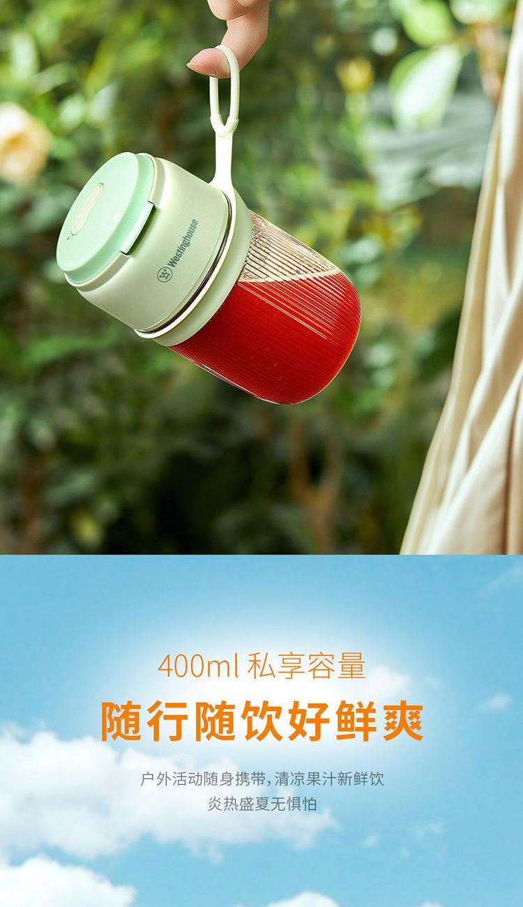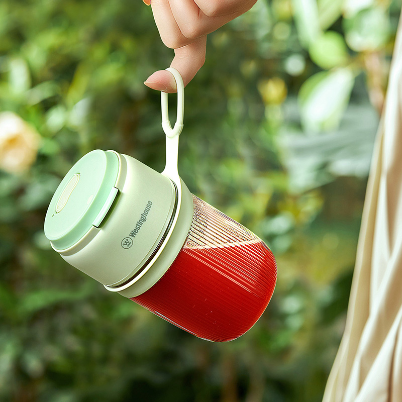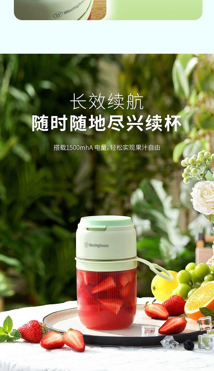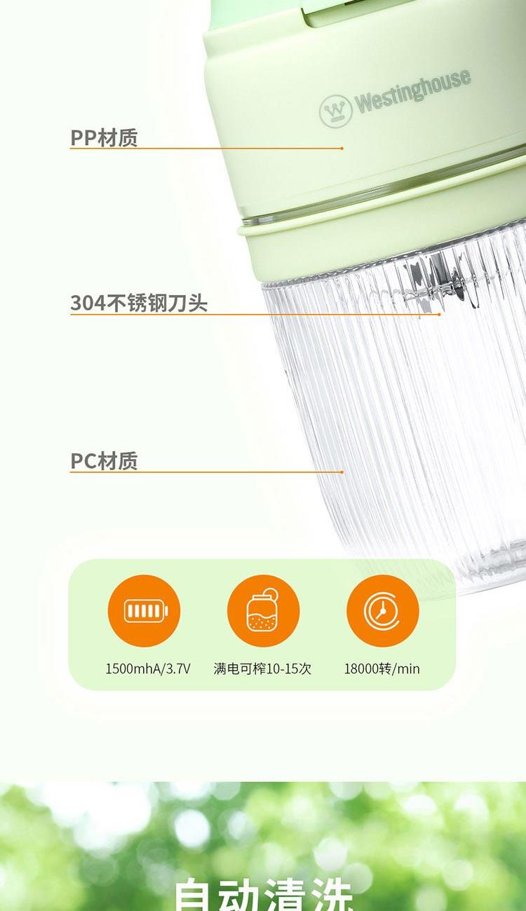产品规格: 工作电压:3.7V 工作功率:35W 杯体容量:400ml 电池容量:1500mhA 充电口:Type-c 产品颜色:抹茶绿 产品特点: 400ml私享容量,轻便小巧; 10叶304精钢刀头,快速切割; 1500mhA电池,久用长续航; Type-c充电口,随行随充,充电不受限; 双击榨汁,开盖直饮; 硅胶提手,舒适提拿。