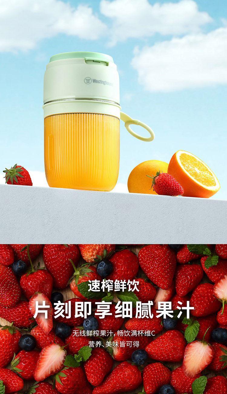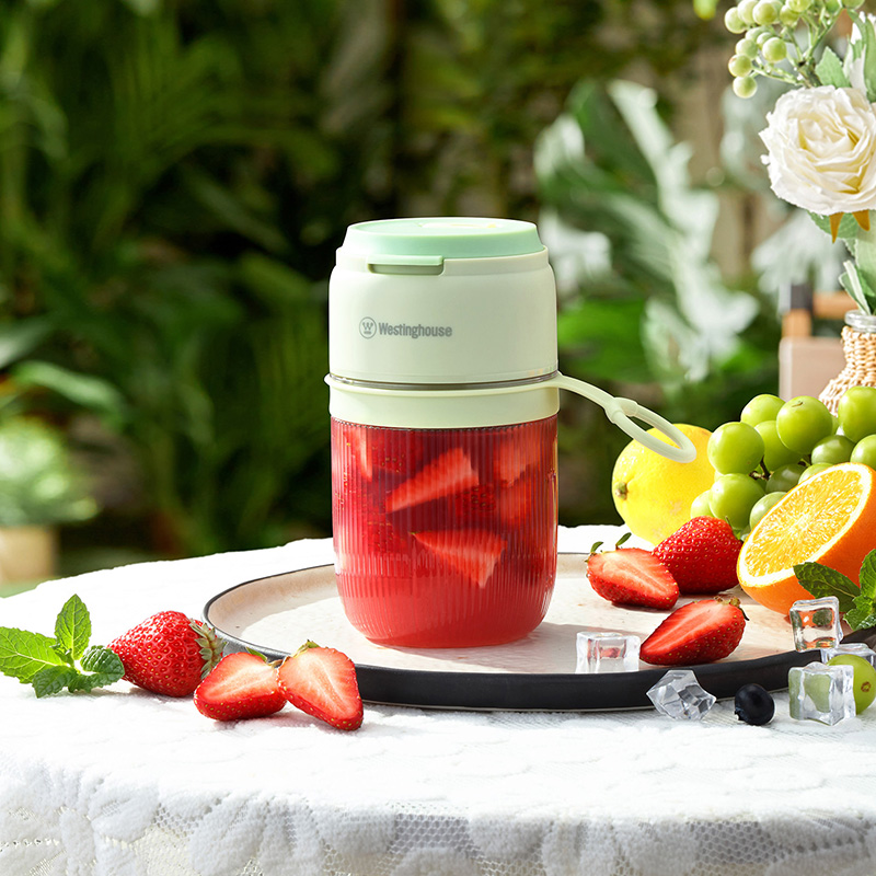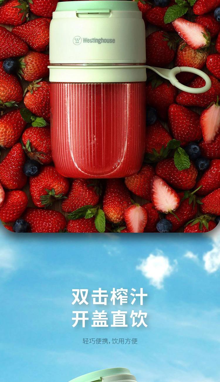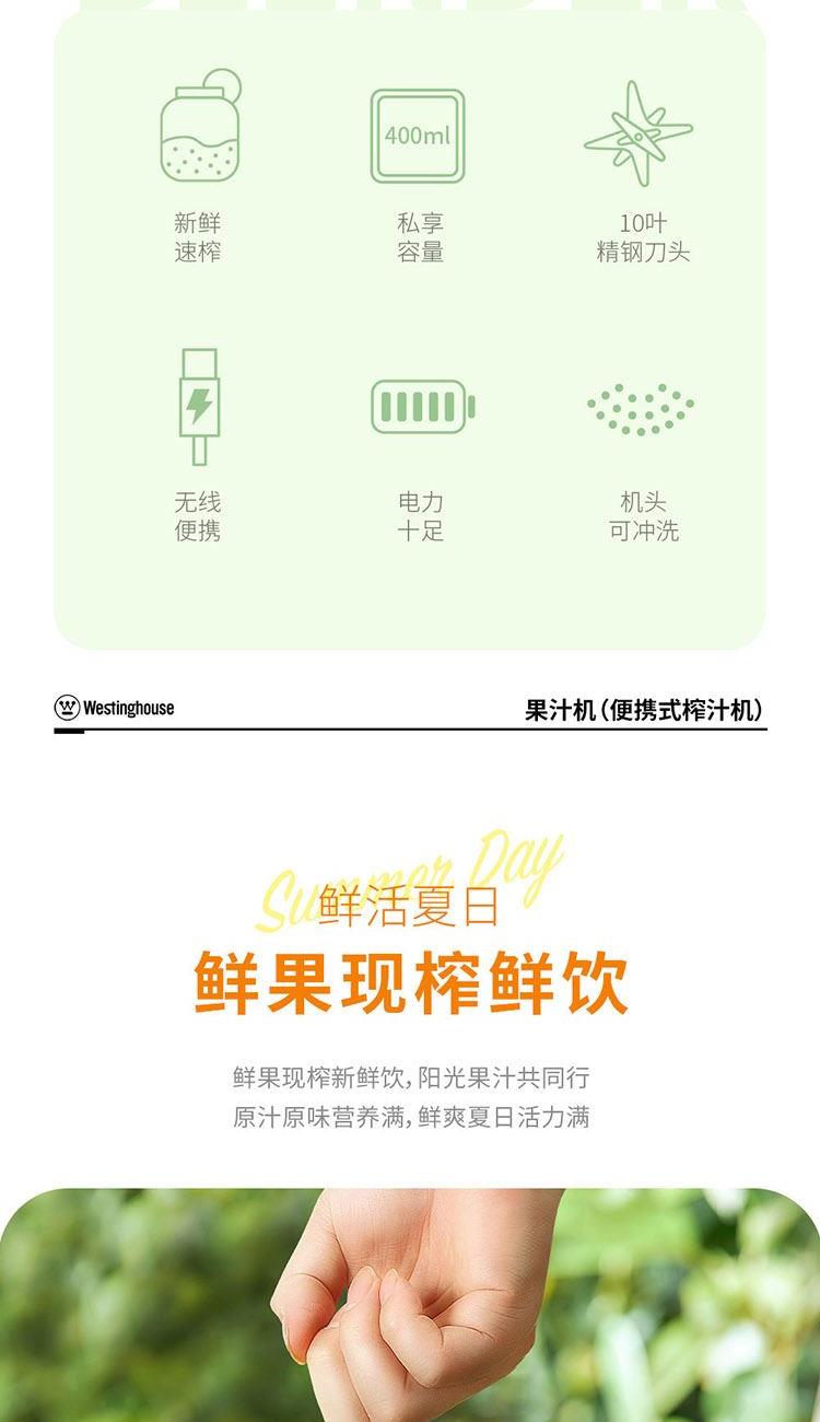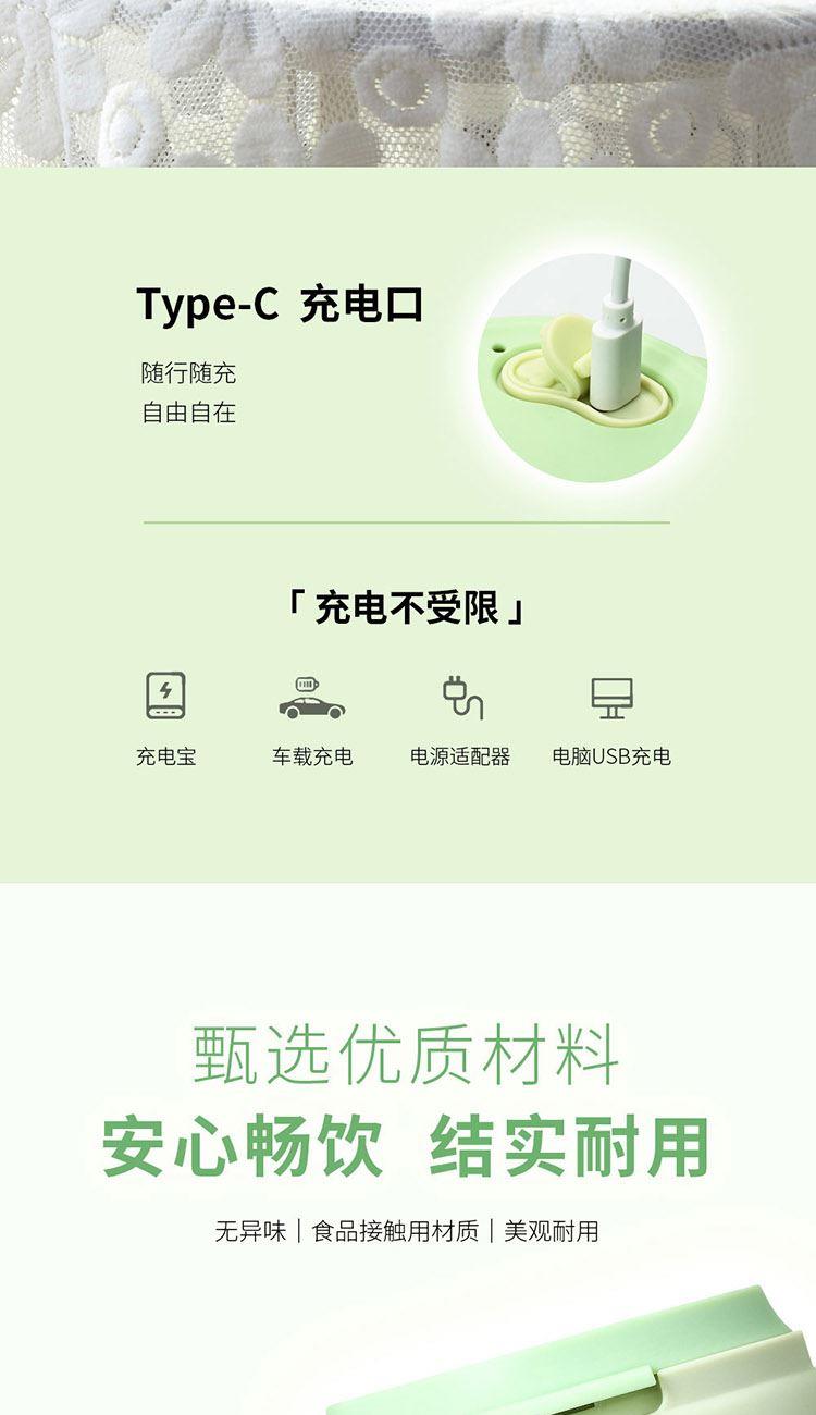 产品规格: 工作电压:3.7V 工作功率:35W 杯体容量:400ml 电池容量:1500mhA 充电口:Type-c 产品颜色:抹茶绿 产品特点: 400ml私享容量,轻便小巧; 10叶304精钢刀头,快速切割; 1500mhA电池,久用长续航; Type-c充电口,随行随充,充电不受限; 双击榨汁,开盖直饮; 硅胶提手,舒适提拿。