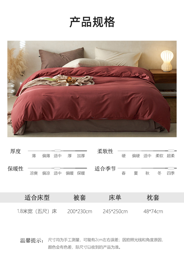 产品编码:JLY25804 产品规格:被套200*230cm 床单 245*250cm 枕套48*74cm*2 面料材质:棉(磨毛) 净 重:2.9kg 礼盒 尺寸:420*320*95mm