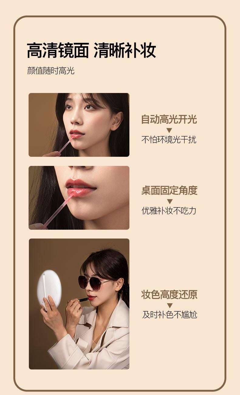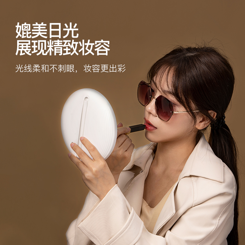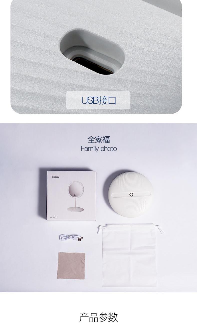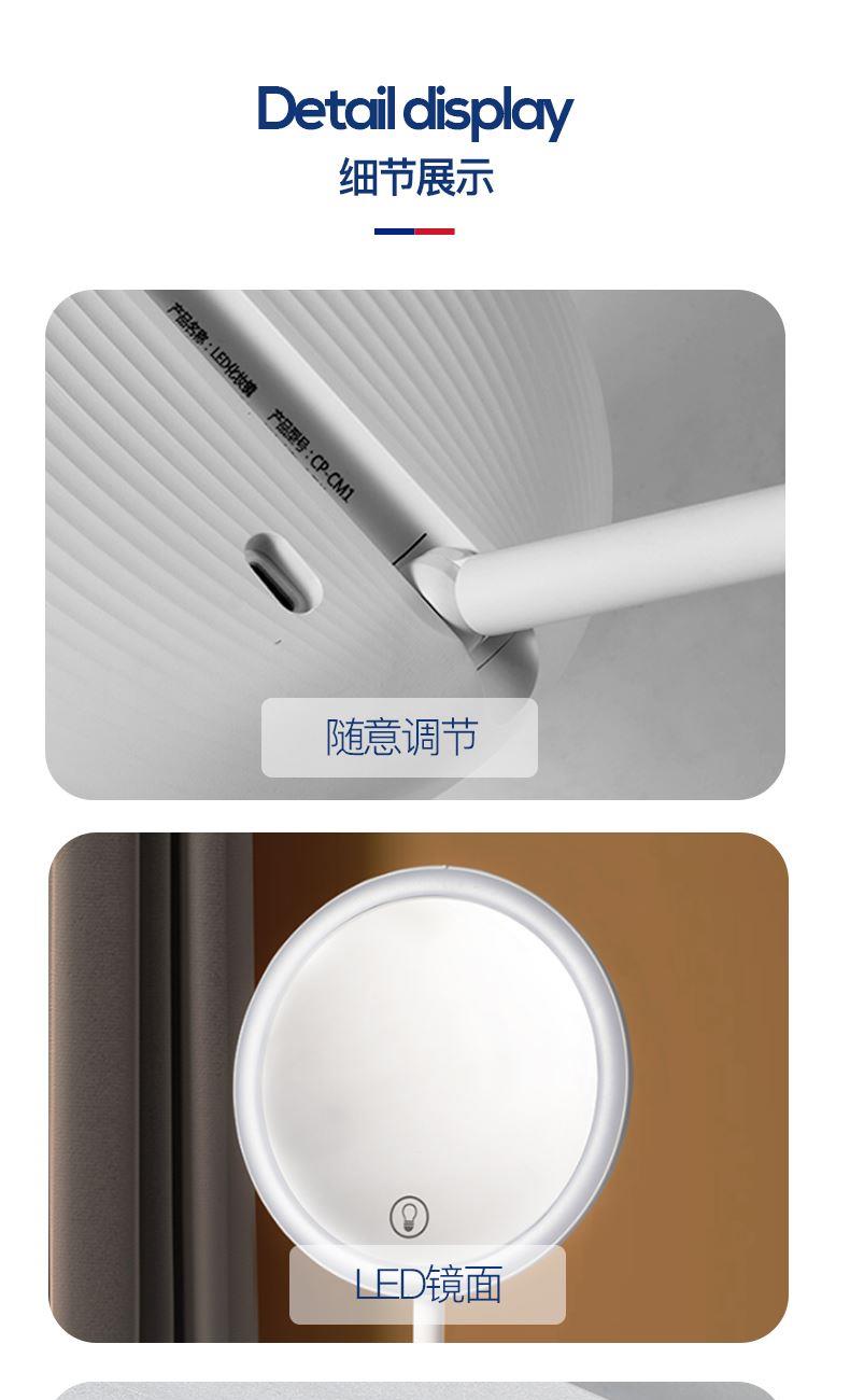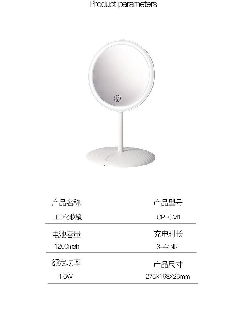 产品参数: 产品型号:CP-CM1 额定电压:3.7V⎓ 充电电压:5V⎓ 额定功率:1.5W 电池容量:1200mAh 商品条码 : 6972831860648 产品尺寸 : 275X168X25mm 包装尺寸:178X178X45mm 产品毛重 : 380g 包装清单:主机x1、充电线x1、收纳袋x1、说明书x1 核心卖点: 1、智能触控LED灯,三档亮度,可随心调节灯光亮度大小 2、轻松收纳,精致便携,随地高清还原妆容 3、LED补光化妆镜,高亮肤光,冷光模式 4、光线柔和不刺眼,妆容更出彩 5、助您呈现自信妆容,照出您的美好心情