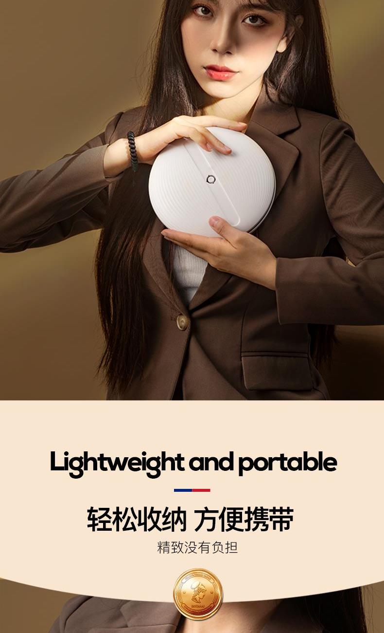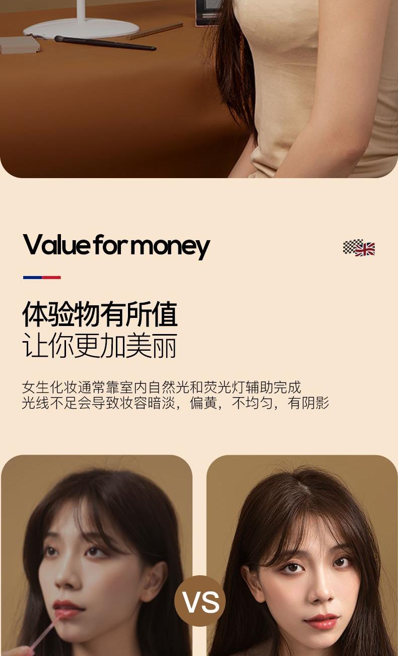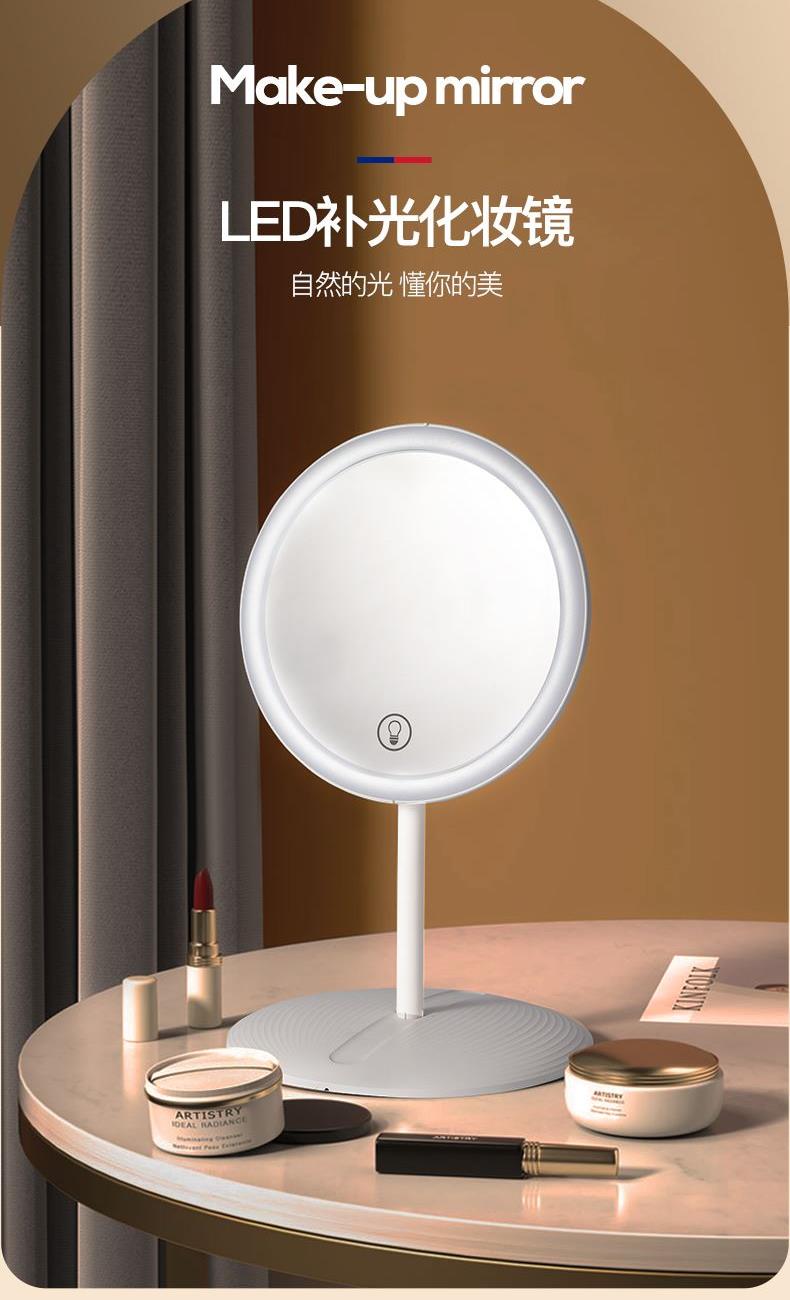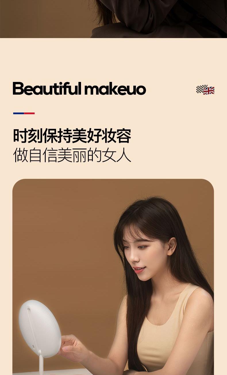 产品参数: 产品型号:CP-CM1 额定电压:3.7V⎓ 充电电压:5V⎓ 额定功率:1.5W 电池容量:1200mAh 商品条码 : 6972831860648 产品尺寸 : 275X168X25mm 包装尺寸:178X178X45mm 产品毛重 : 380g 包装清单:主机x1、充电线x1、收纳袋x1、说明书x1 核心卖点: 1、智能触控LED灯,三档亮度,可随心调节灯光亮度大小 2、轻松收纳,精致便携,随地高清还原妆容 3、LED补光化妆镜,高亮肤光,冷光模式 4、光线柔和不刺眼,妆容更出彩 5、助您呈现自信妆容,照出您的美好心情