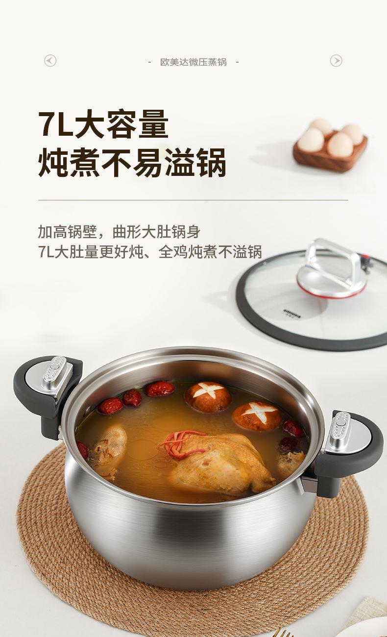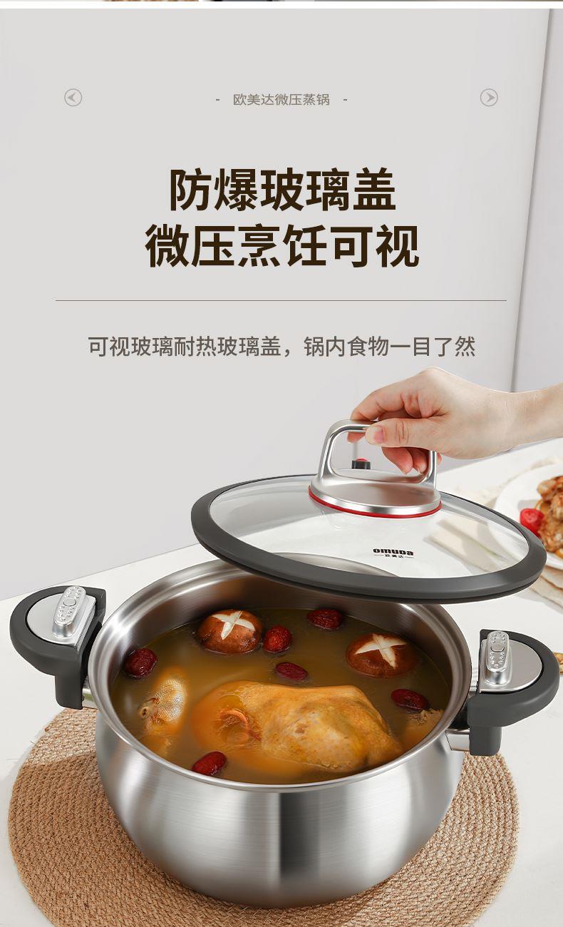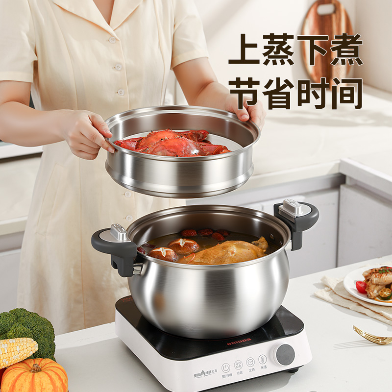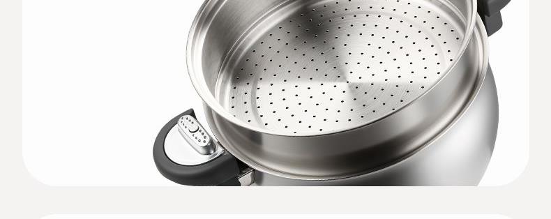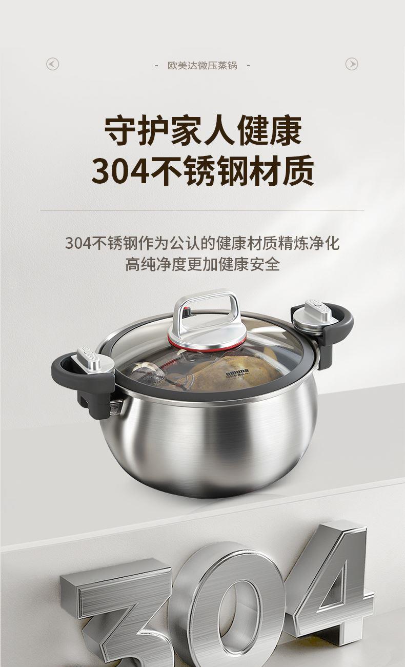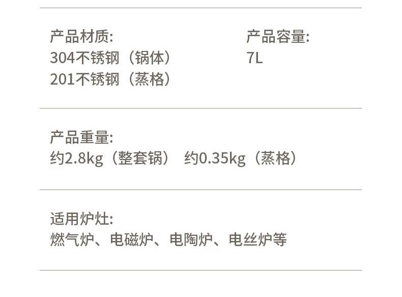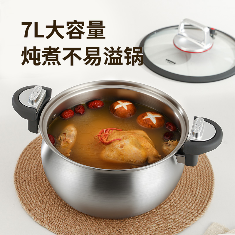 材质:304不锈钢 功能:①食品级304不锈钢,三层钢复合结构,坚固耐用,安全健康 ②微压快炖,美味快人一步 ③7L大容量,炖煮不易溢锅,搭配不锈钢蒸格,蒸煮两不误,美味一锅出 ④ 旋转式锁扣开盖,使整个锅密闭性更好,保持食材原汁原味 ⑤可视玻璃耐热玻璃盖,锅内食物一目了然 ⑥适用于任何灶具
