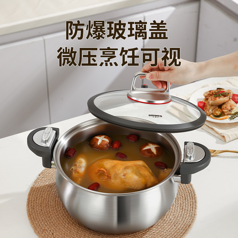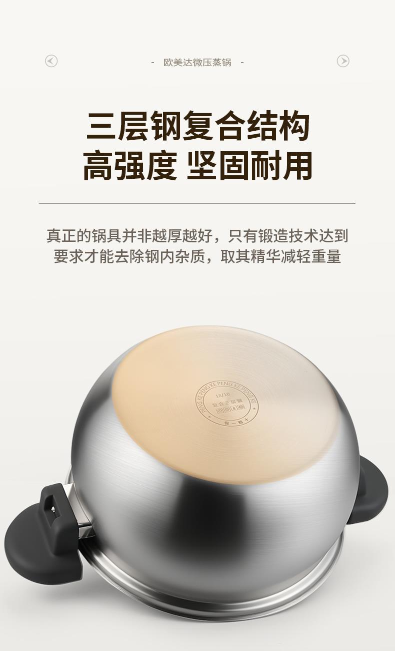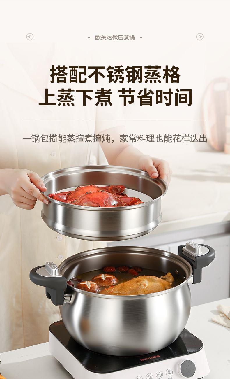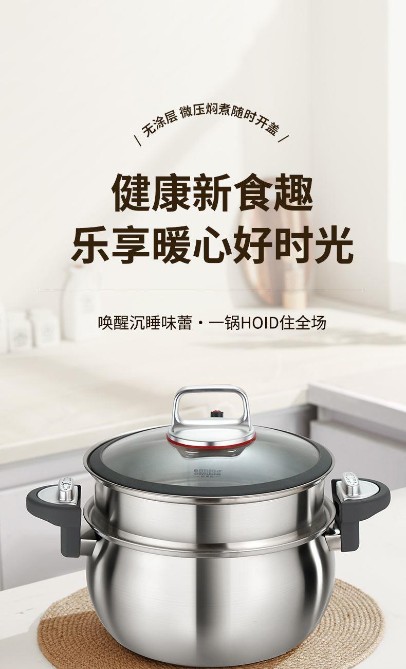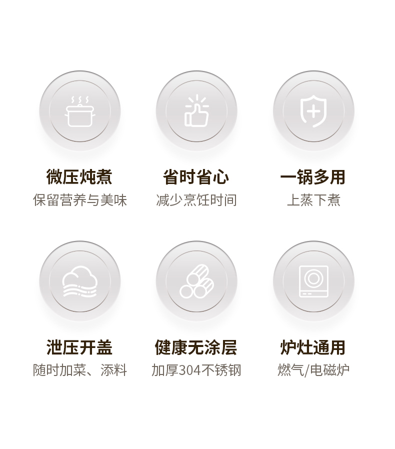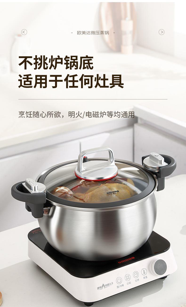 材质:304不锈钢 功能:①食品级304不锈钢,三层钢复合结构,坚固耐用,安全健康 ②微压快炖,美味快人一步 ③7L大容量,炖煮不易溢锅,搭配不锈钢蒸格,蒸煮两不误,美味一锅出 ④ 旋转式锁扣开盖,使整个锅密闭性更好,保持食材原汁原味 ⑤可视玻璃耐热玻璃盖,锅内食物一目了然 ⑥适用于任何灶具