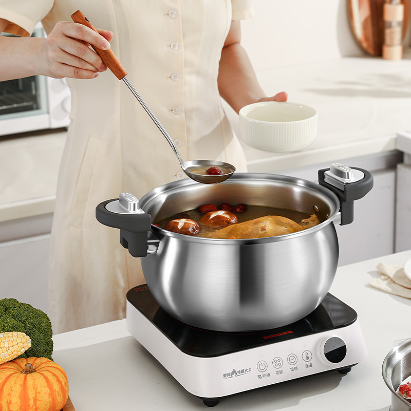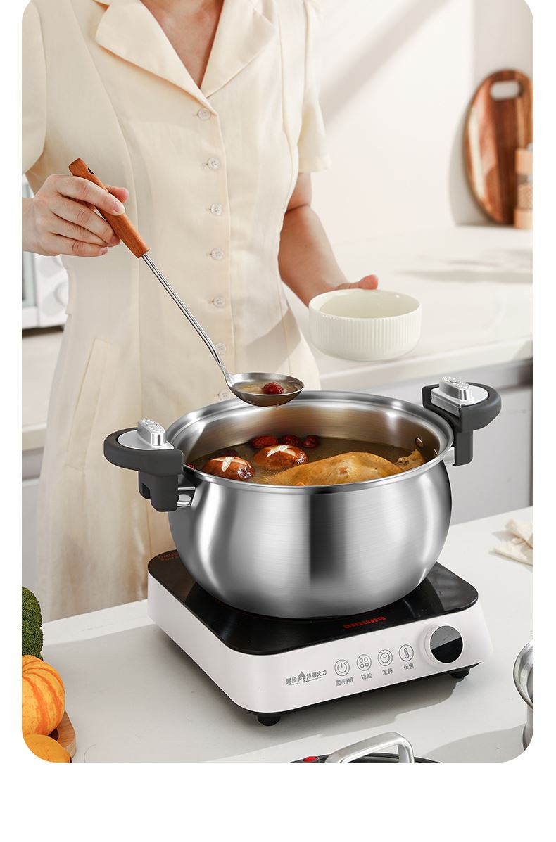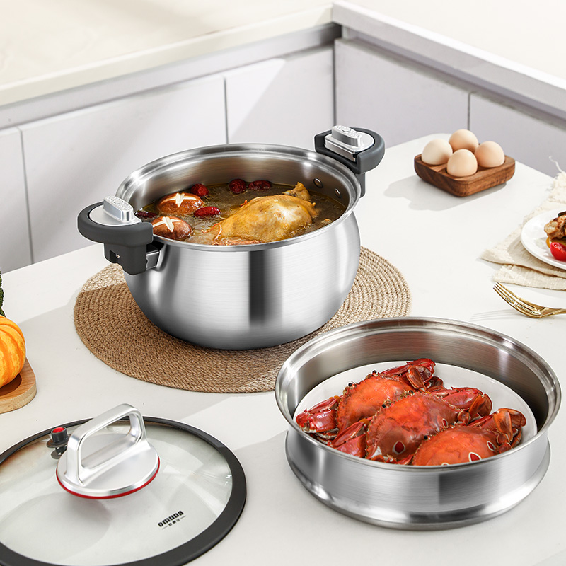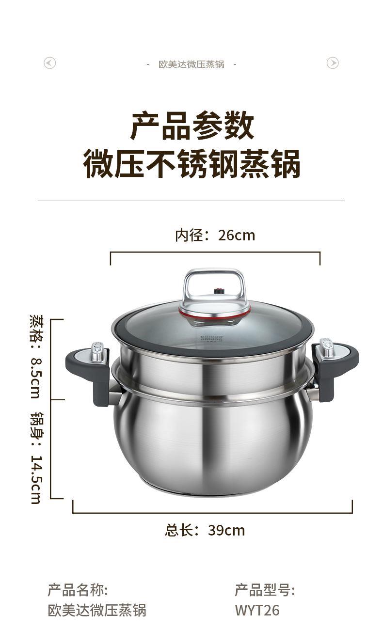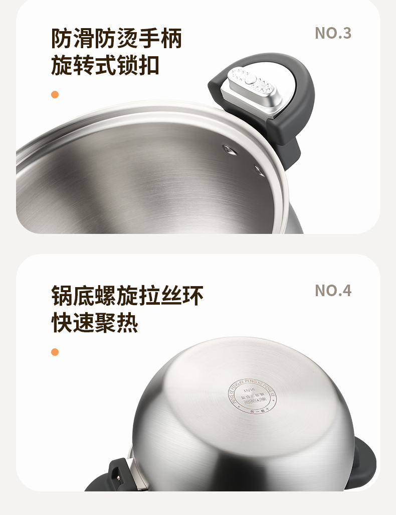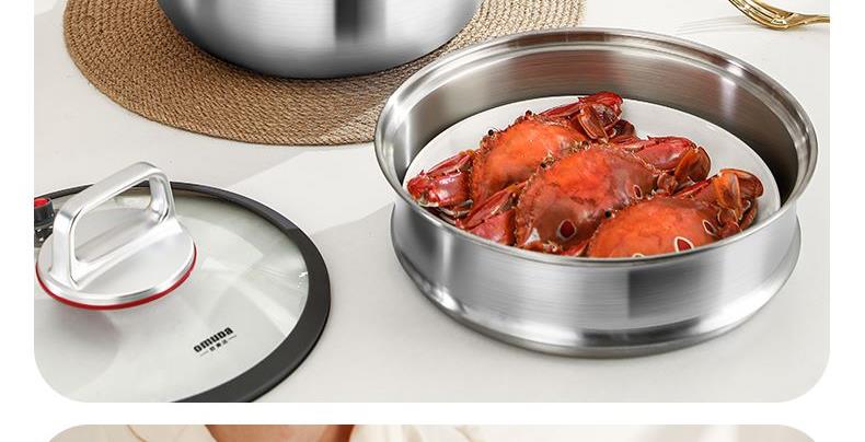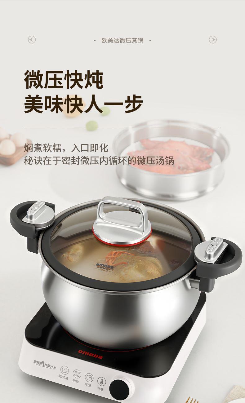 材质:304不锈钢 功能:①食品级304不锈钢,三层钢复合结构,坚固耐用,安全健康 ②微压快炖,美味快人一步 ③7L大容量,炖煮不易溢锅,搭配不锈钢蒸格,蒸煮两不误,美味一锅出 ④ 旋转式锁扣开盖,使整个锅密闭性更好,保持食材原汁原味 ⑤可视玻璃耐热玻璃盖,锅内食物一目了然 ⑥适用于任何灶具