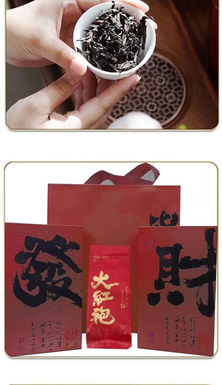 【茶名】:大红袍 【重量】:80g(10泡) 【配件】:小泡茶+礼盒+手提袋 【口味】:清香型 【产地】:福建·武夷山 大红袍产于福建武夷山,属于乌龙茶,其外形条索紧结,色泽绿褐鲜润,冲泡后汤色橙黄明亮,叶片红绿相间。大红袍的香气馥郁,具有兰花香,且“岩韵”明显,此外,大红袍的耐泡性极强,冲泡七、八次仍有香味。 大红袍的口感醇厚且甘甜,带有轻微的涩感,但回甘迅速,口腔留香持久,香气高扬,花香与果香交织,汤色橙黄明亮!