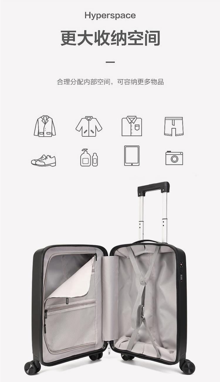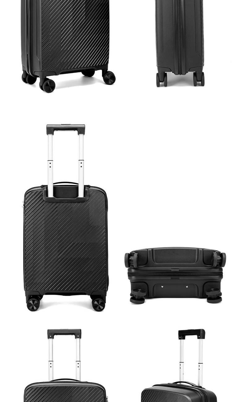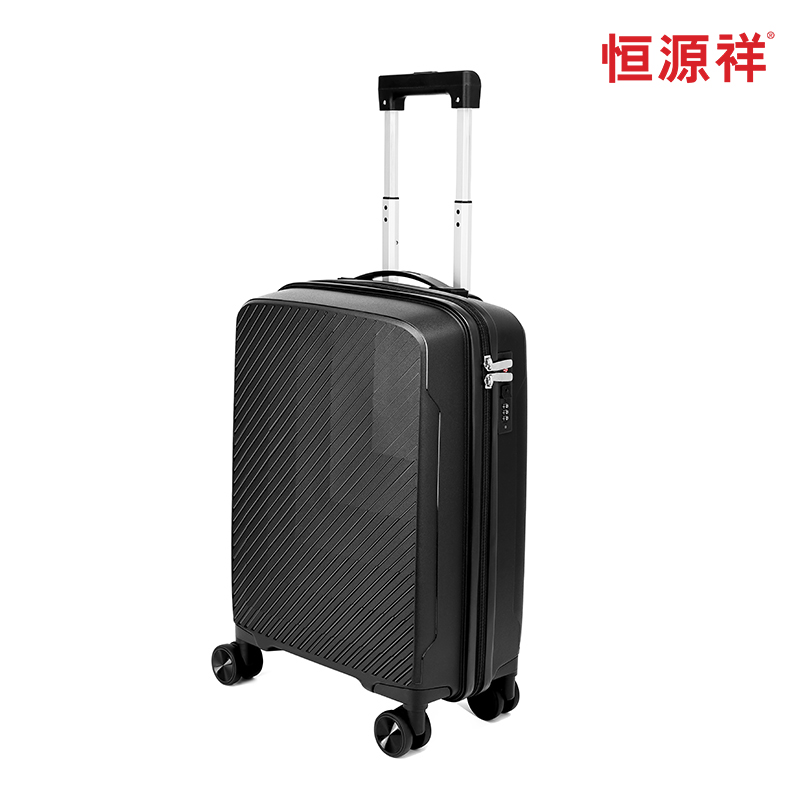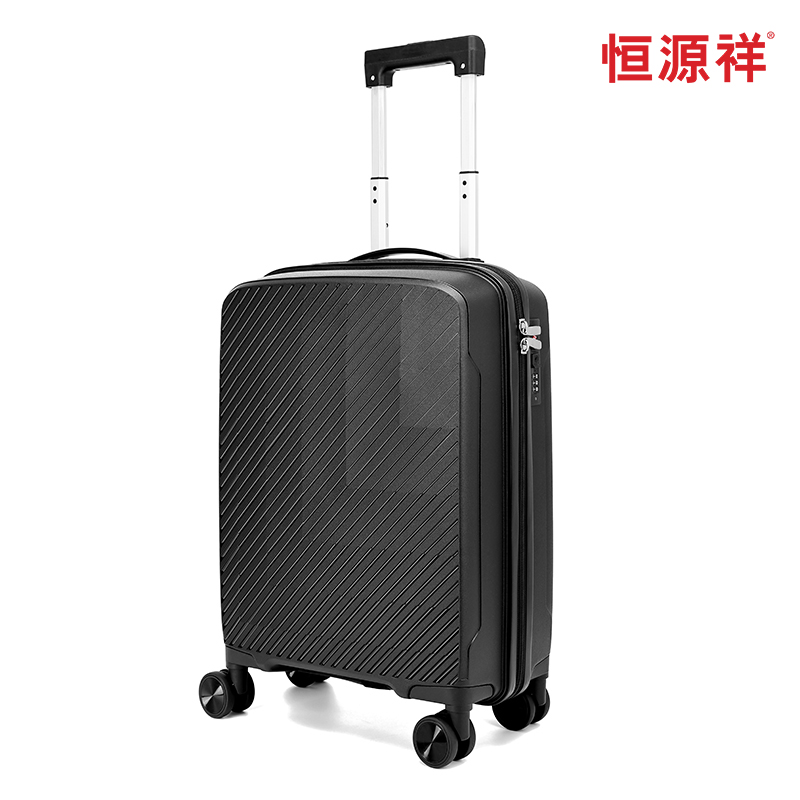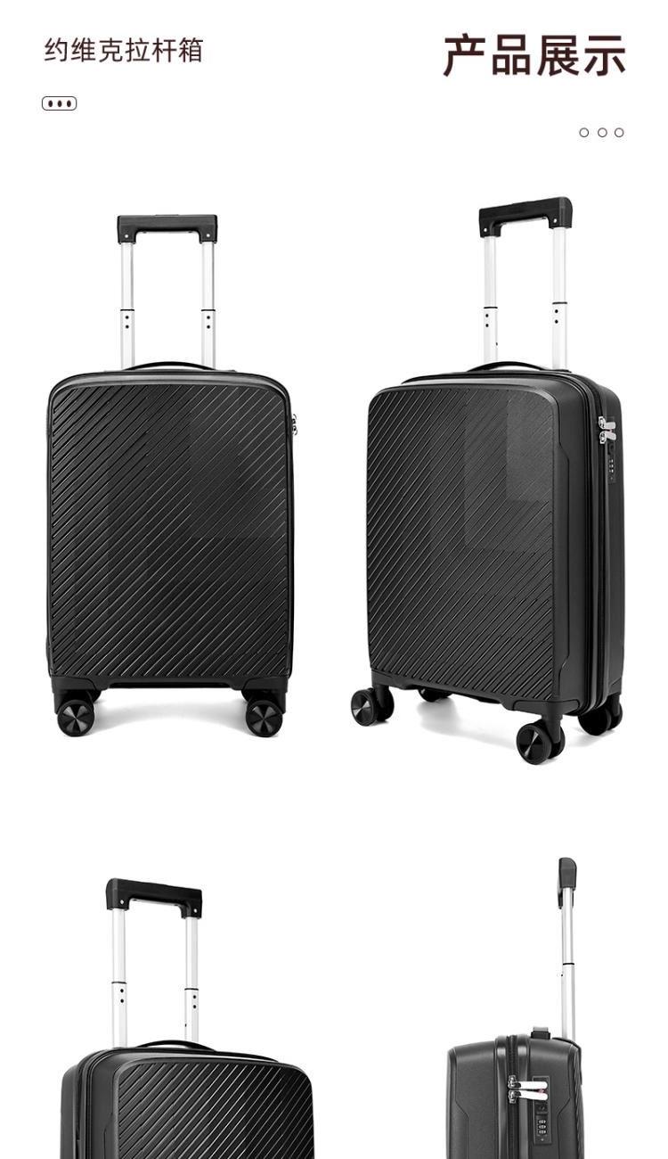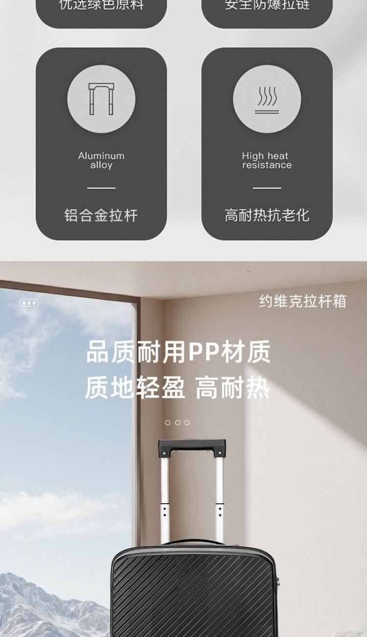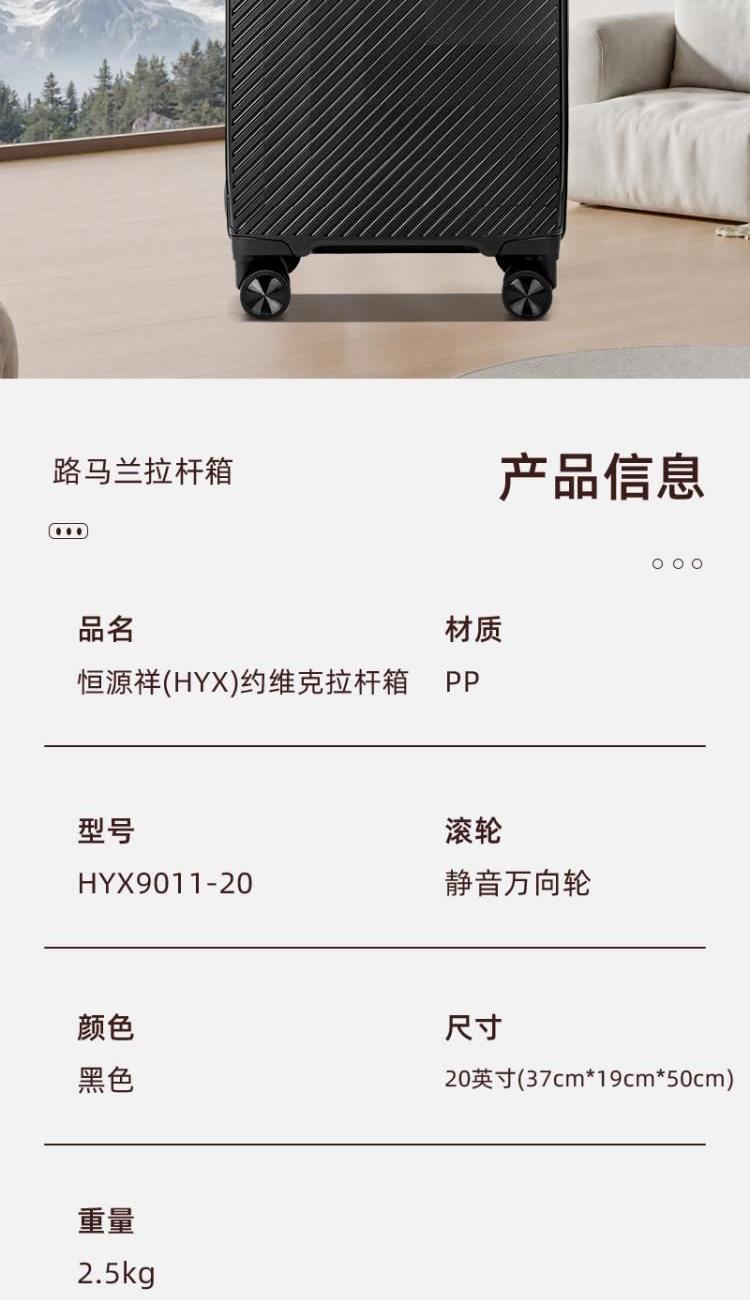 产品型号:HYX9011-20 产品重量:2.5kg 产品规格:20英寸 产品颜色:黑色 产品卖点:PP材质,结晶度高,拉杆箱表面更加强硬,可以有效的防止磕碰造成划痕,而且耐冲击和防水性好; 全配色耐磨万向静音轮,运用跑车车轮的设计原理,采用静音材质包裹,360度自由旋转,降噪减震灵动自如,耐磨高弹性TPE材料,触感柔软,负重与减震能力俱佳; 全铝合金拉杆,航空铝材,美观耐用。