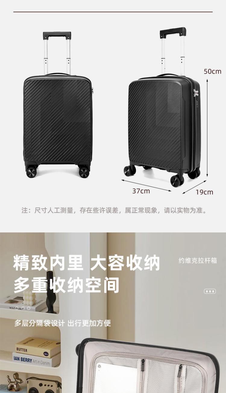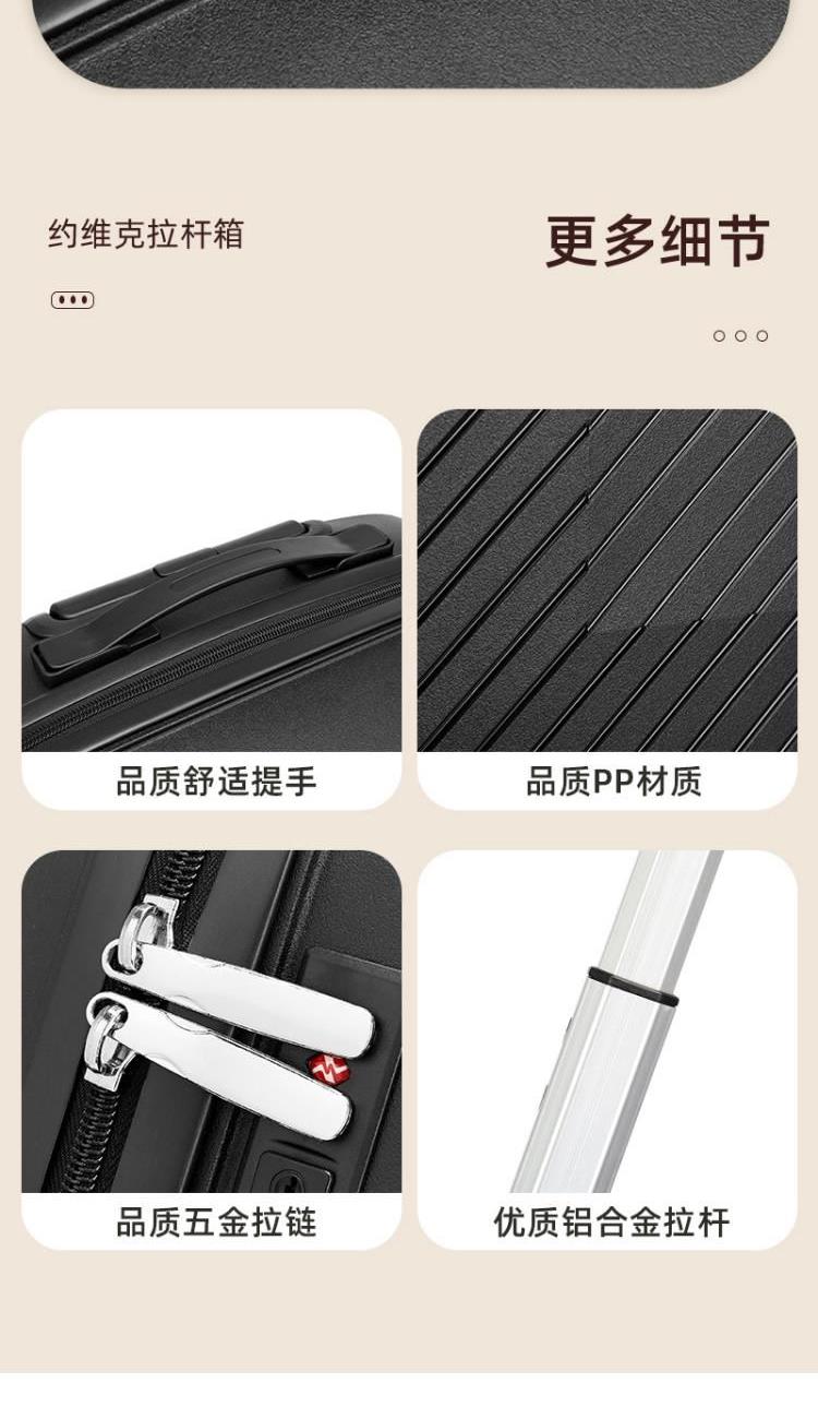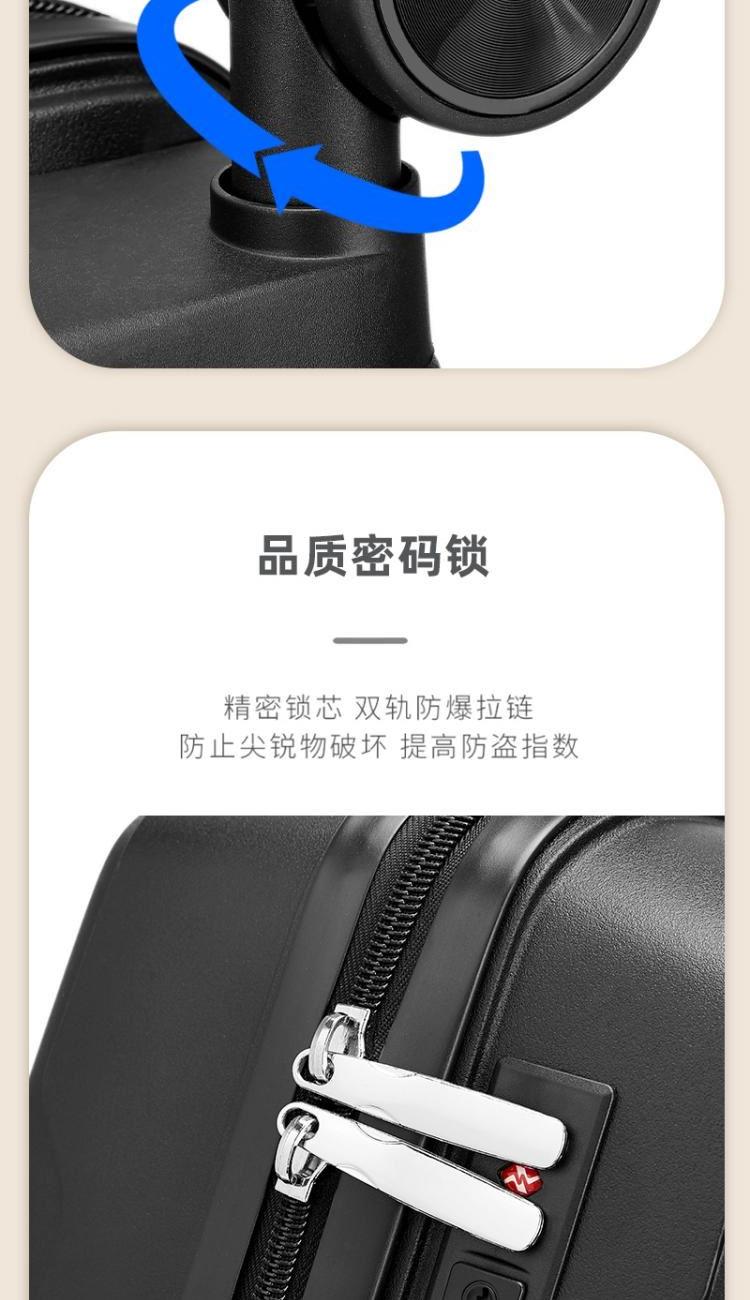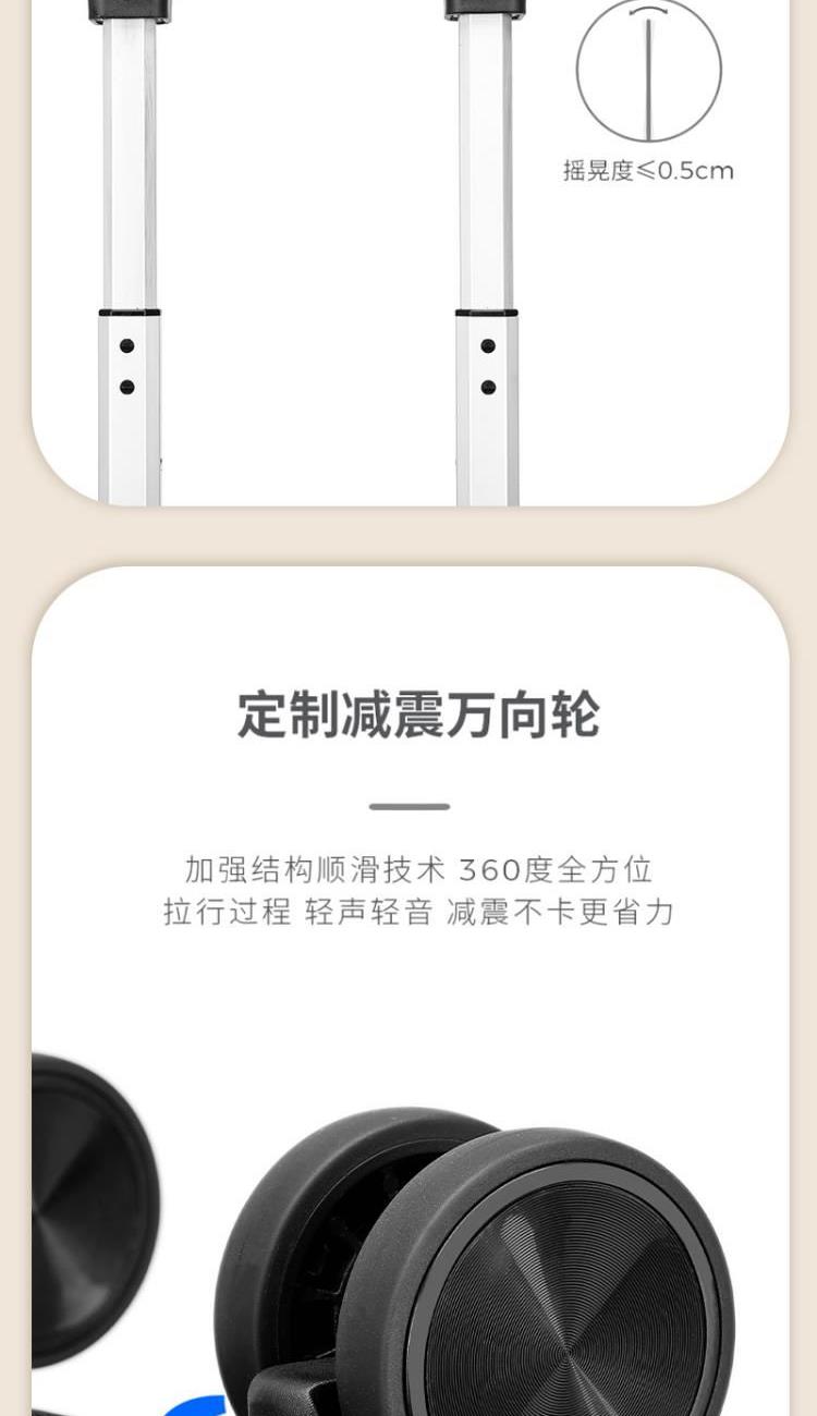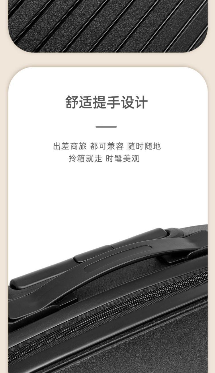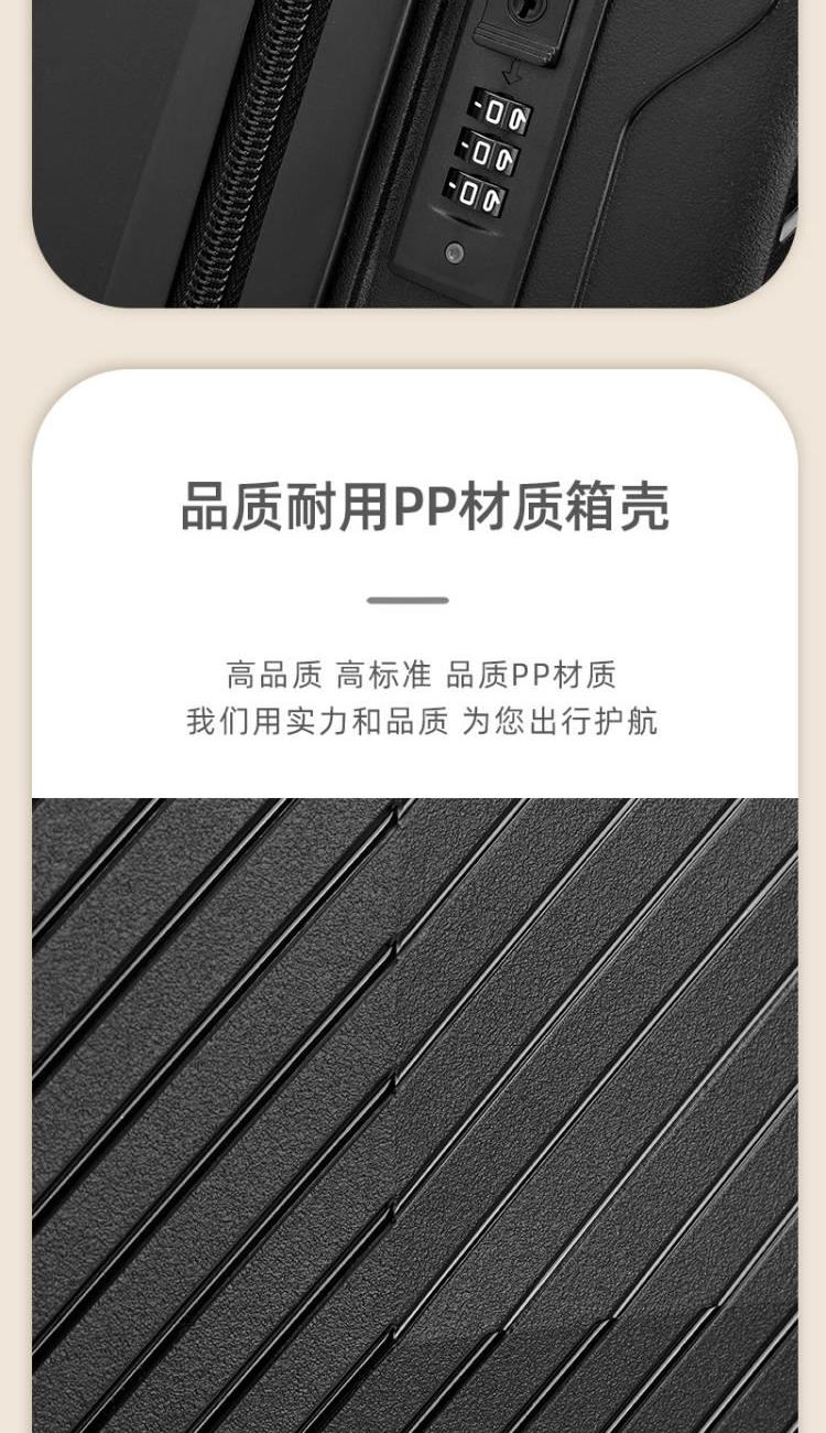 产品型号:HYX9011-20 产品重量:2.5kg 产品规格:20英寸 产品颜色:黑色 产品卖点:PP材质,结晶度高,拉杆箱表面更加强硬,可以有效的防止磕碰造成划痕,而且耐冲击和防水性好; 全配色耐磨万向静音轮,运用跑车车轮的设计原理,采用静音材质包裹,360度自由旋转,降噪减震灵动自如,耐磨高弹性TPE材料,触感柔软,负重与减震能力俱佳; 全铝合金拉杆,航空铝材,美观耐用。