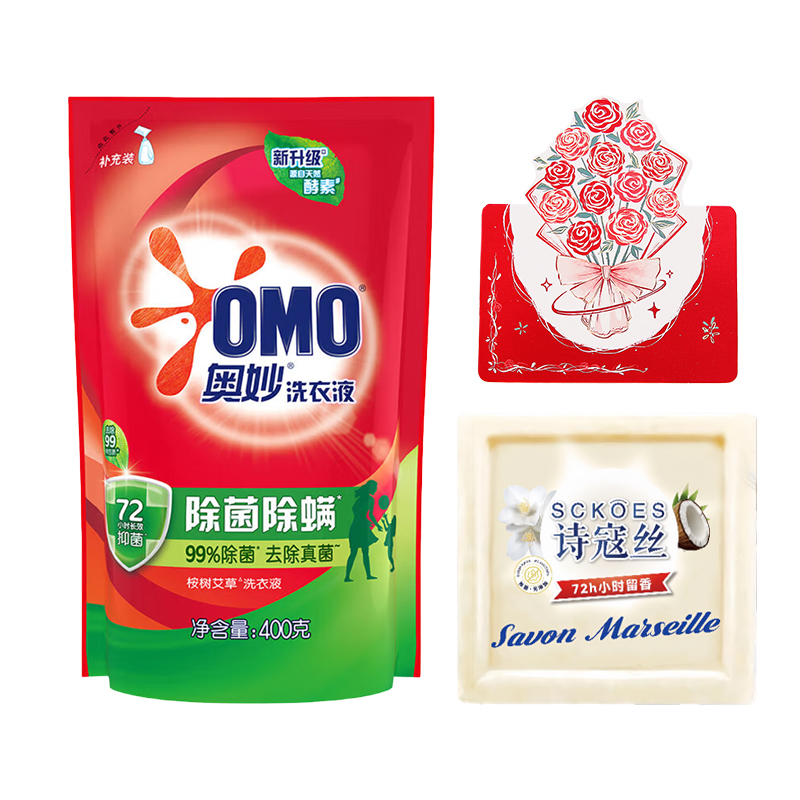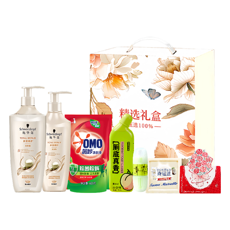 1. 施华蔻多效修护洗发露600ml 2. 施华蔻多效修护润发乳400ml 3. Sckoes诗寇丝 皂310g 4. 小仓熊香氛洁厕液(蜜桃香)450g 5. 小仓熊马桶挂篮-(单个装)50g 6. 奥妙洗衣液400g 7. 立体玫瑰花贺卡(赠) 8. 精选精美礼盒-LH006