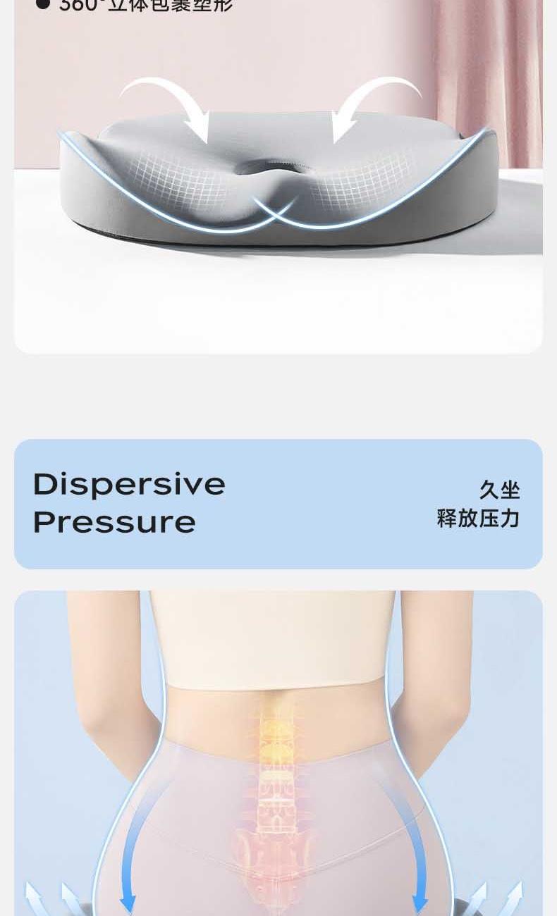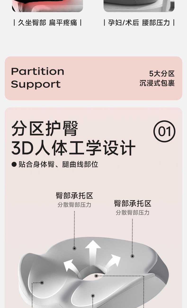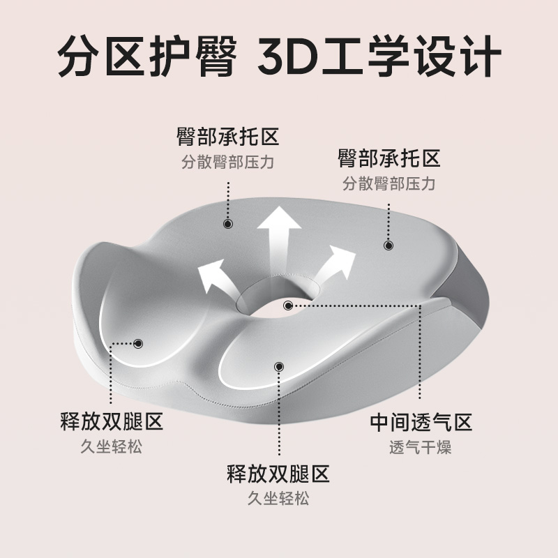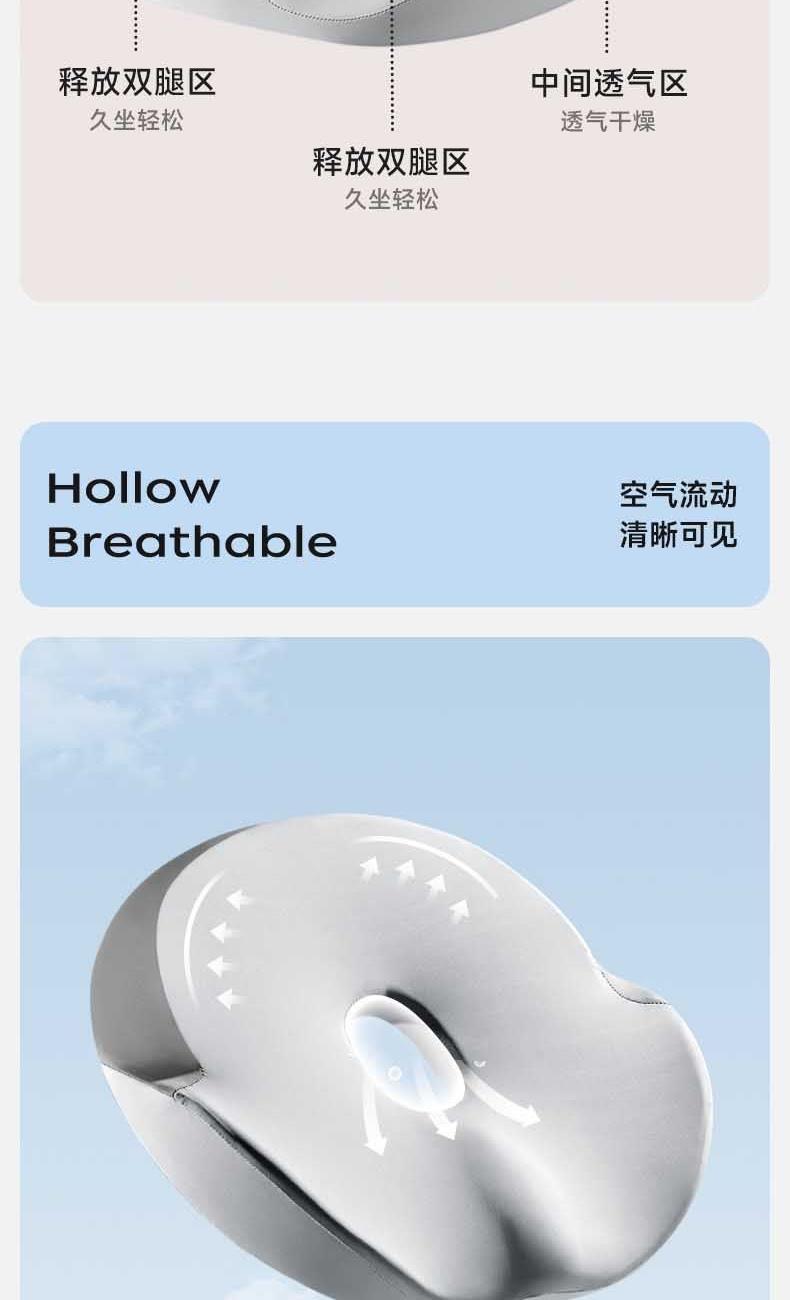 【人体工学曲线】凹凸曲线,塑造臀型,享受美臀SPA。 【巴斯夫记忆棉】内外兼修,软到「芯」里。 【5大分区】沉浸式包裹,久坐舒适。 【中空透气】大圈孔设计,循环透气不湿热。