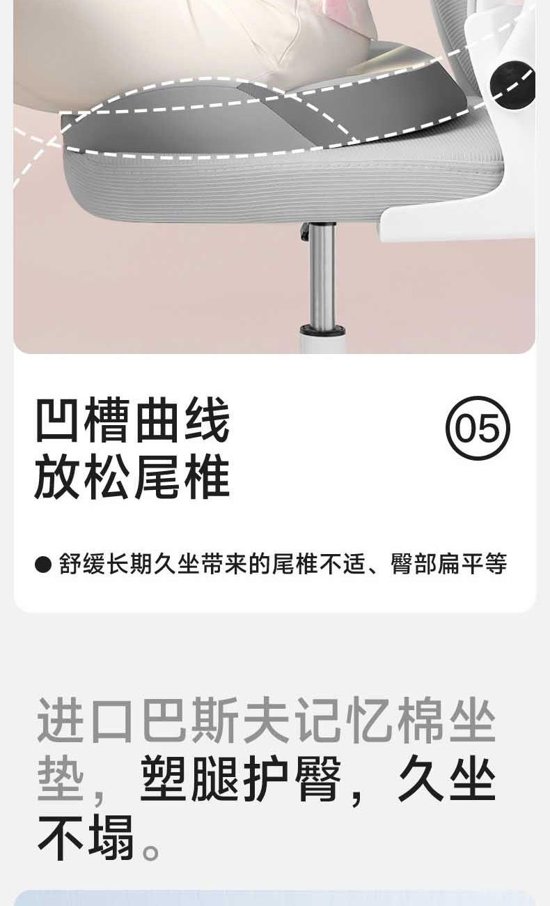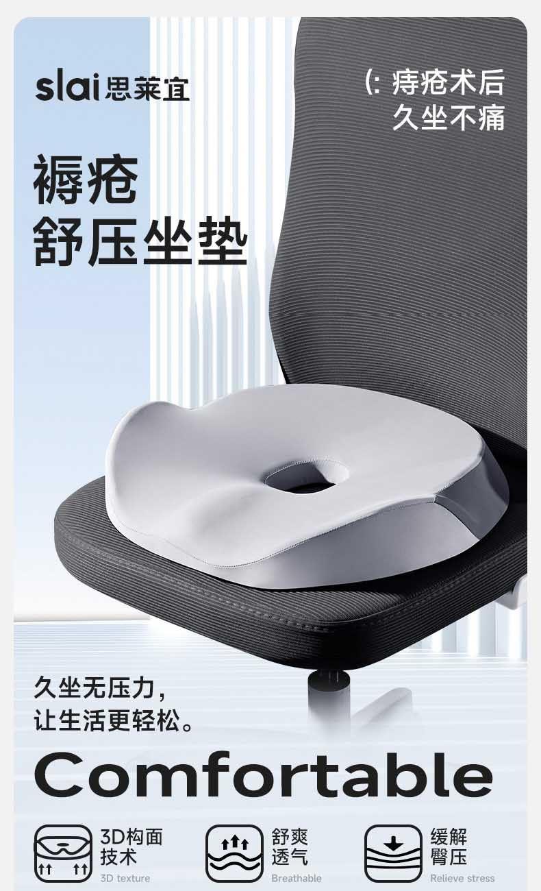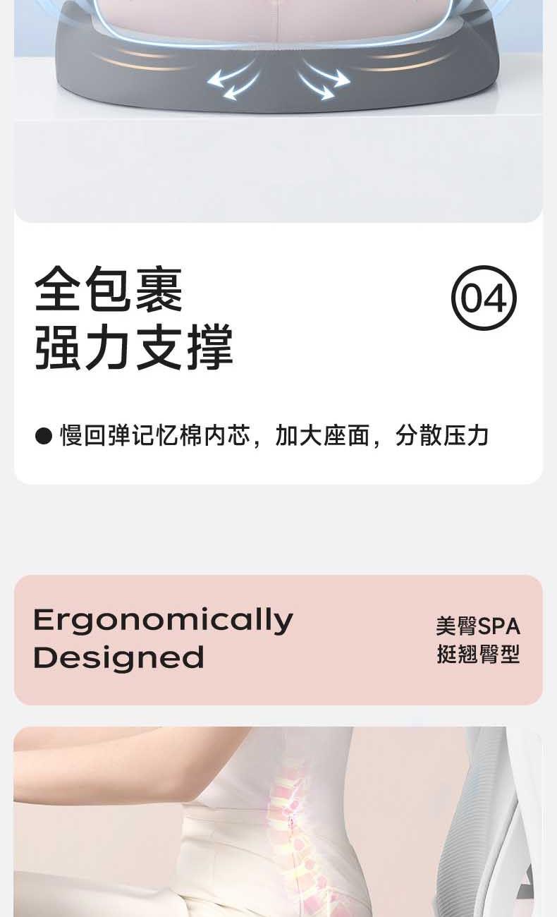 【人体工学曲线】凹凸曲线,塑造臀型,享受美臀SPA。 【巴斯夫记忆棉】内外兼修,软到「芯」里。 【5大分区】沉浸式包裹,久坐舒适。 【中空透气】大圈孔设计,循环透气不湿热。