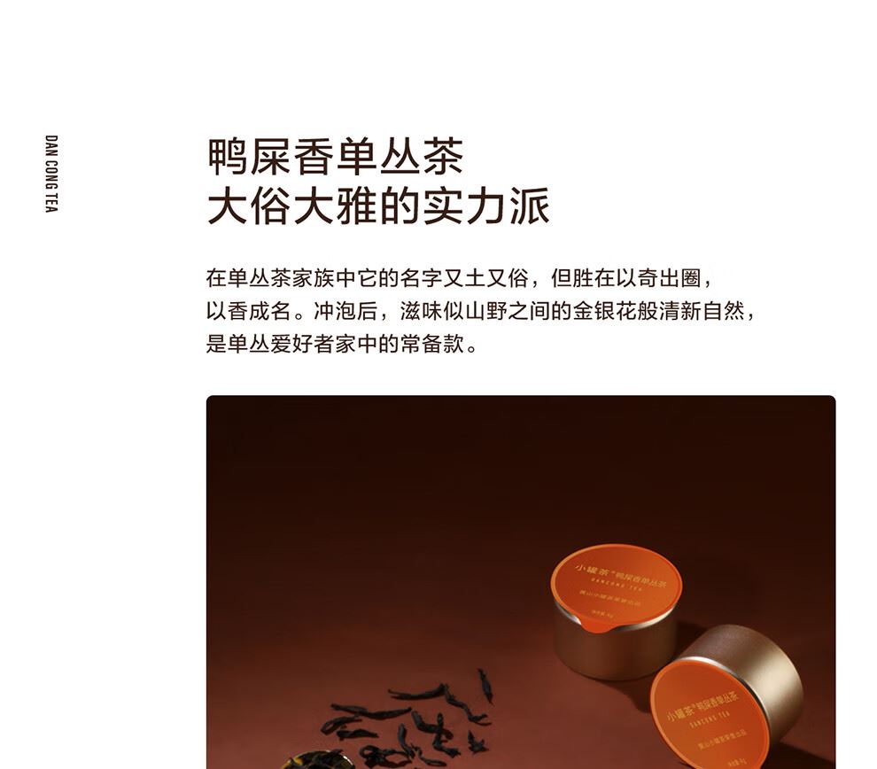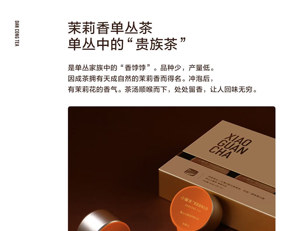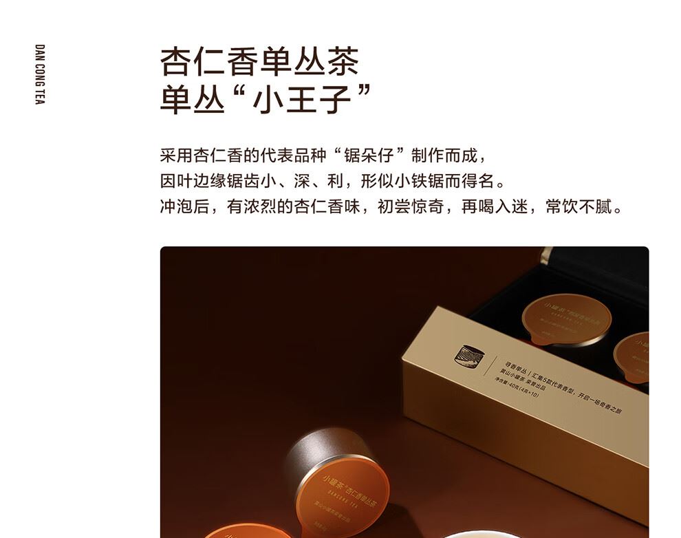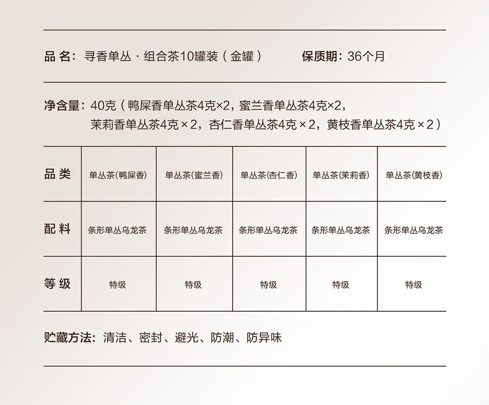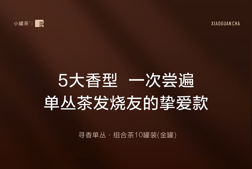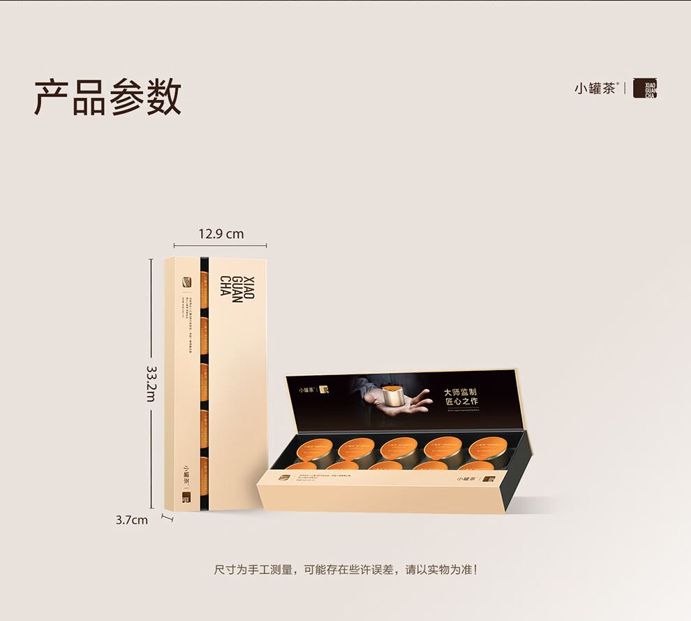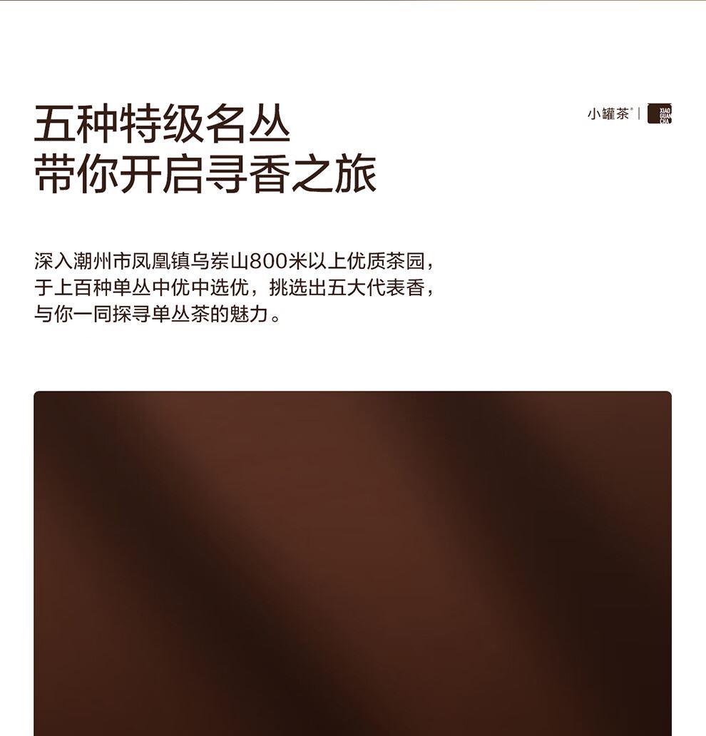 轻奢商务茶叶pin牌-小罐茶(敢保真) 小罐茶全国线下2000+实体门店 小罐茶 x 敢保真(产地保真、年份保真、安全保真) 轻奢档次商务送礼就送小罐茶 5大香型 一次尝遍 单丛茶发烧友的挚爱款 寻香单丛·组合茶10罐装(金罐) 等级:特级 礼盒尺寸:33.2*3.7*12.9cm 净含量:40克(鸭屎香单丛茶4克x2,蜜兰香单丛茶4克x2,茉莉香单丛茶4克x2,杏仁香单丛茶4克x2,黄枝香单丛茶4克x2) 五种特级名丛 带你开启寻香之旅 5味单丛集锦 满足不同口感喜好 - 让舌尖懂茶 是好茶的责任 以经典之茗 尽享精致好礼 精致礼盒包装,送礼体面彰显尊贵。10罐独立包装,传递十全十美的祝福。一饮一罐,定量封装,手不沾茶,更显品位;一盒满足礼赠贵宾、商务会面、重要答谢等需求。