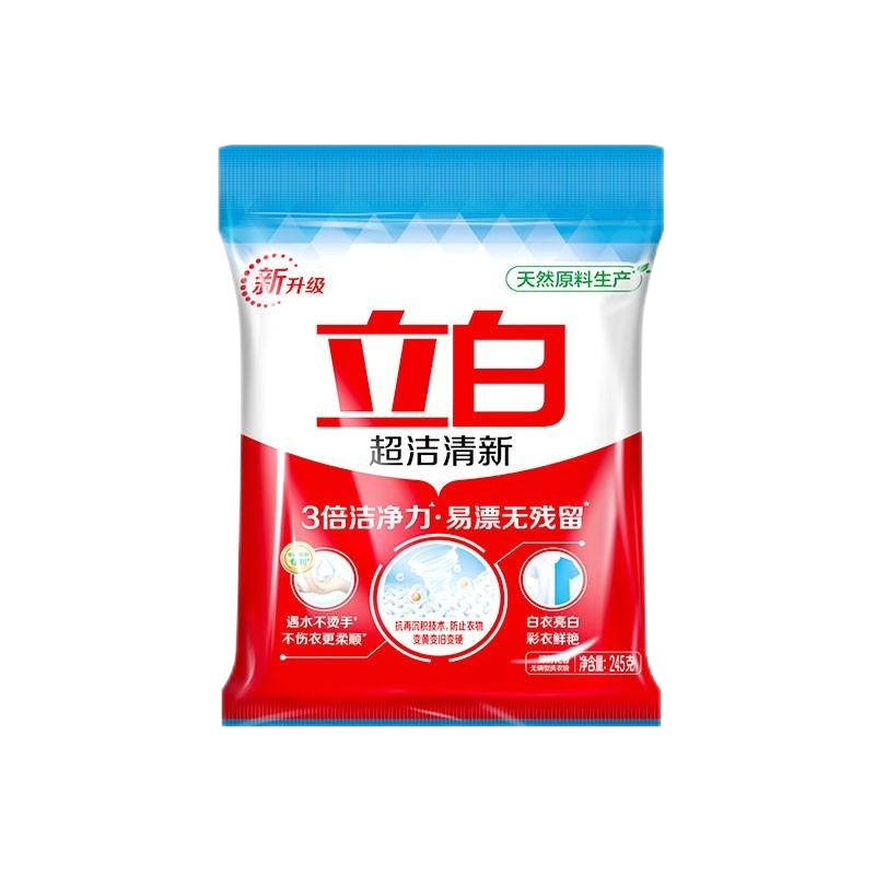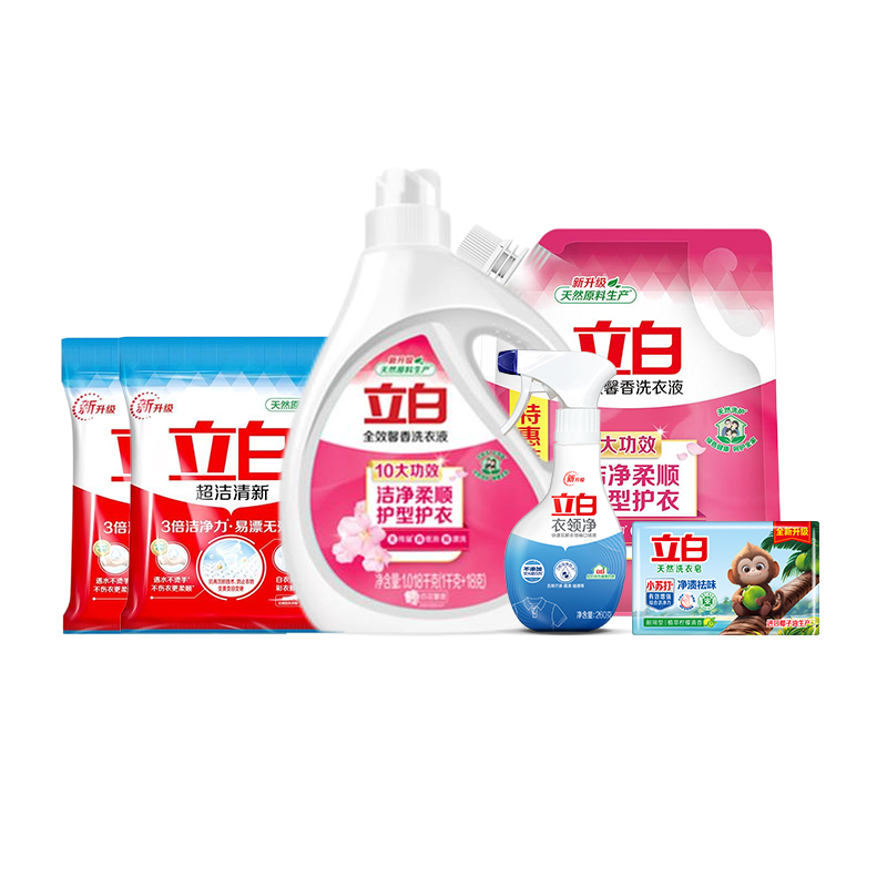 配置: 立白全效馨香洗衣液每瓶加量18克1.018千克*1瓶 立白全效馨香洗衣液900g*1袋 立白衣领净260g*1瓶 立白超洁清新无磷洗衣粉245g*2袋 立白天 然洗衣皂(植萃柠檬清香) 200g*1块 卖点: 可选产品丰富多样,礼箱随心组合,多种价位因需而定,充分满足各种送礼需求,是商务送礼、单位福利的用心之选。