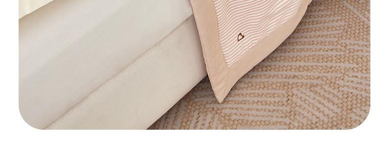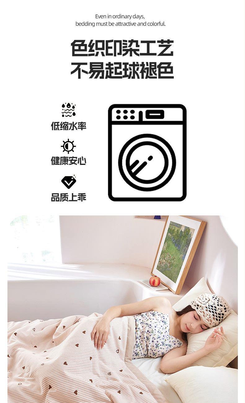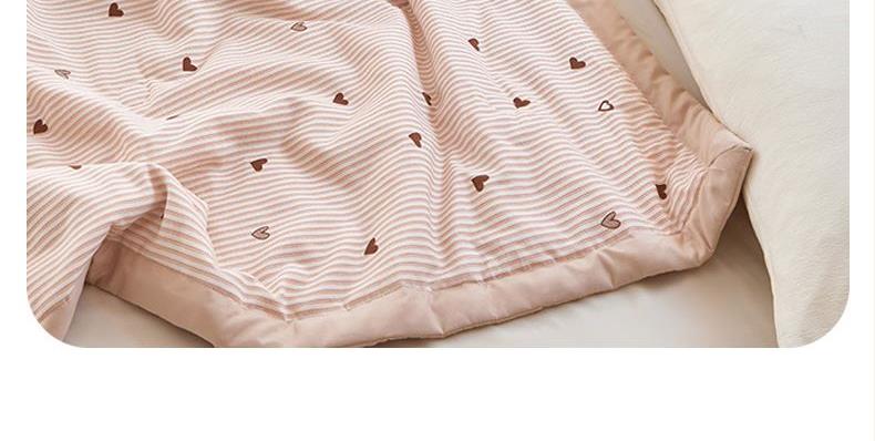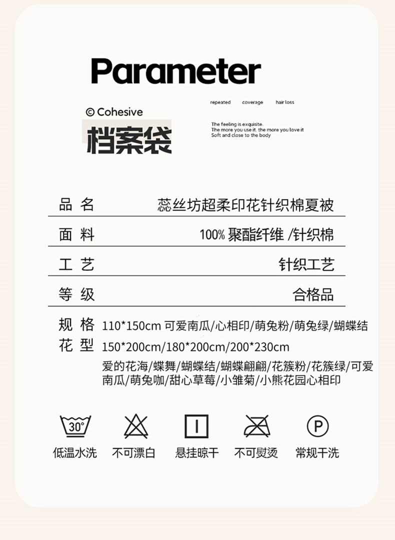 规 格: 150*200cm 花 色:爱的花海、蝶舞、蝴蝶结、蝴蝶翩翩、花簇粉、花簇绿、可爱南瓜、萌兔咖、甜心草莓、小雏菊、小熊花园、心相印面 料:水洗棉(聚酯纤维) 填充物:10%大豆纤维 90%聚酯纤维 工 艺:定位绗缝 高密针织棉面料,手感细腻, 柔软透气,婴幼儿面料贴身使用,A类级别标准,直接和肌肤亲密的接触,大豆纤维软糯轻盈透气,科学配比,更蓬松舒适,手工包边工艺 精美大方加宽包边设计经久耐用机洗更放心 ,随便机洗。