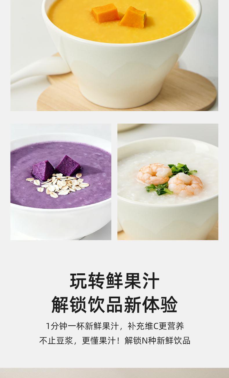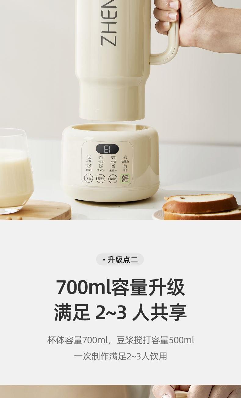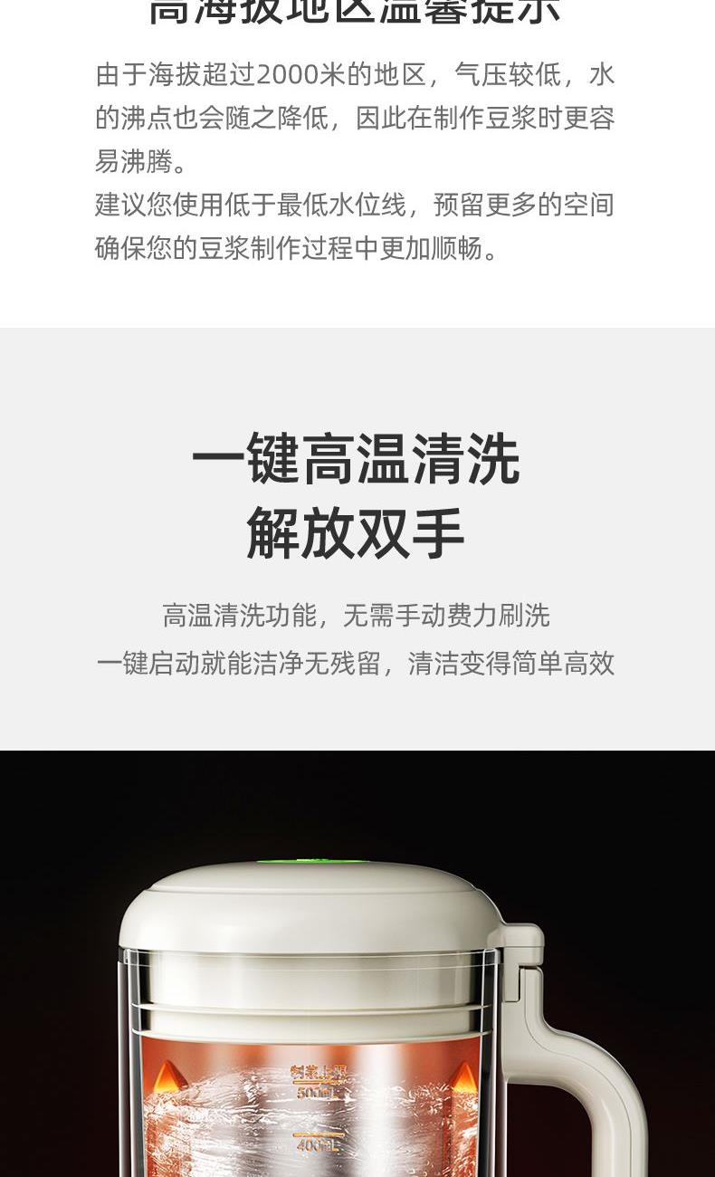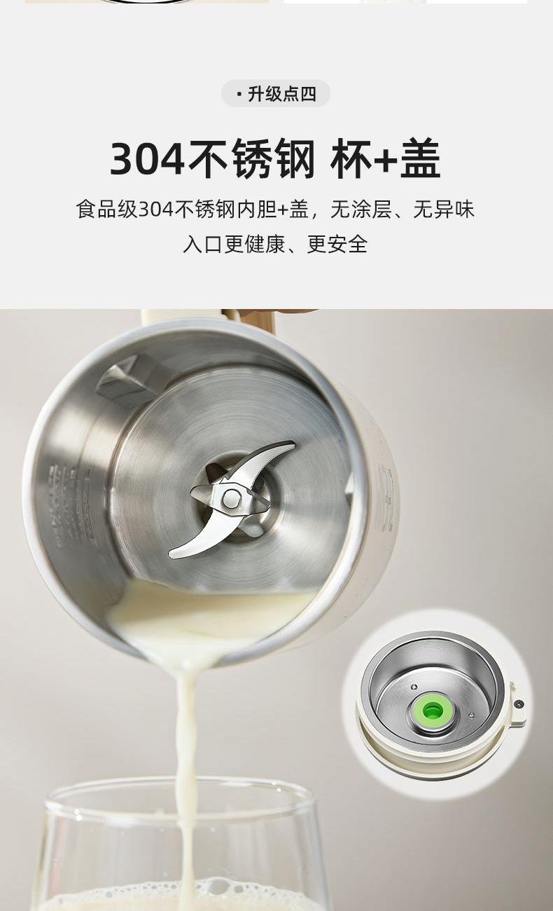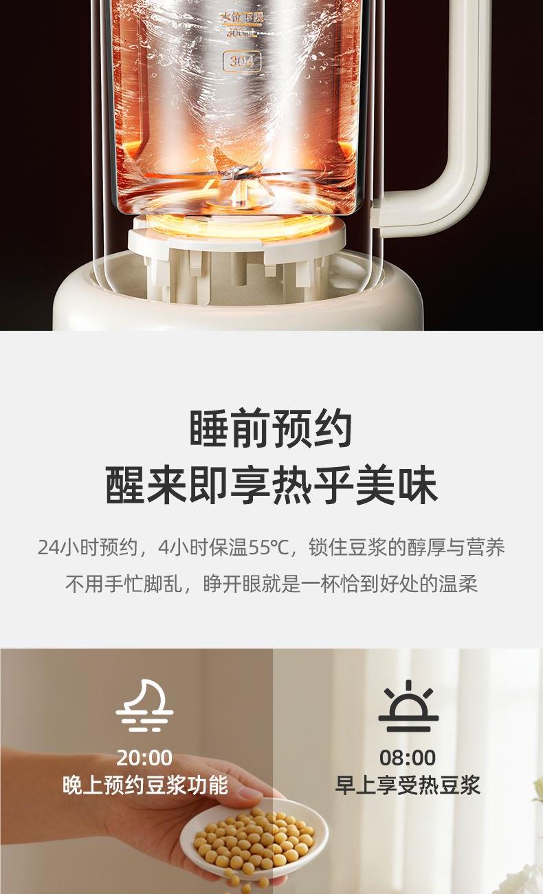 小杯身大肚量,杯体容量700ml,豆浆搅打容量500mL满足2-3人份 食品级304不锈钢杯身,304不锈钢内盖,无塑料异味,入口健康 8叶精钢刀头,11000rpm转速搅打,干豆直打,轻松破豆,释放豆浆醇香 24H超长智能预约(时间结束开始搅打),(果汁、保温、清洗3个功能不可以预约) 4小时默认保温,手动保温4小时;默认温度55°C(温度不可调整) 主机杯身分体,提杯无需拔电,自带5分钟提杯记忆,放入底座自动保温,无需重复操作(5分钟后则需要重新启动电源) 高温自动清洗,还原干净杯身(水温加热到80-90度温度,时间7分钟左右,加上清洗共计12分钟左右) 双重安全开关,开盖保护,避免机器误操作,安全放心使用
