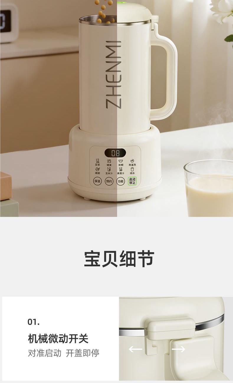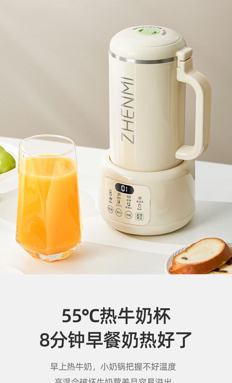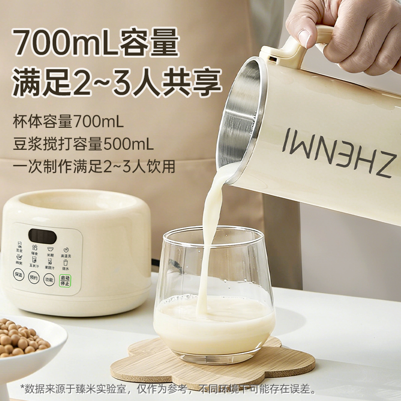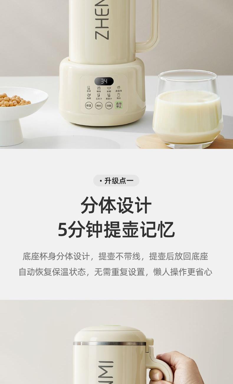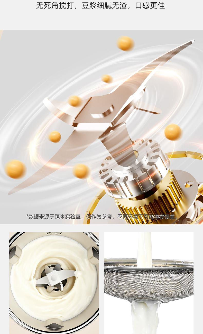 小杯身大肚量,杯体容量700ml,豆浆搅打容量500mL满足2-3人份 食品级304不锈钢杯身,304不锈钢内盖,无塑料异味,入口健康 8叶精钢刀头,11000rpm转速搅打,干豆直打,轻松破豆,释放豆浆醇香 24H超长智能预约(时间结束开始搅打),(果汁、保温、清洗3个功能不可以预约) 4小时默认保温,手动保温4小时;默认温度55°C(温度不可调整) 主机杯身分体,提杯无需拔电,自带5分钟提杯记忆,放入底座自动保温,无需重复操作(5分钟后则需要重新启动电源) 高温自动清洗,还原干净杯身(水温加热到80-90度温度,时间7分钟左右,加上清洗共计12分钟左右) 双重安全开关,开盖保护,避免机器误操作,安全放心使用
