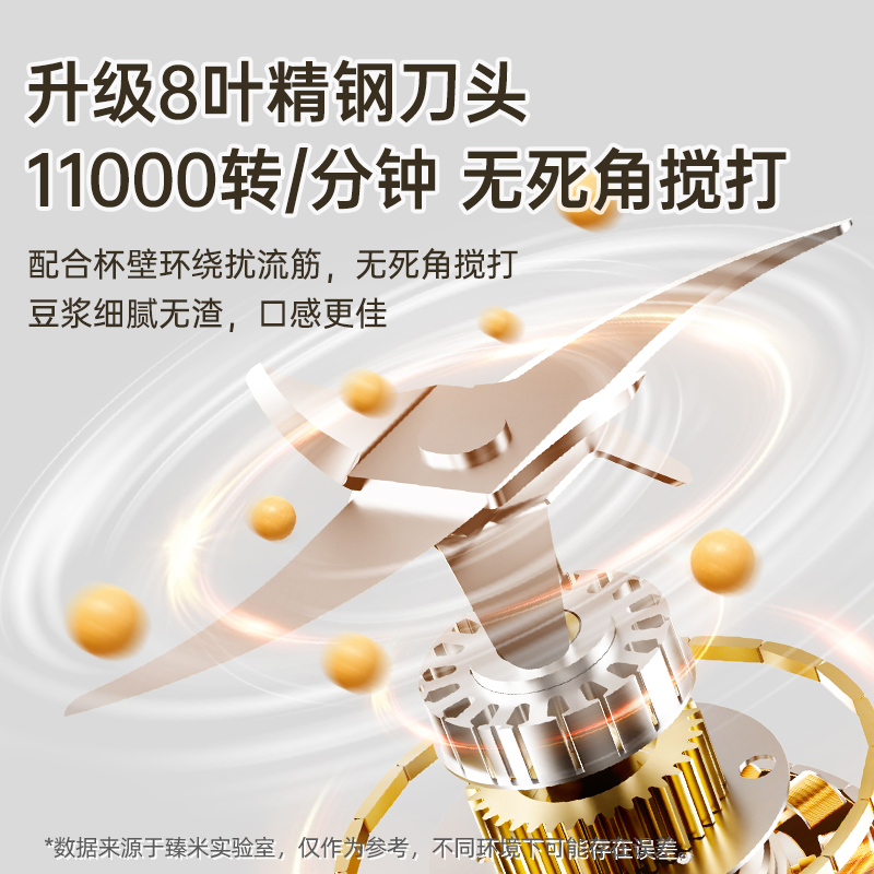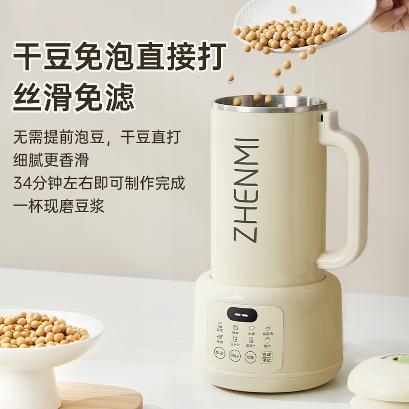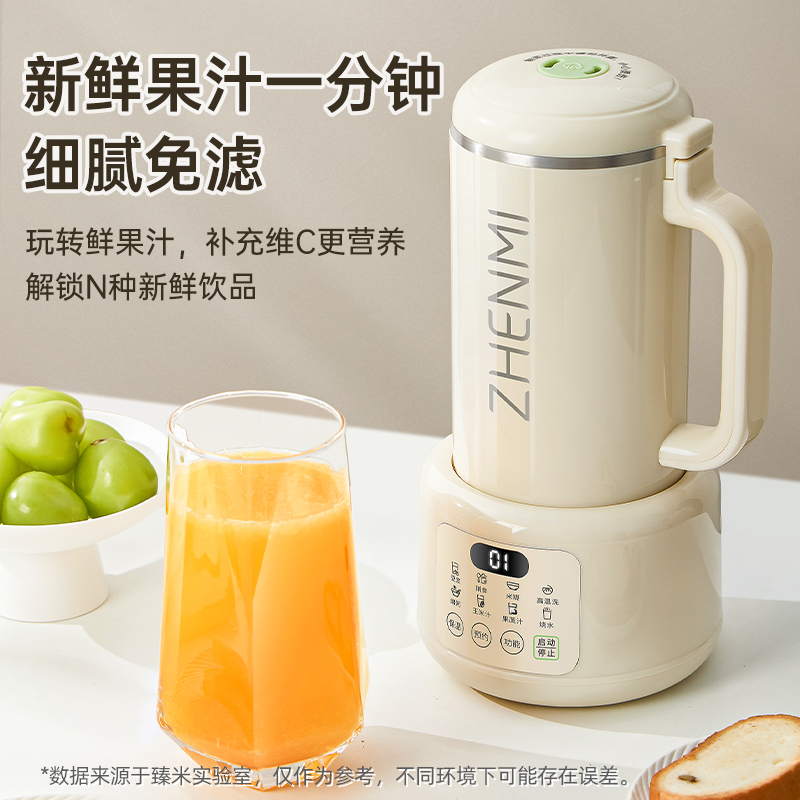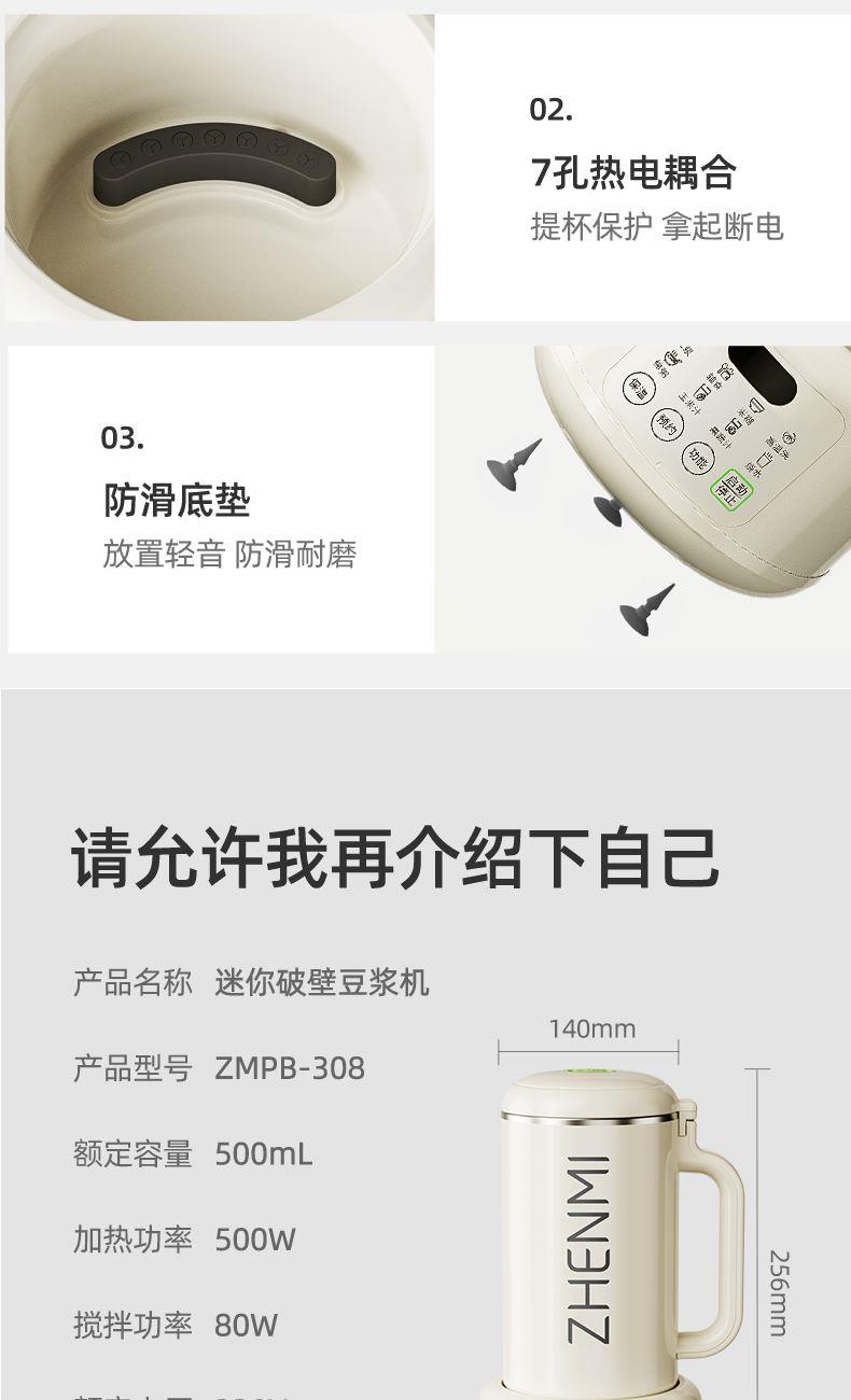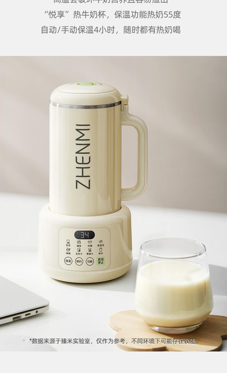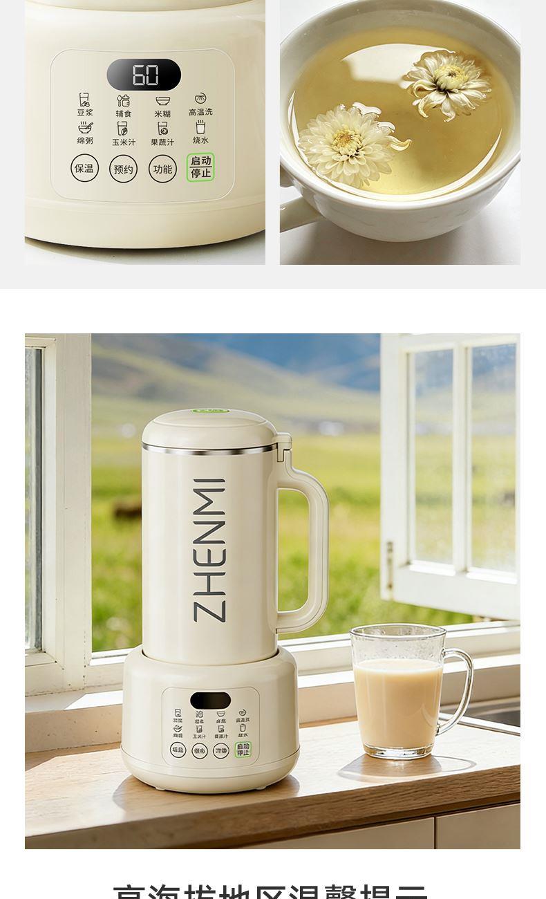 小杯身大肚量,杯体容量700ml,豆浆搅打容量500mL满足2-3人份 食品级304不锈钢杯身,304不锈钢内盖,无塑料异味,入口健康 8叶精钢刀头,11000rpm转速搅打,干豆直打,轻松破豆,释放豆浆醇香 24H超长智能预约(时间结束开始搅打),(果汁、保温、清洗3个功能不可以预约) 4小时默认保温,手动保温4小时;默认温度55°C(温度不可调整) 主机杯身分体,提杯无需拔电,自带5分钟提杯记忆,放入底座自动保温,无需重复操作(5分钟后则需要重新启动电源) 高温自动清洗,还原干净杯身(水温加热到80-90度温度,时间7分钟左右,加上清洗共计12分钟左右) 双重安全开关,开盖保护,避免机器误操作,安全放心使用