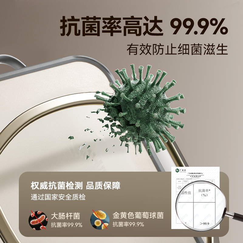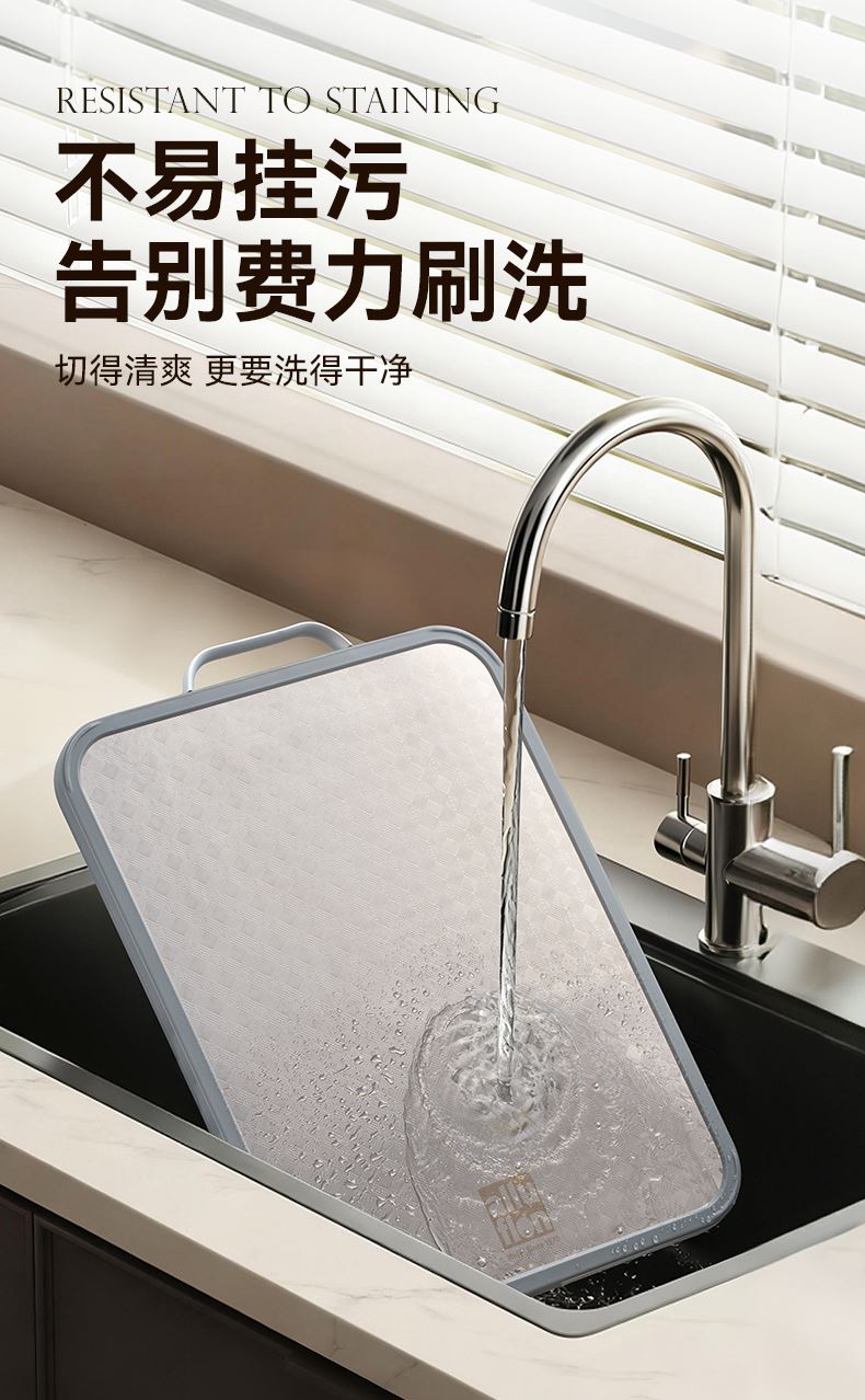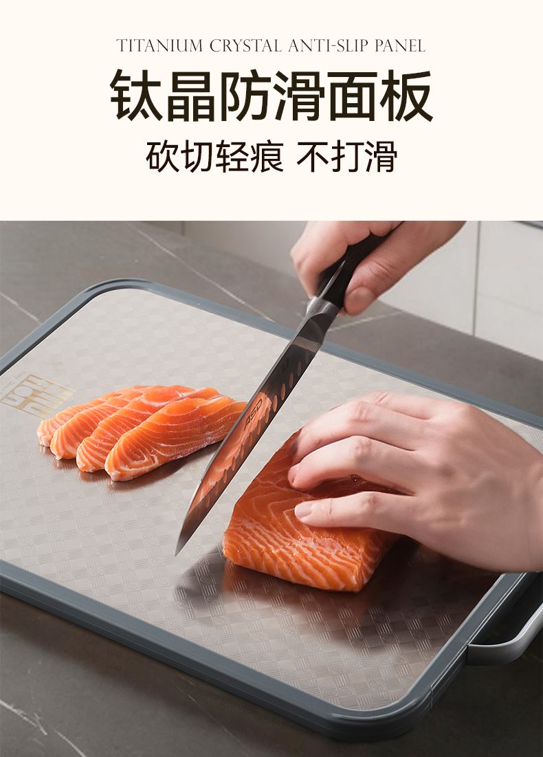 产品规格:37*28*1.5cm 产品货号:2205085128 外箱尺寸:425*295*210mm 彩盒尺寸:285*250*420mm 1、纯钛砧板,健康无污染 2、高硬度防滑擦,耐砍轻痕 3、双面鲜切,生熟分区 4、3.0PP面,有效防止细菌滋生 5、可立可挂,收纳便捷