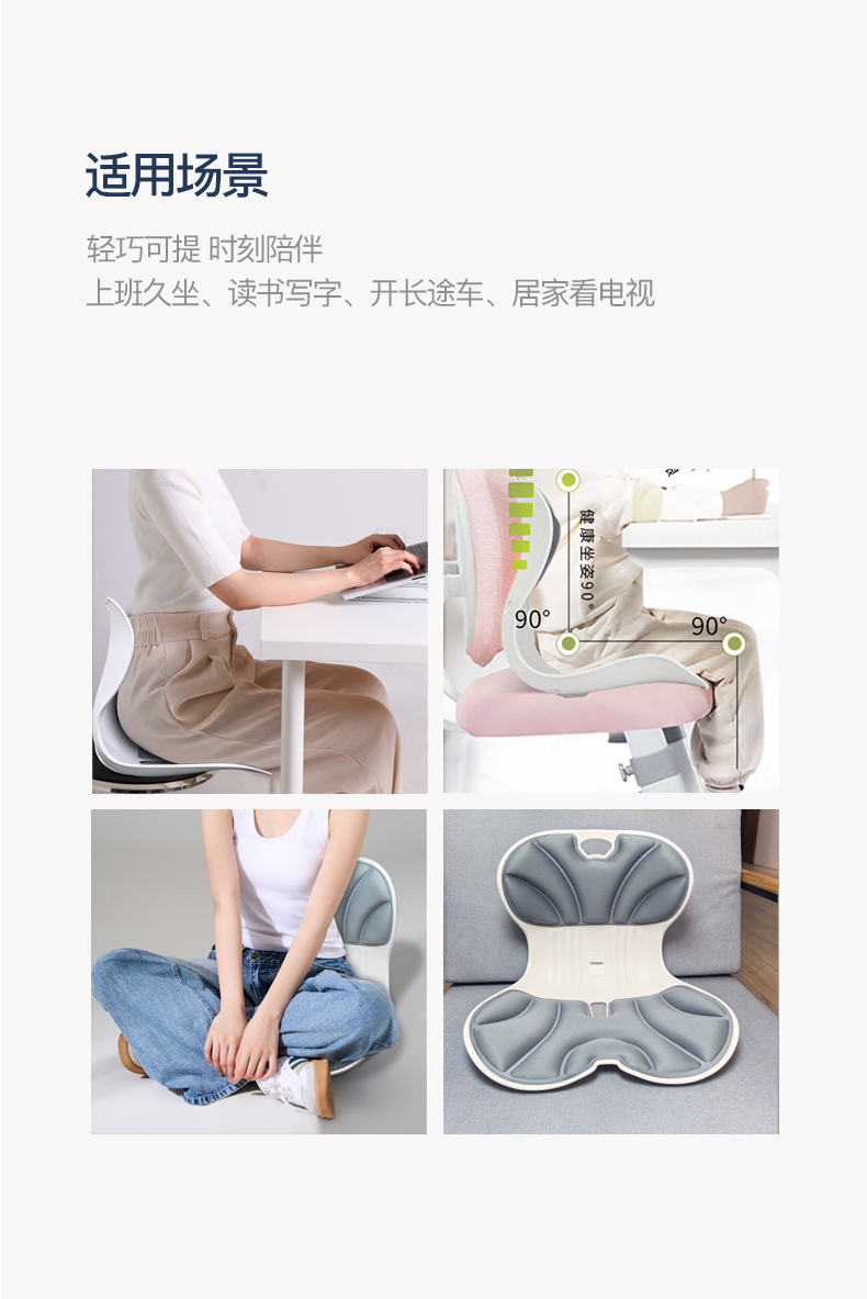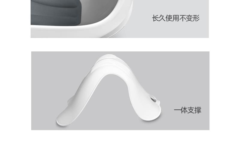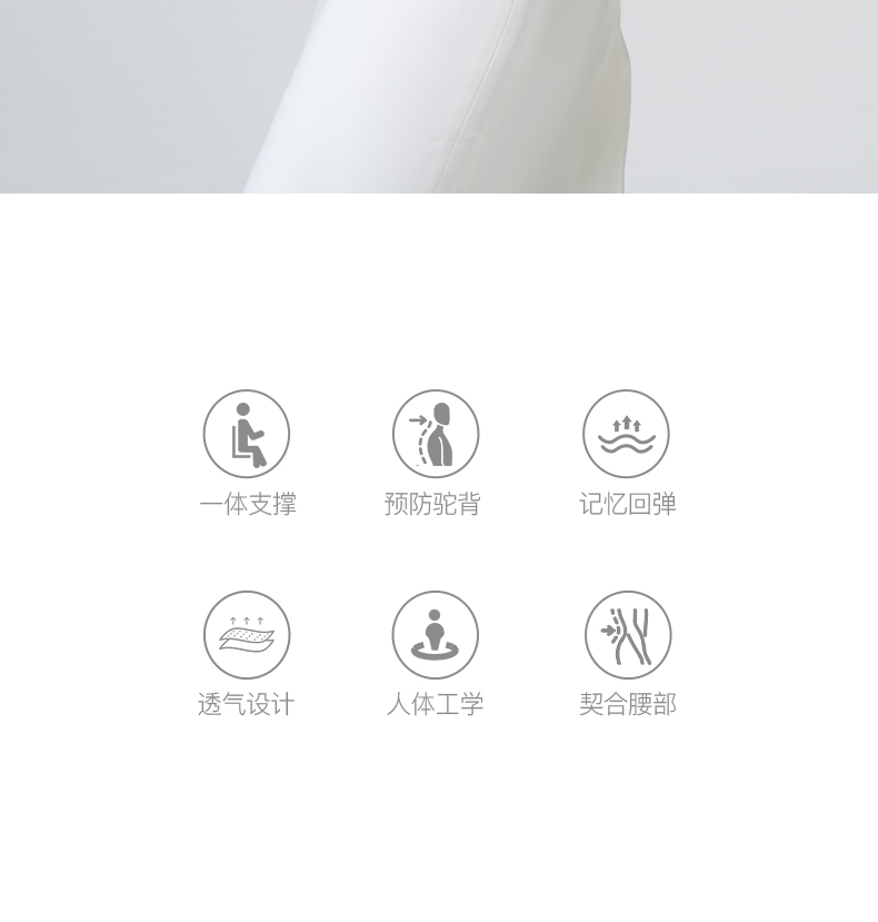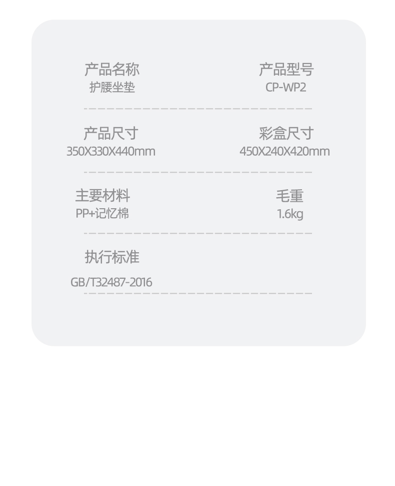 产品参数: 产品型号:CP-WP2 产品颜色:白色+灰色 主要材料:PP+记忆棉 产品尺寸 : 350X330X440mm 包装尺寸:450X240X420mm 商品条码 : 6972831861201 产品毛重 : 1.6kg 执行标准:GB/T32487-2016 包装清单:护腰坐垫X1 核心卖点: 1、杠杆原理设计黄金分割比例 2、人体工学设计,久坐不累的秘密 3、无缝贴合腰背,辅助矫正坐姿 4、分区支撑,系统均衡释压 5、顶腰护臀护脊 随便靠,全天舒适支撑 6、通风设计,轻柔触感 久坐不闷 7、一体成型,稳固承重