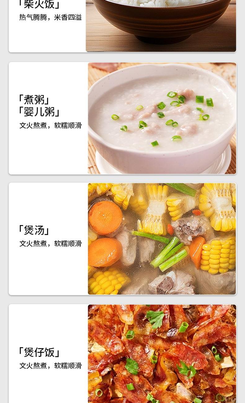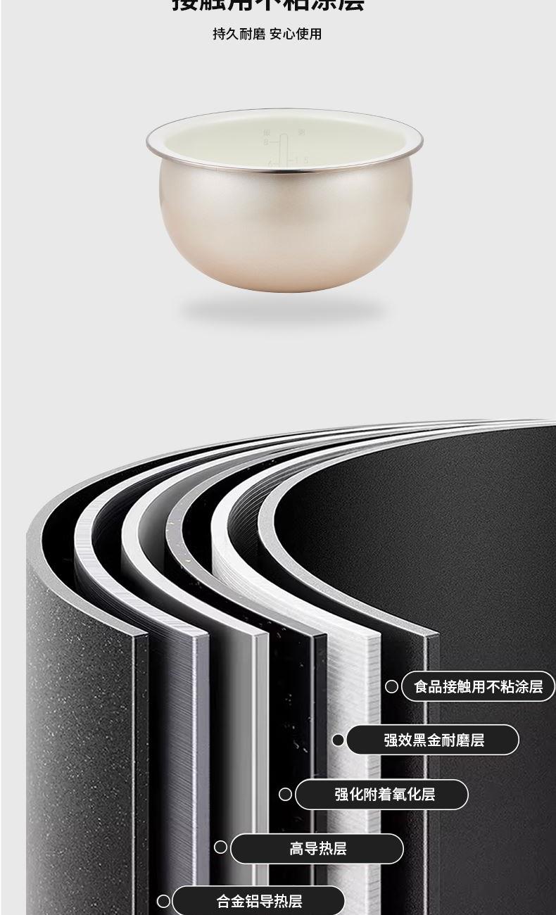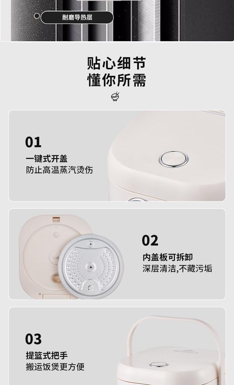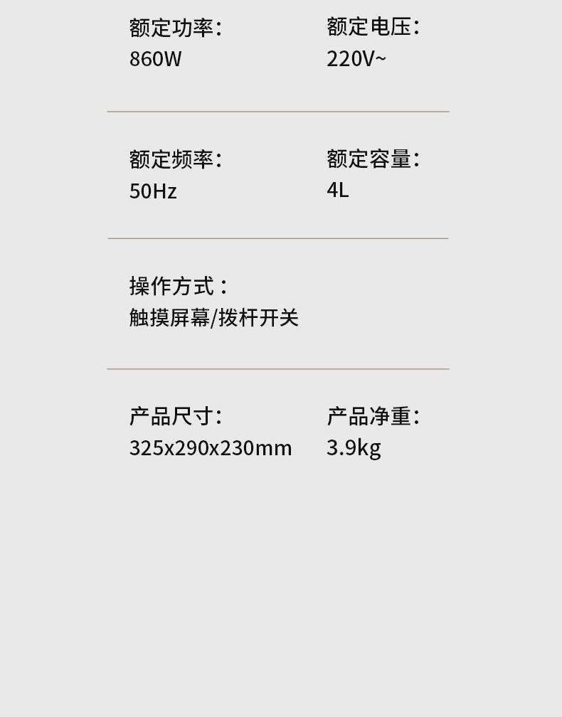 产品颜色:月光白 产品材质:PP+珐琅内胆 额定电压:220V~ 额定频率:50Hz 额定功率:860W 额定容量:4.0L 单台净重:3.9kg 单台毛重:4.8kg 产品尺寸:325*290*230mm 内箱尺寸:395*325*275mm 外箱尺寸:670*410*570mm 产品清单:主机*1/电源线*1/说明书*1 机械一键煮饭+触摸控制设计 珐琅内胆,可拆内盖易清洗 碗型发热盘,全身防烫 4L超大容量珐琅内胆,材质更安全放心 9大功能,能煲,能煮,支持预约,满足各种生活需求 功能面板,清晰显示屏,触摸+机械一键控制方式,老少皆宜