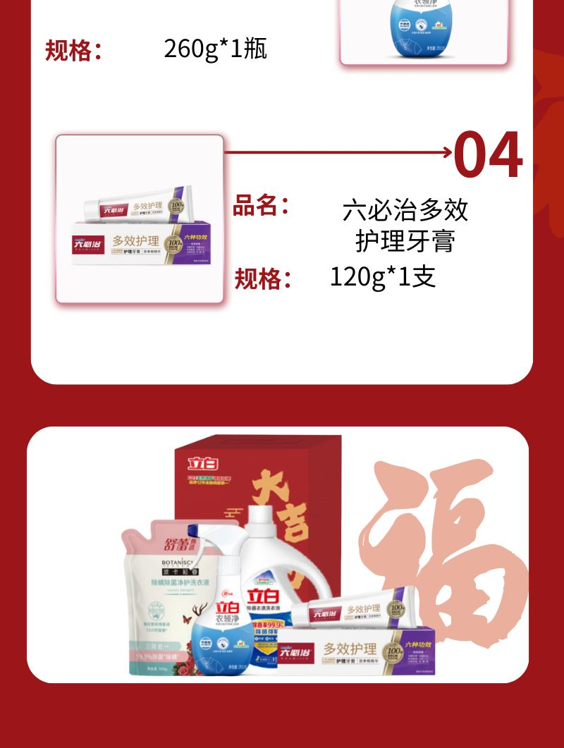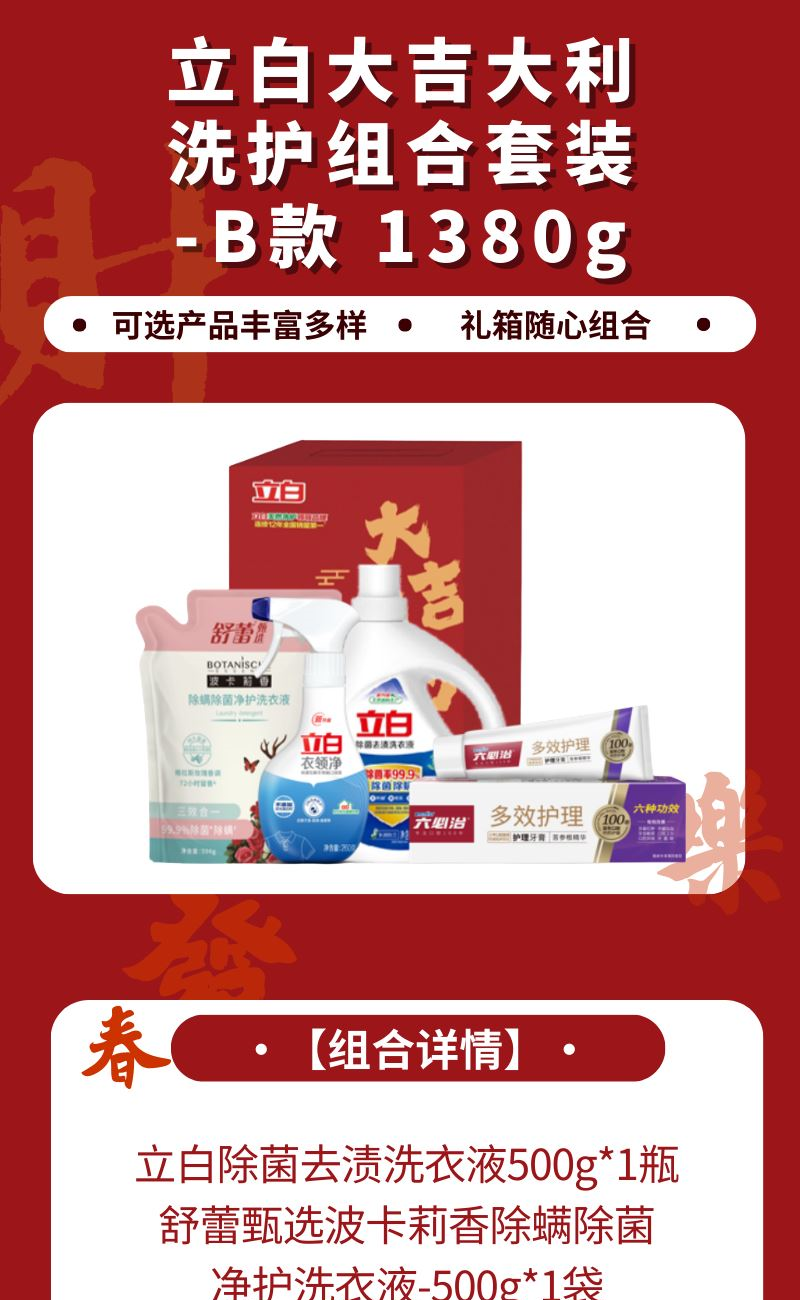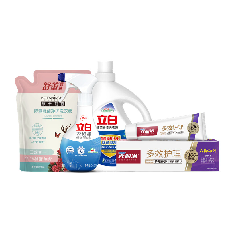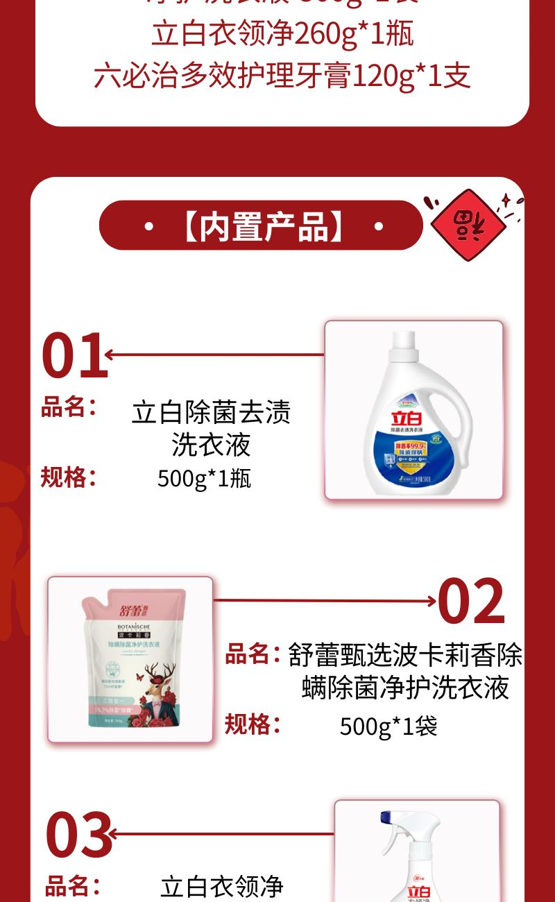 配置: 立白除 菌去渍洗衣液500g*1瓶 舒蕾甄选波卡莉香除螨除 菌净护洗衣液-500g*1袋 立白衣领净260g*1瓶 六必治多效护理牙膏120g*1支 卖点: 可选产品丰富多样,礼箱随心组合,多种价位因需而定,充分满足各种送礼需求,是商务送礼、单位福利的用心之选。