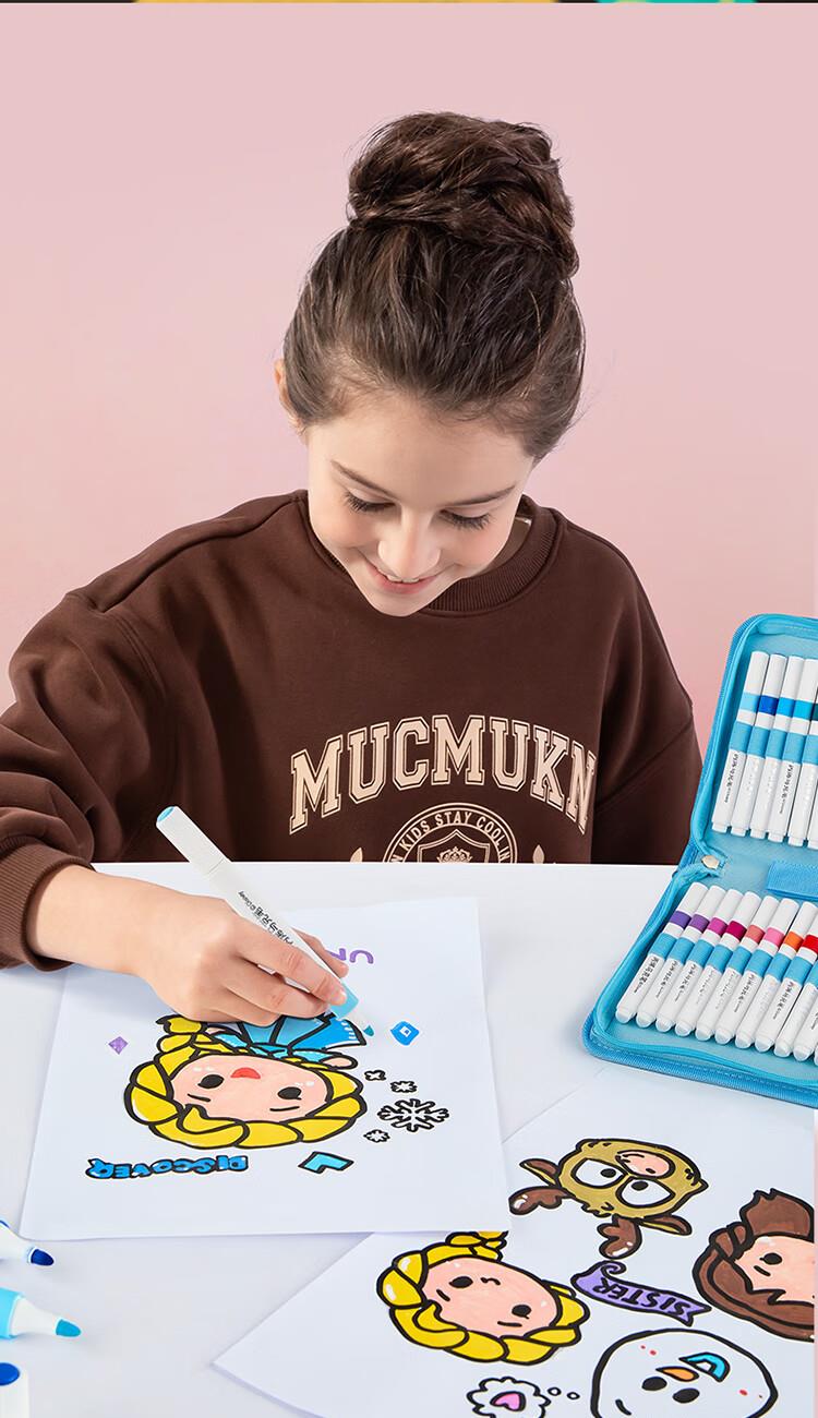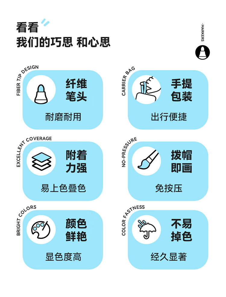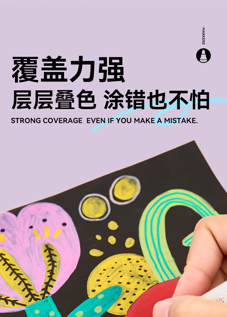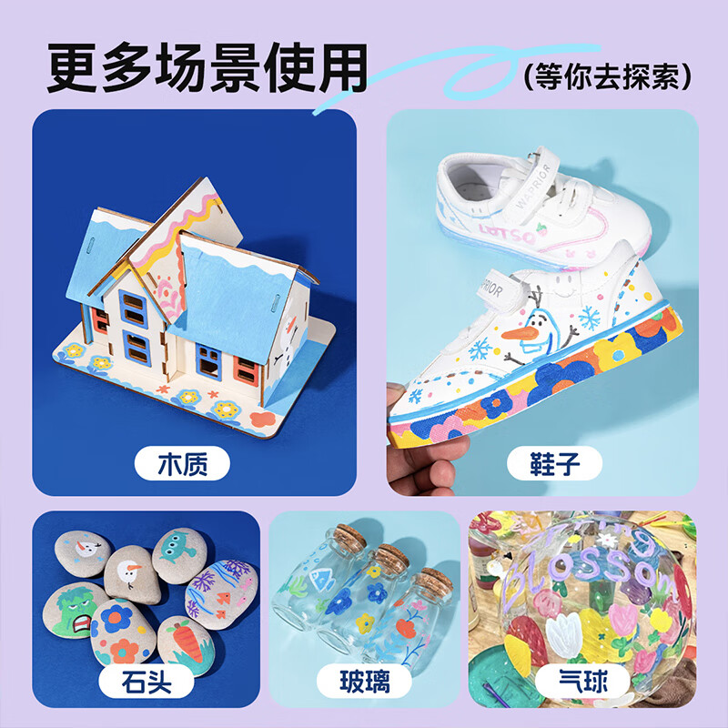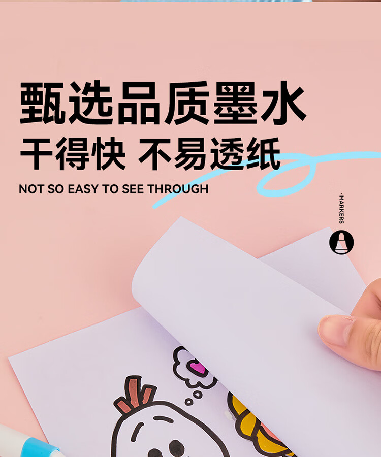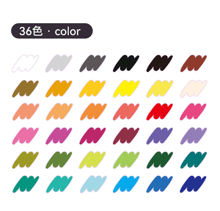 产品规格:36色 单品尺寸:130mm 尺寸:(36色)230X175X45mm 卖点: ①儿童丙烯马克笔任意涂鸦,随心创作 ②纤维笔头、耐磨耐用;附着力强、易上色叠色;颜色鲜艳、显色度高;不易掉色、经久显著 ③手提包装出行便捷 ④纤维笔头设计,耐磨不易变形 ⑤万物皆可画画出你的奇思妙想 ⑥宝宝大胆创作沾上皮肤可水洗 ⑦甄选品质墨水干得快 不易透纸