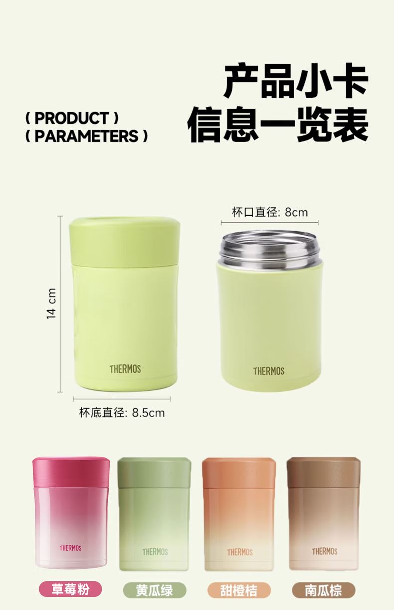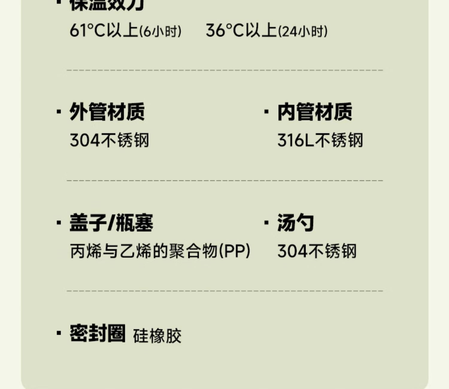 颜 色:OR橘色 GR绿色 BR棕色 PK粉色 GY灰色 容 量:470毫升 保温效力:61℃以上/6小时 36℃以上/24小时 保冷效力:12C以下(6小时) 外管材质:304不锈钢 内管材质:316L不锈钢 盖子材质: 304不锈钢 丙烯与乙烯的聚合物(PP) 瓶塞材质: 丙烯与乙烯的聚合物(PP) 聚丙烯(丙烯均聚物)(PP) 汤勺材质: 304不锈钢 密封圈:食品级硅胶