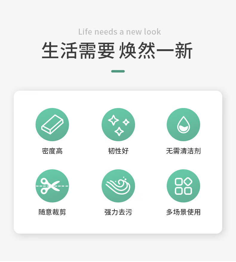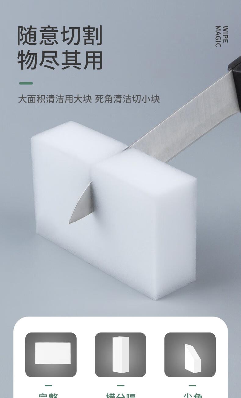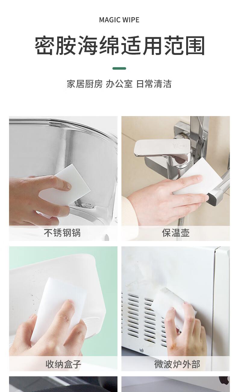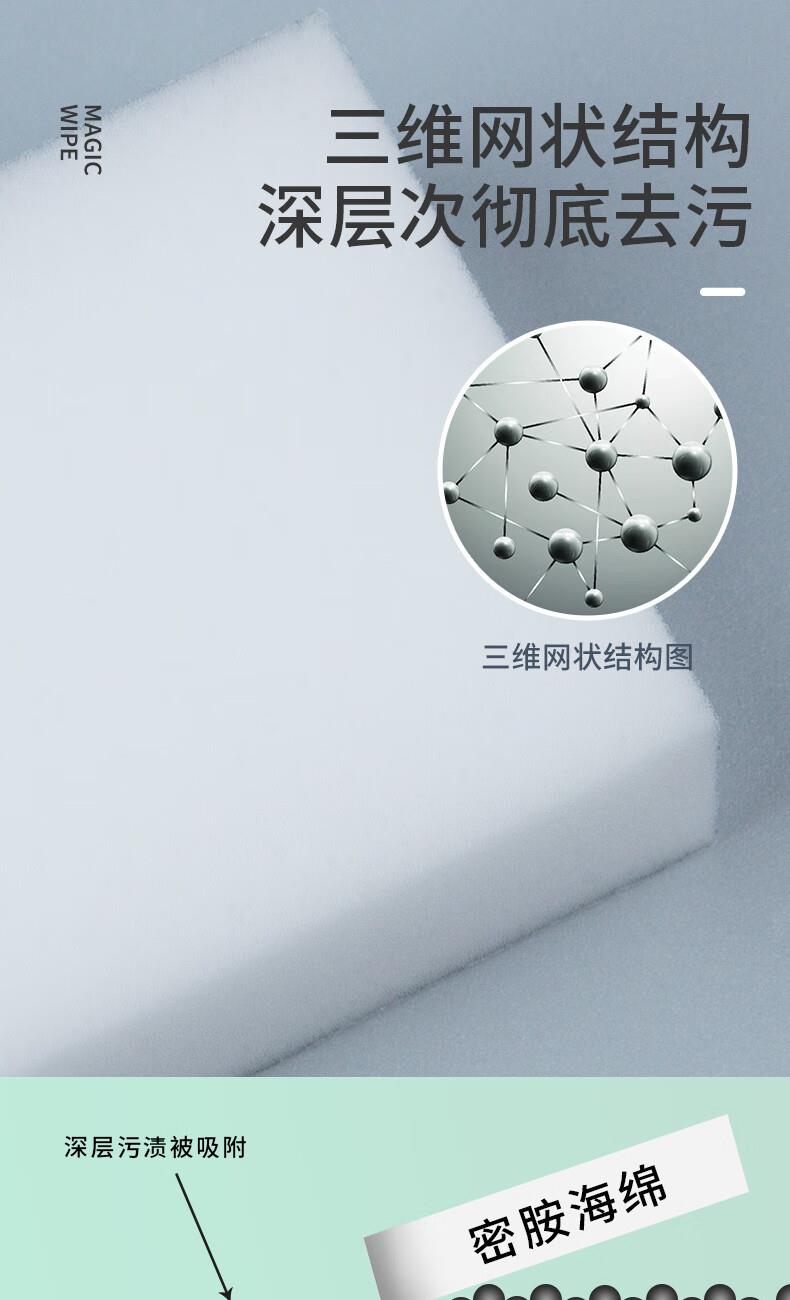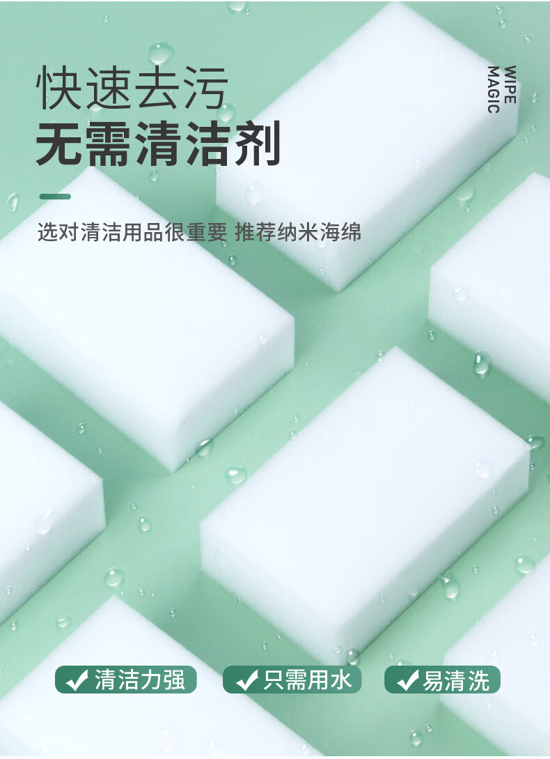 只需用水一擦即净 各种污渍 轻松搞定 三维网状结构深层次去污 柔韧性强 不易折断 易清洗 快速去污无需清洁剂 选对清洁用品很重要 推荐纳米海绵 只需沾水后轻轻一擦即刻干净 密胺海绵吸附污渍能力强 用清水洁净力一样强 随意切割物尽其用 大面积清洁用大块 死角清洁切小块