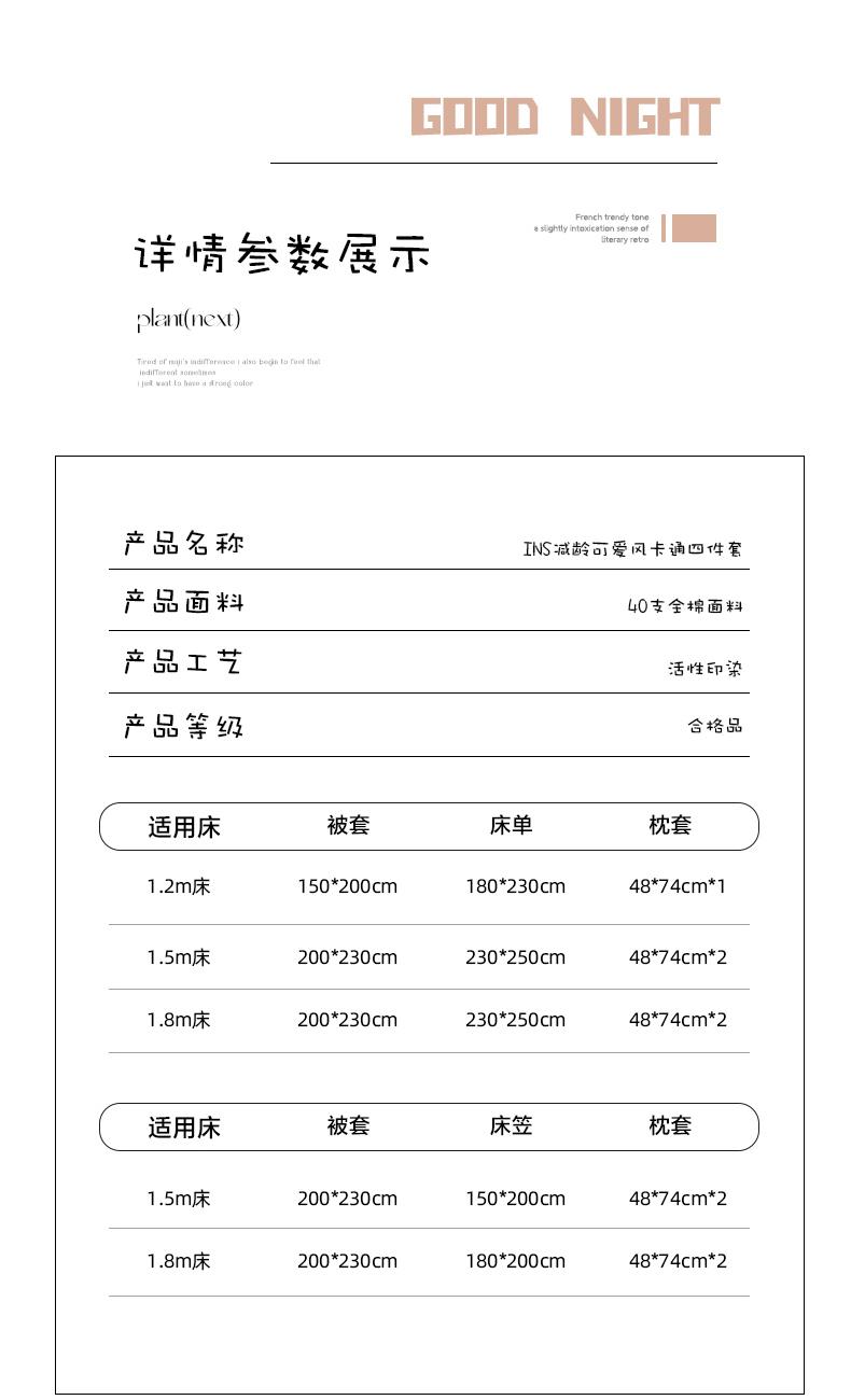 1:40S全棉面料 手感细腻柔软 吸湿透气不感闷热 享受好睡眠 2:至柔至顺似云朵般柔软 良好的昼夜温差 赋予棉花柔软绵长的特点 手感软糯柔润 把阳光操进身体 3:新一代活性印染工艺 色彩靓丽 固色度高不易褪色 不易晕染 水洗机洗无忧 唤醒卧室色彩之 美 尺寸:被套200*230cm*1 床单:230*250cm*1 枕套:48*74cm*2 面料:40支全棉纯棉 包装:彩盒