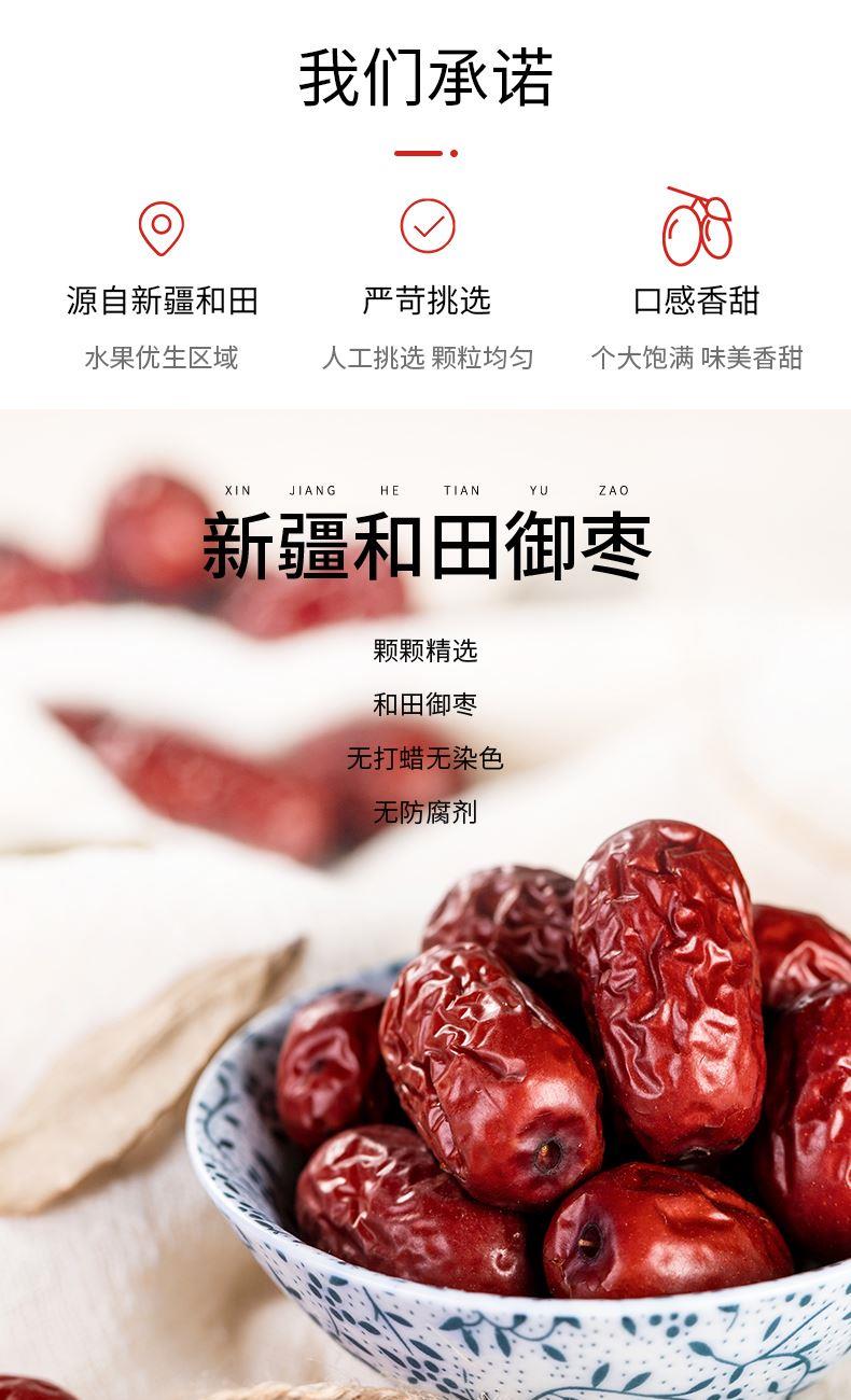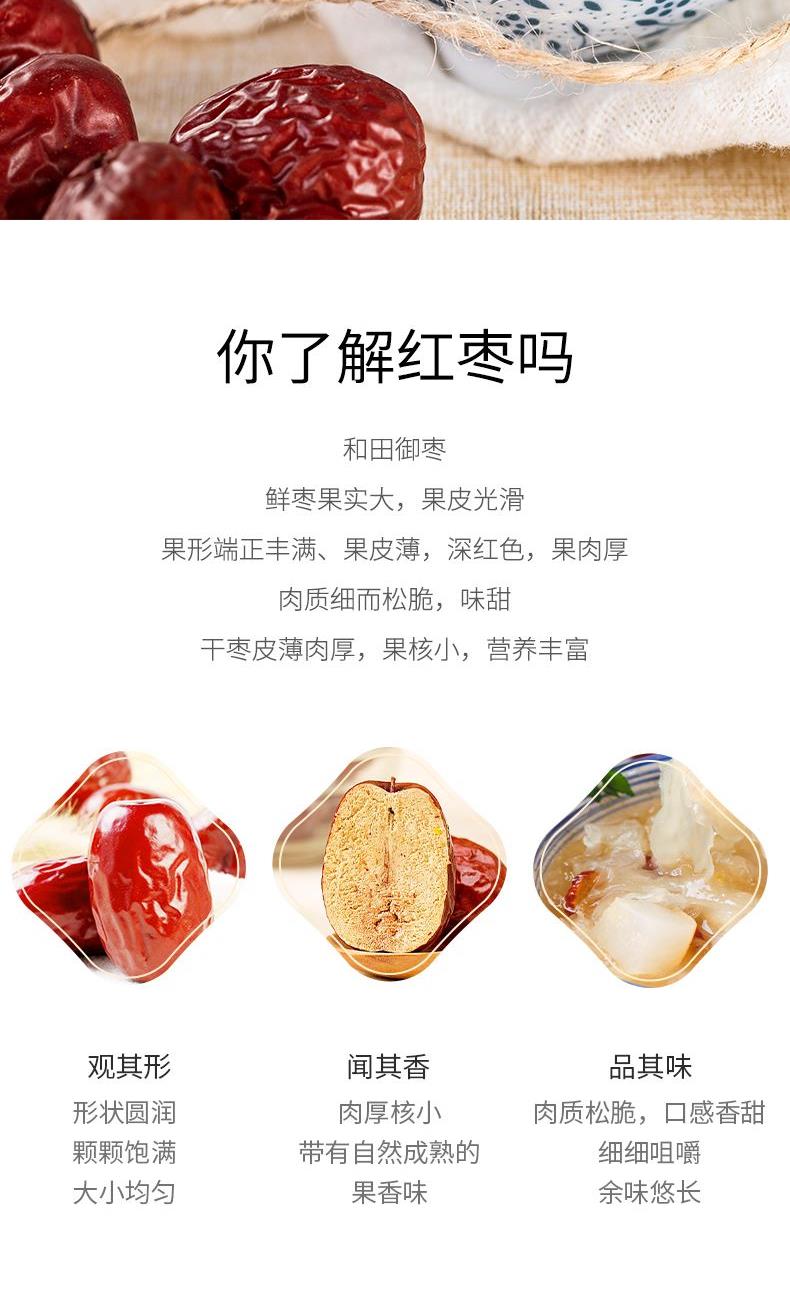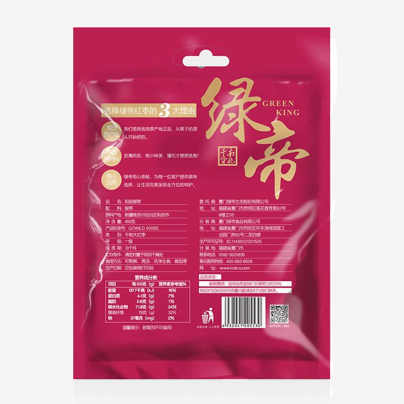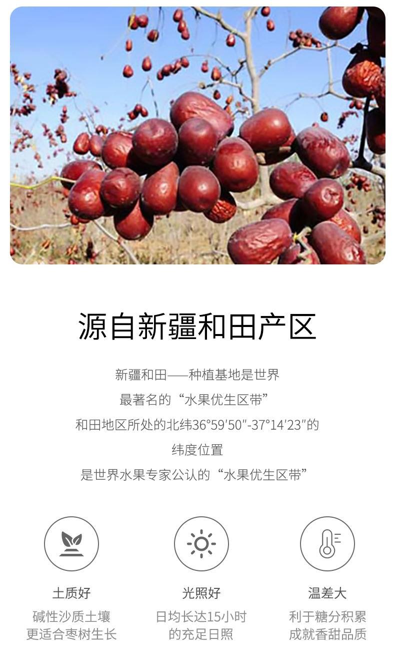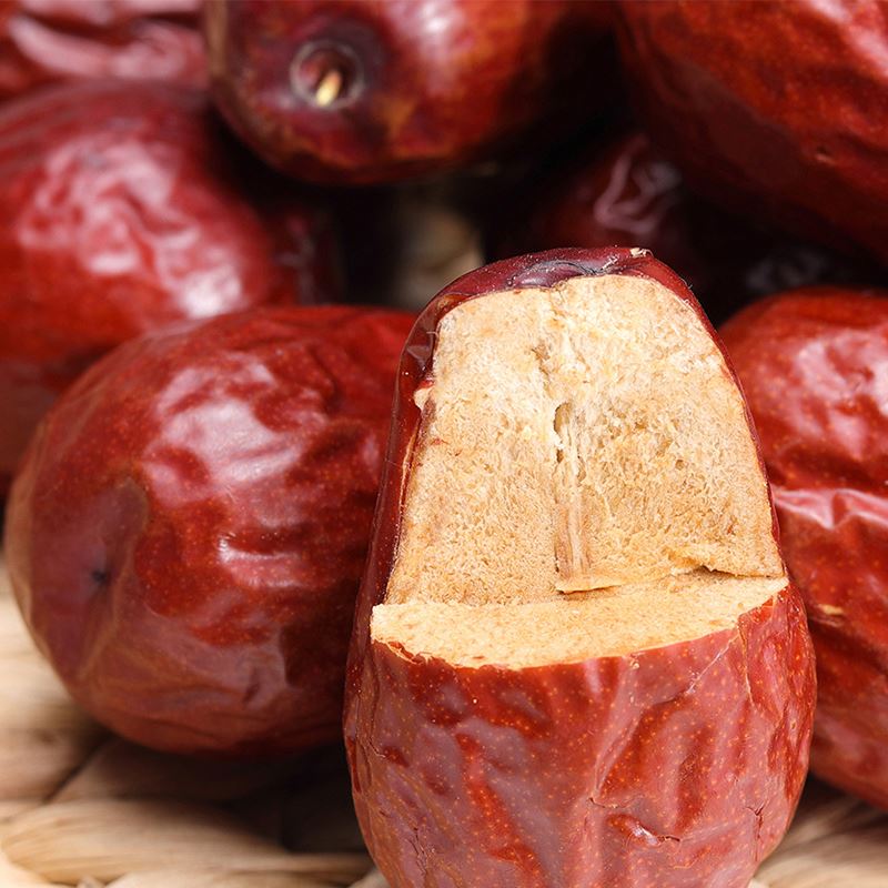 配料:骏枣 原料产地:新疆维吾尔自治区和田市 净含量:250克 保质期:10个月 生产日期:见包装物打印处 食用方法:可熬粥、煲汤、洗净生食、做馅等 新疆骏枣源自塔克拉玛干沙漠南源,该地昼夜温差大,日照充足,造就了新疆骏枣皮薄肉厚、颗粒饱满的品质,食之令人回味无穷。