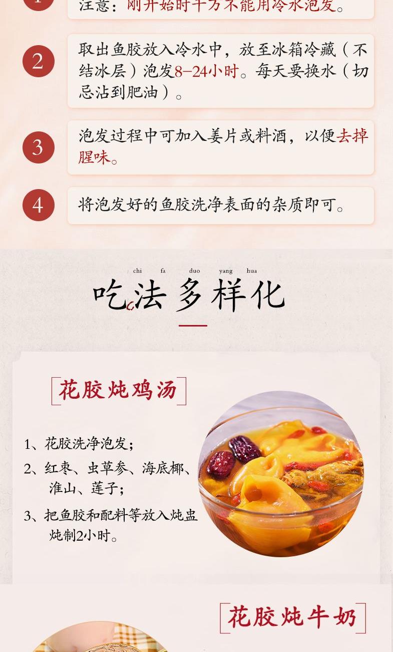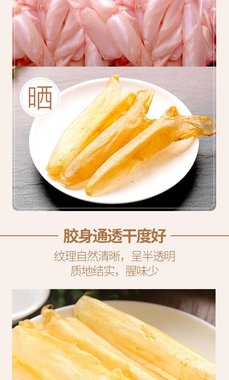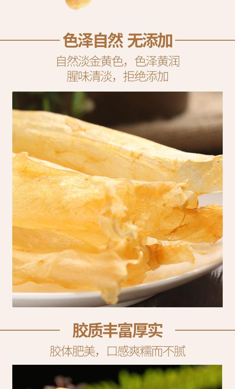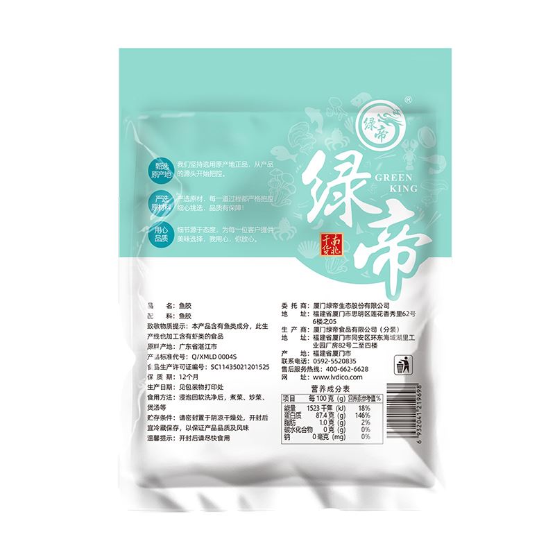 配料:鱼胶 原料产地:广东省湛江市 净含量:40克 保质期:12个月 生产日期:见包装物打印处 食用方法:用清水浸软洗净后,可炖、煮等,还可为多种菜肴调出美味。 贮存条件:请密封置于阴凉干燥处,开封后宜冷藏保存,以保住产品品质及风味。