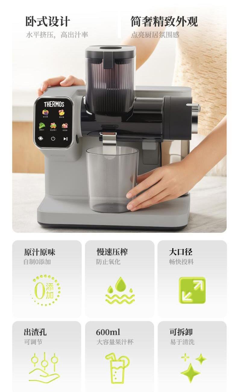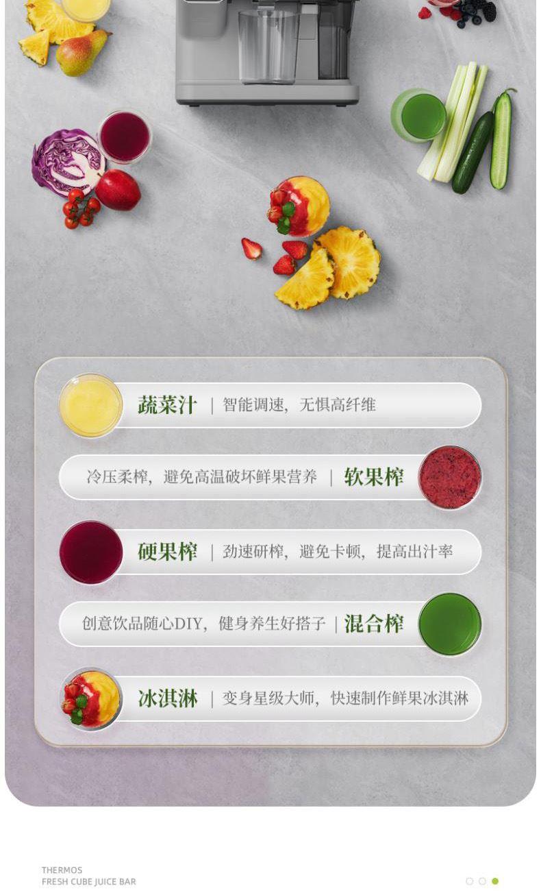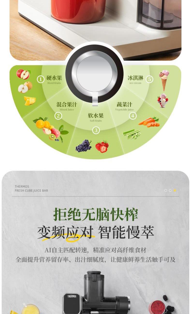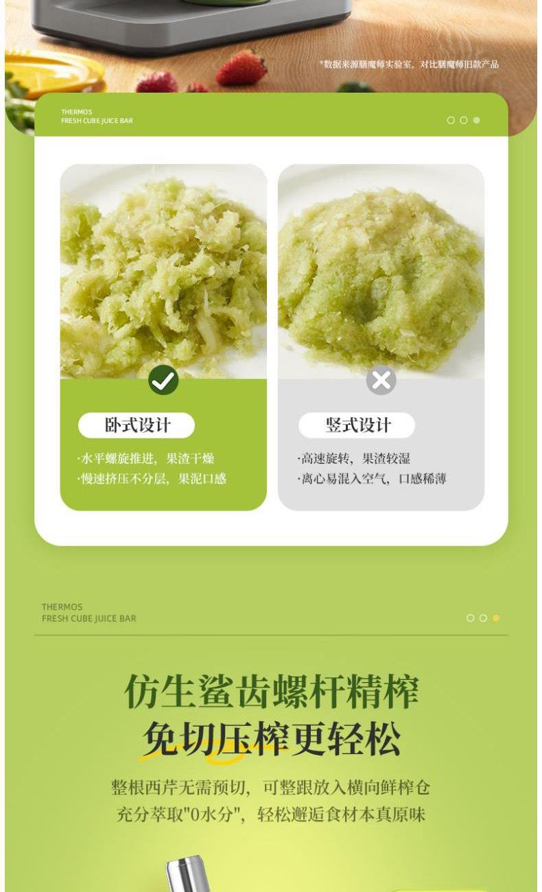 独有FreshmasterPlus 强力智能锁鲜榨(通过变频动力系统与程序,以不同的程序匹配不同特性食材。再配合专/利压榨力调节旋钮匹配对应的压榨力度,全面提升榨汁的顺畅度以及出汁效率。)
