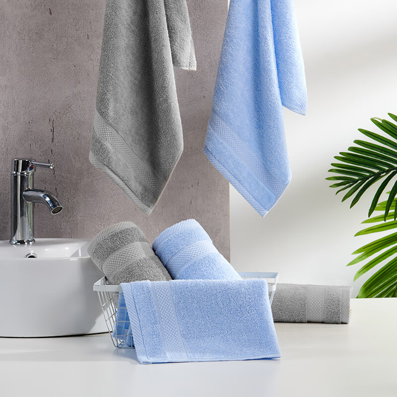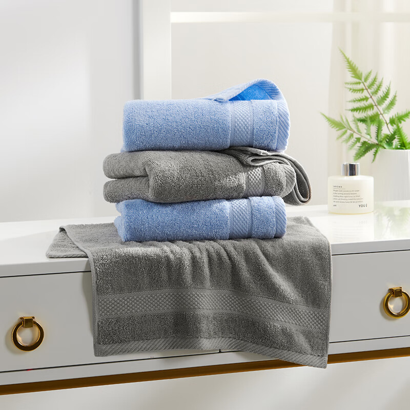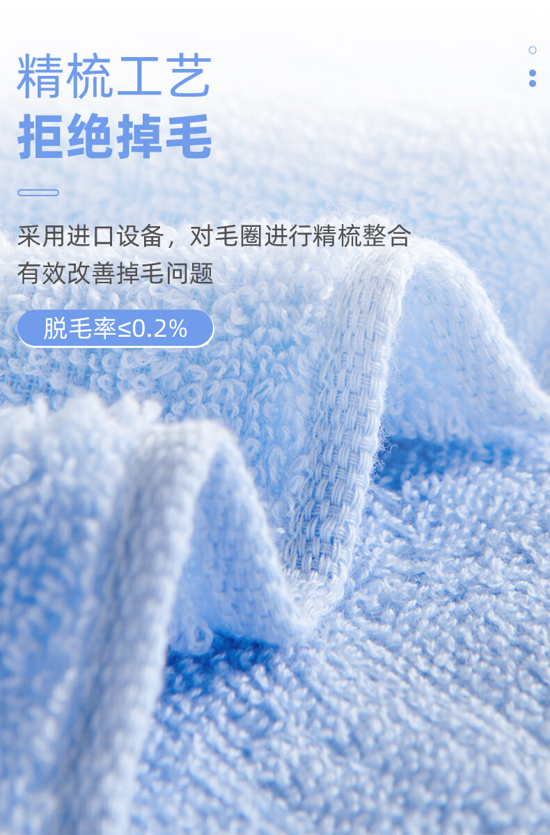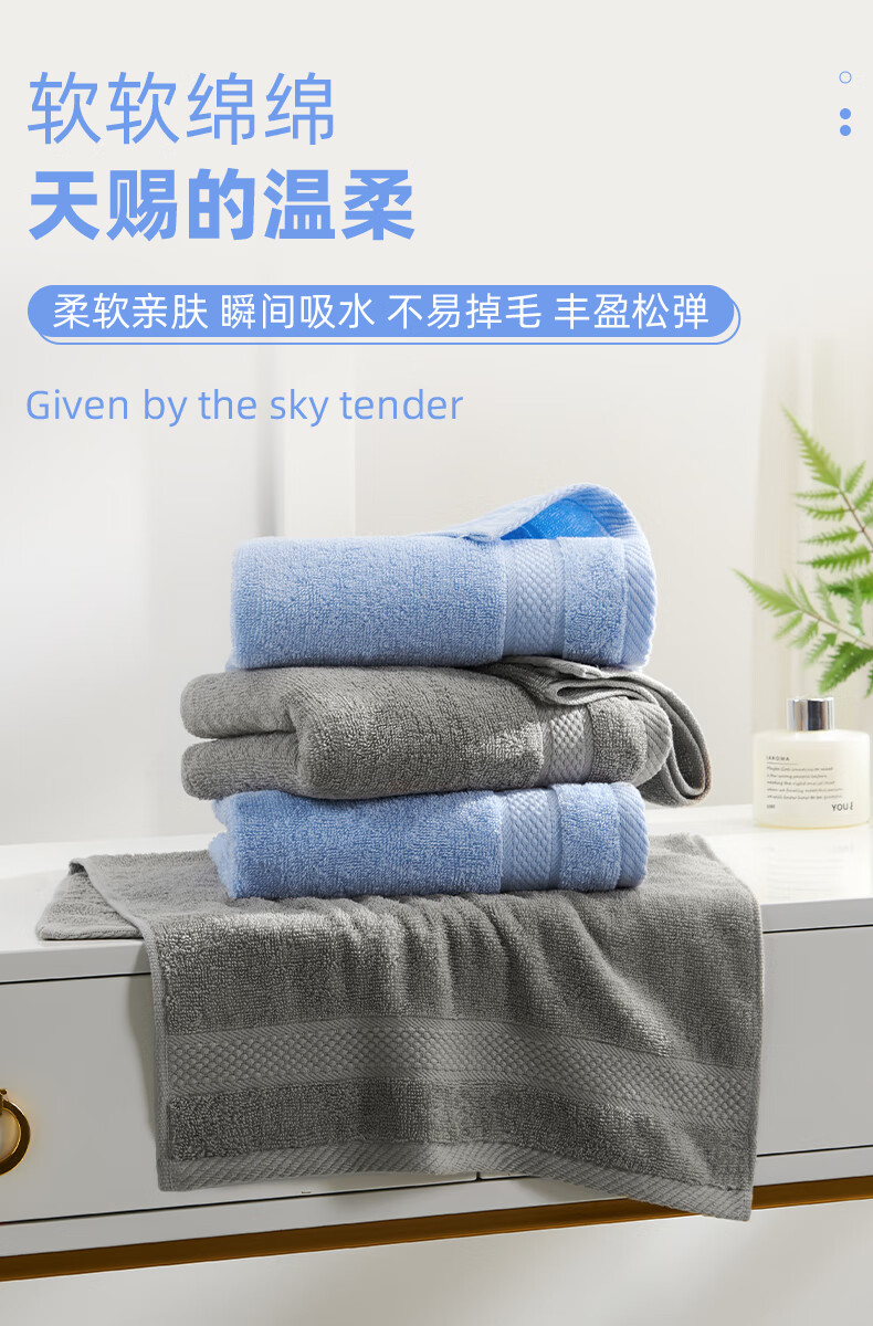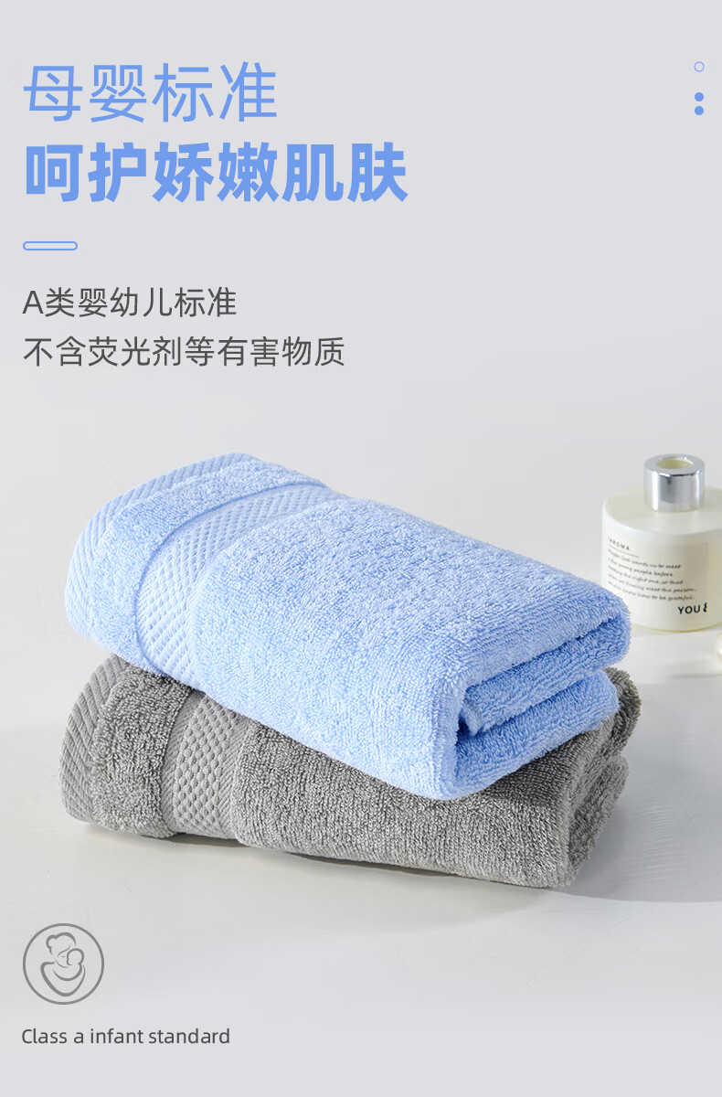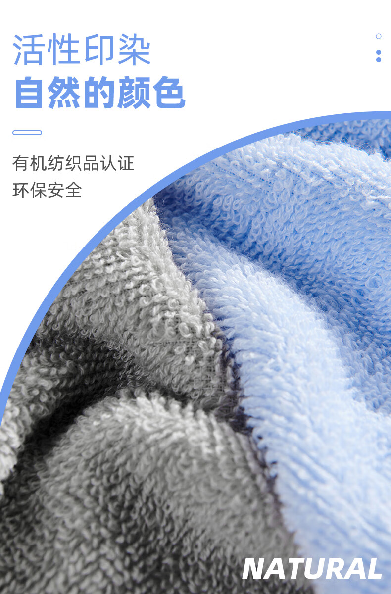 规格:33cmx62cm 75g/条 颜色:蓝灰 材质工艺:77%棉 23%聚酯纤维(装饰部分除外) 包装内容:毛巾 2条 1、选用优质纱线织造,双面毛圈,松软平整,吸水性更强,清爽透气。点缀缎档,简约大气。 2、A类婴幼儿标准,绿色环保染料,未检测出荧光剂、甲醛、致癌物,宝宝用起来更安心。 3、未检出荧光/甲醛/芳香胺,婴幼儿和敏感肌可用。