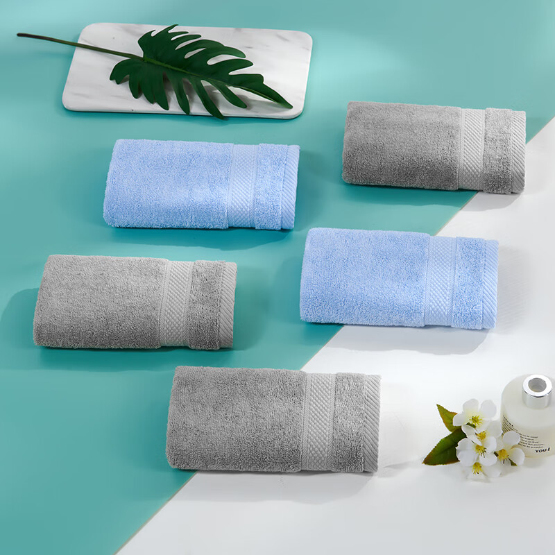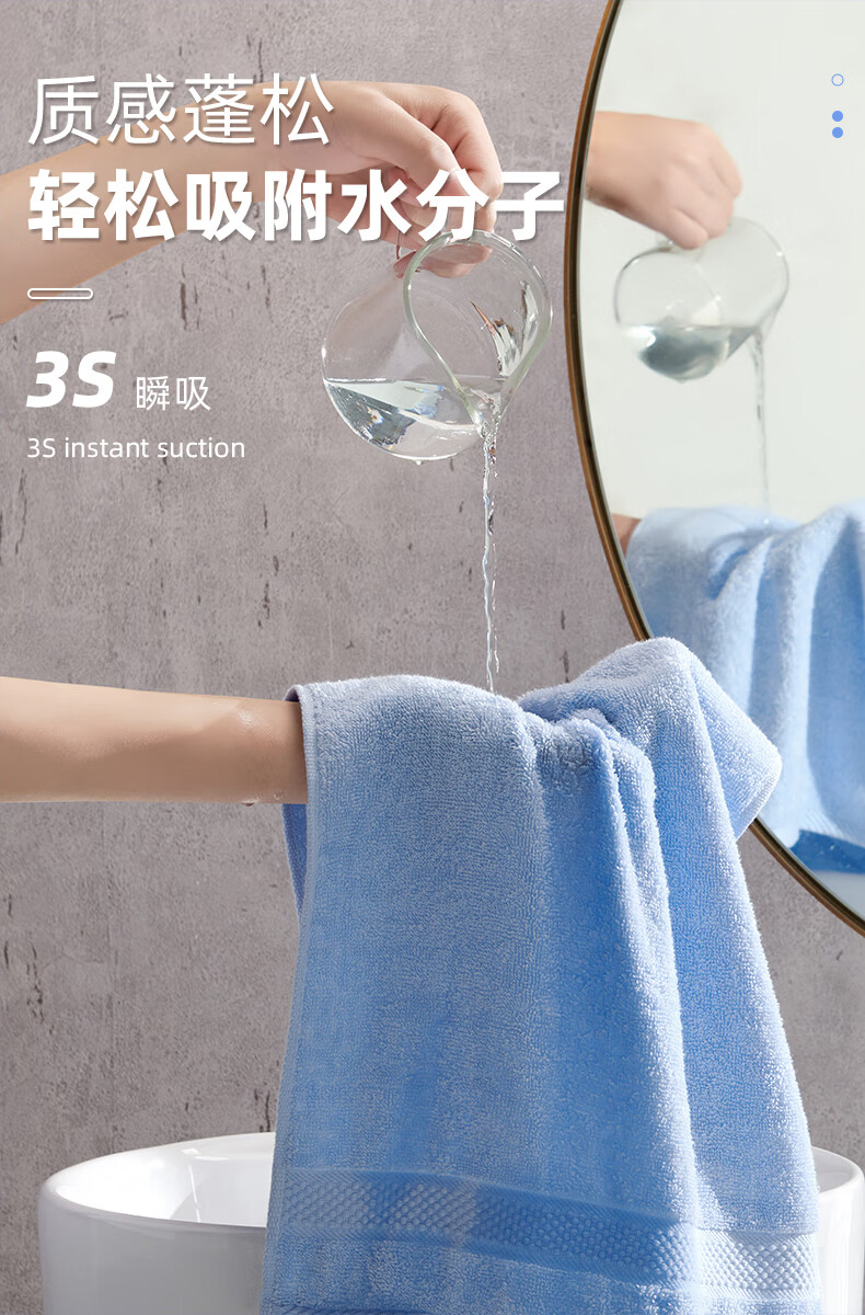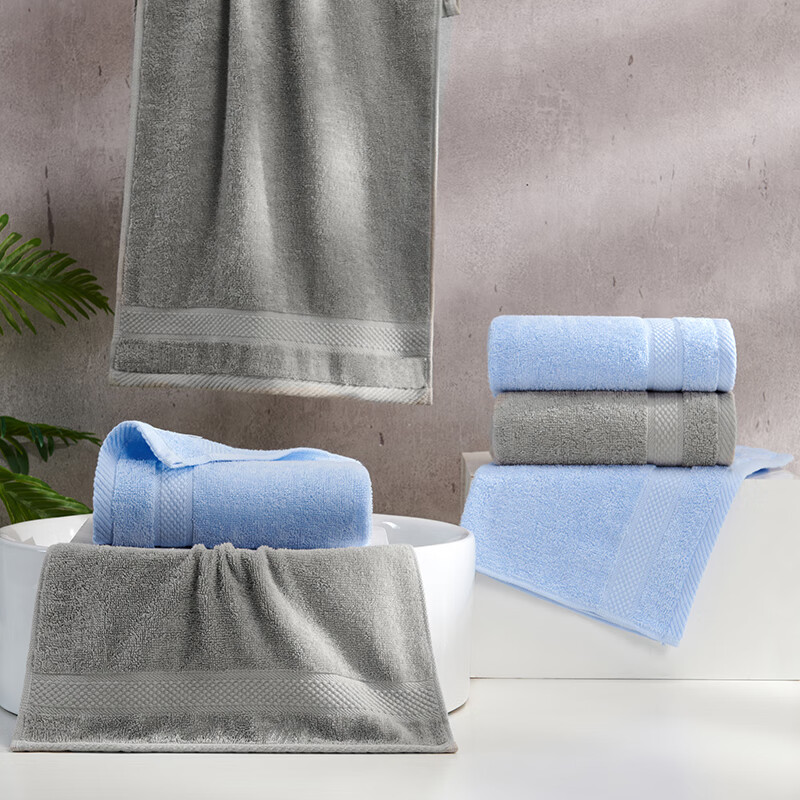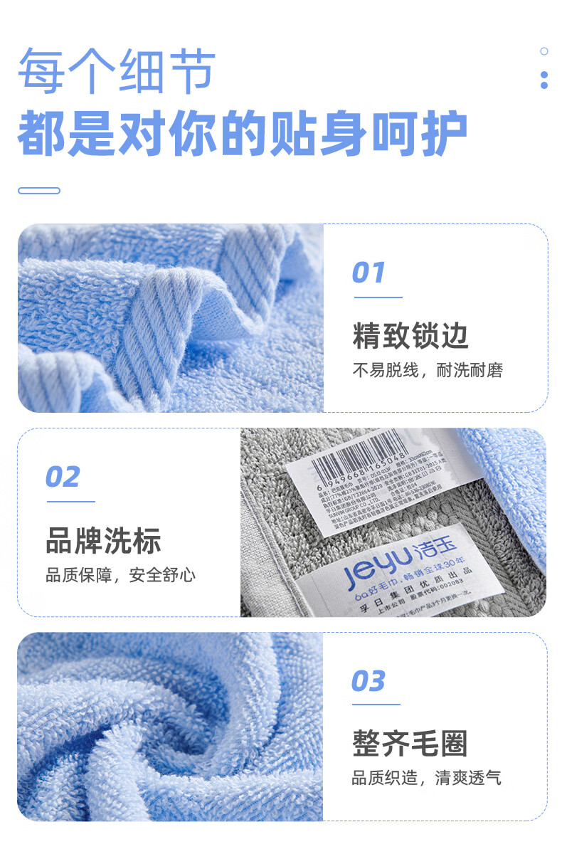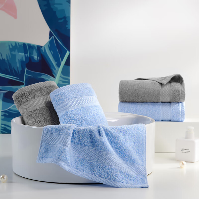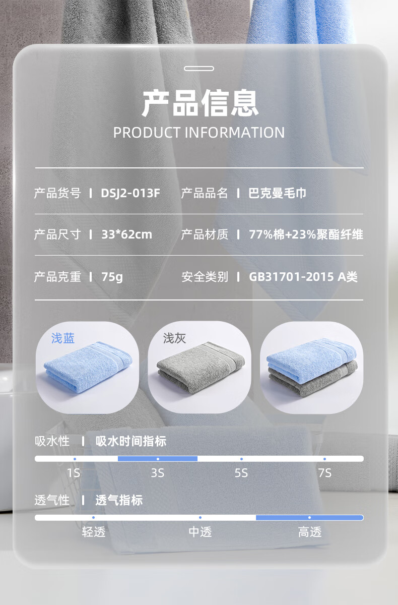 规格:33cmx62cm 75g/条 颜色:蓝灰 材质工艺:77%棉 23%聚酯纤维(装饰部分除外) 包装内容:毛巾 2条 1、选用优质纱线织造,双面毛圈,松软平整,吸水性更强,清爽透气。点缀缎档,简约大气。 2、A类婴幼儿标准,绿色环保染料,未检测出荧光剂、甲醛、致癌物,宝宝用起来更安心。 3、未检出荧光/甲醛/芳香胺,婴幼儿和敏感肌可用。