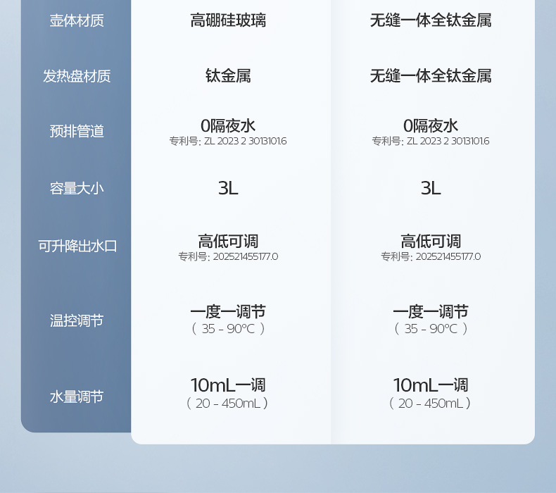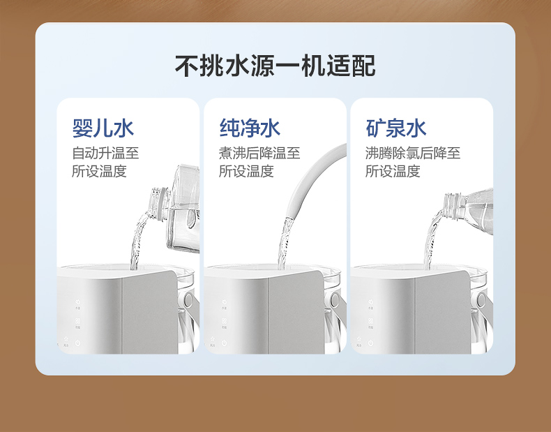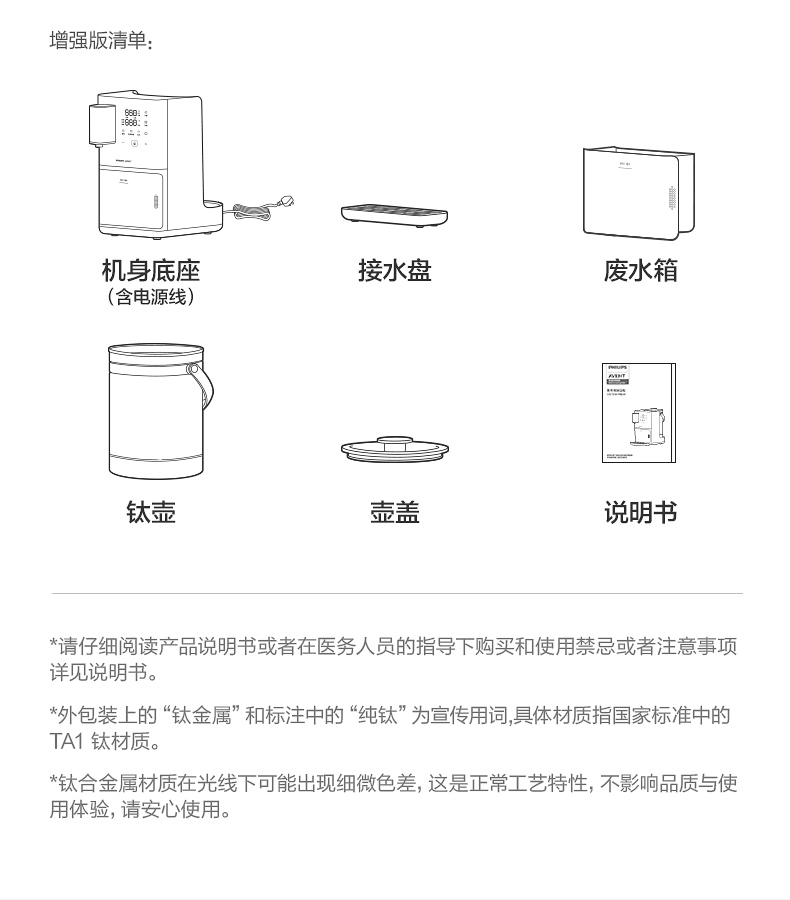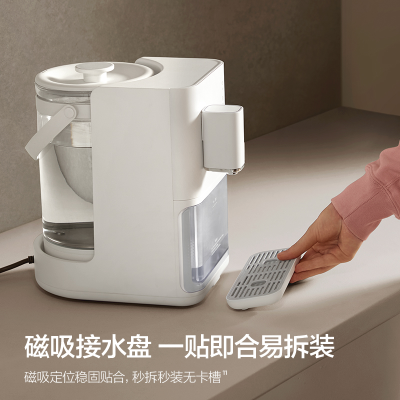 主要材质:ABS 电压:220V~50Hz 功率:1200W 容量:3L 预排技术,确保每次出水洁净如初 升降式出水口,避免接水飞溅更干净 3L钛金属水壶,满足全家冲饮需求 温定量出水,满足不同冲泡温度 钛金属发热盘,稳定加热不易腐蚀 风冷快速降温,冲奶不再久等 接水盘/回收箱可拆洗,卫生看得见