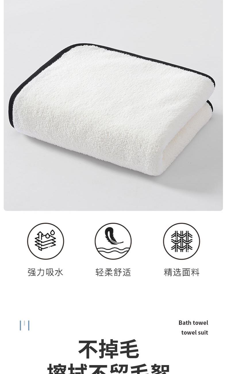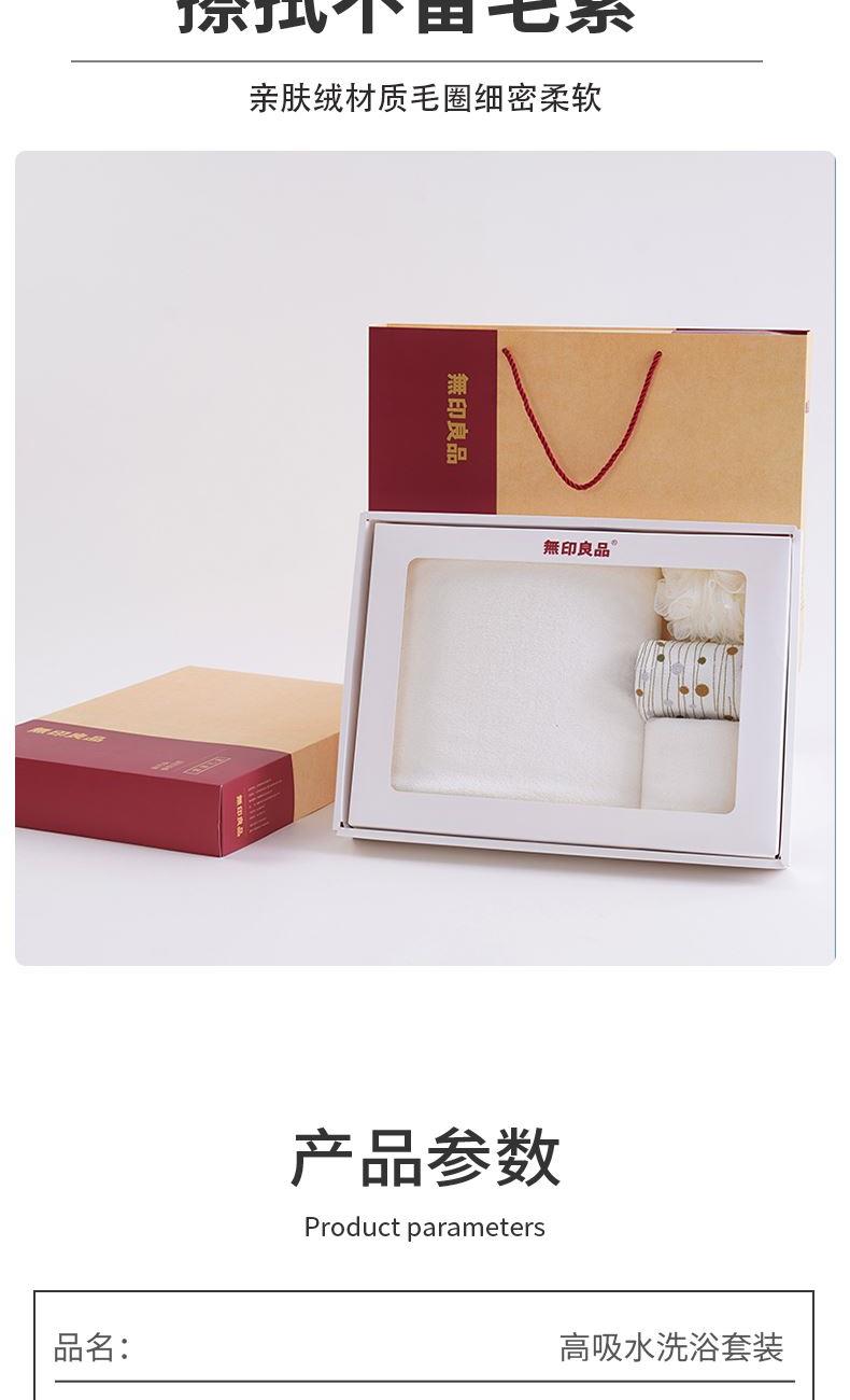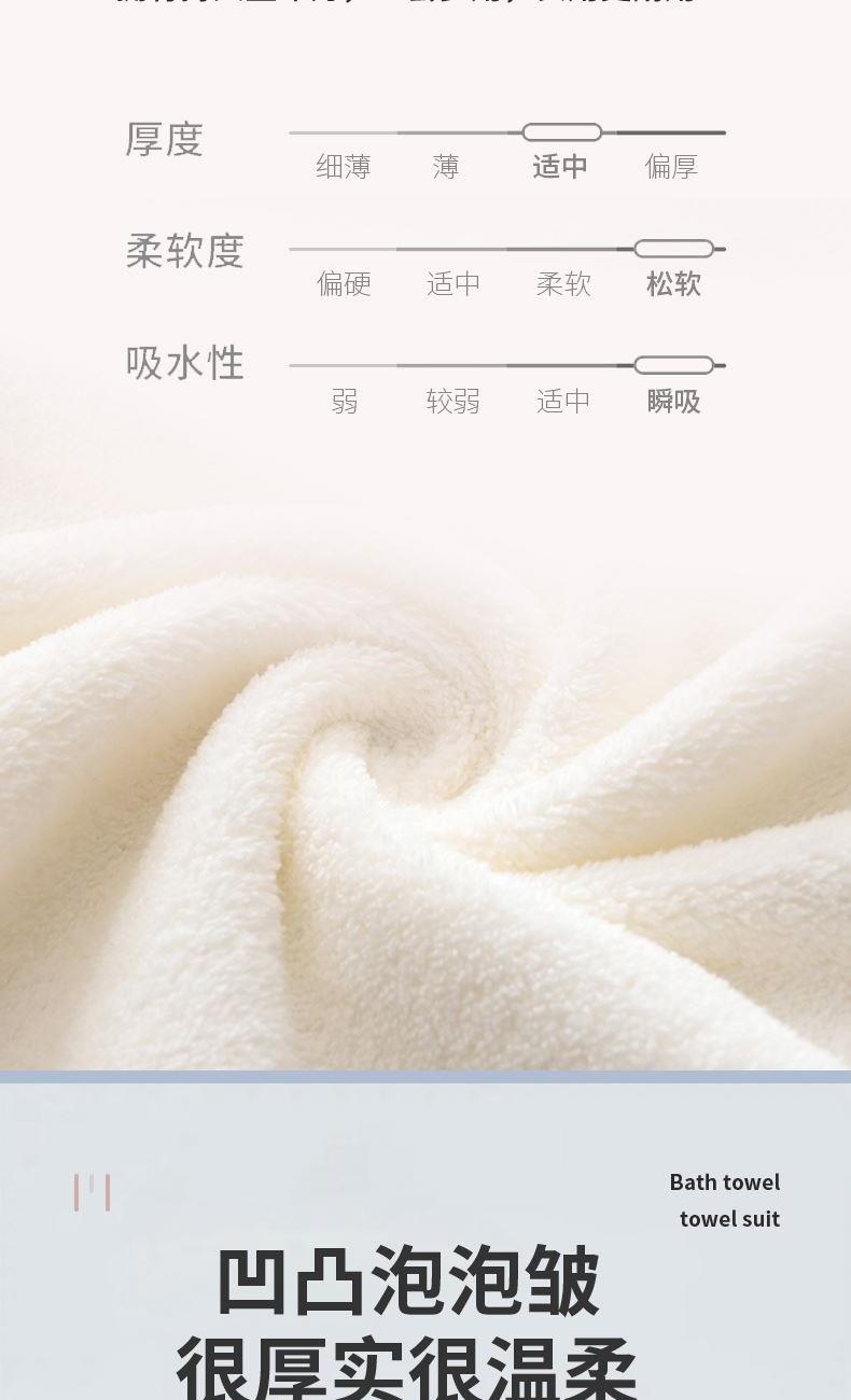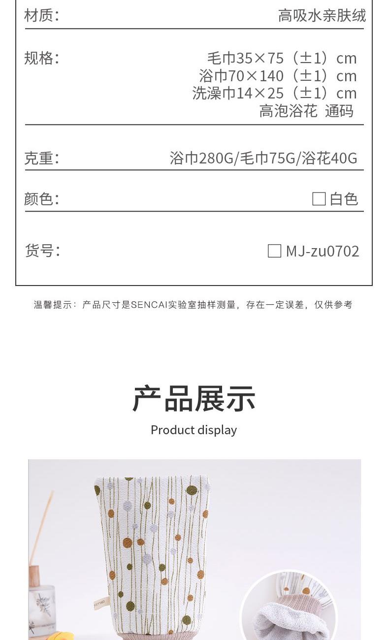 规 格:浴巾70×140(±1)cm 毛巾35×75(±1)cm 洗澡巾14×25(±1)cm 高泡浴花 通码 克 重:浴巾280g/毛巾75g/浴花40g 材 质:高吸水亲肤绒 颜 色:白色 包装尺寸:42×31×7cm
