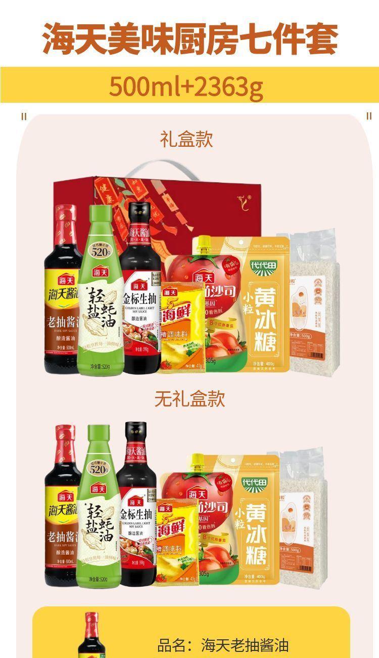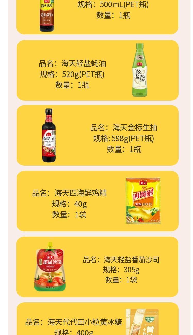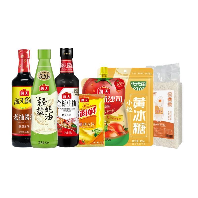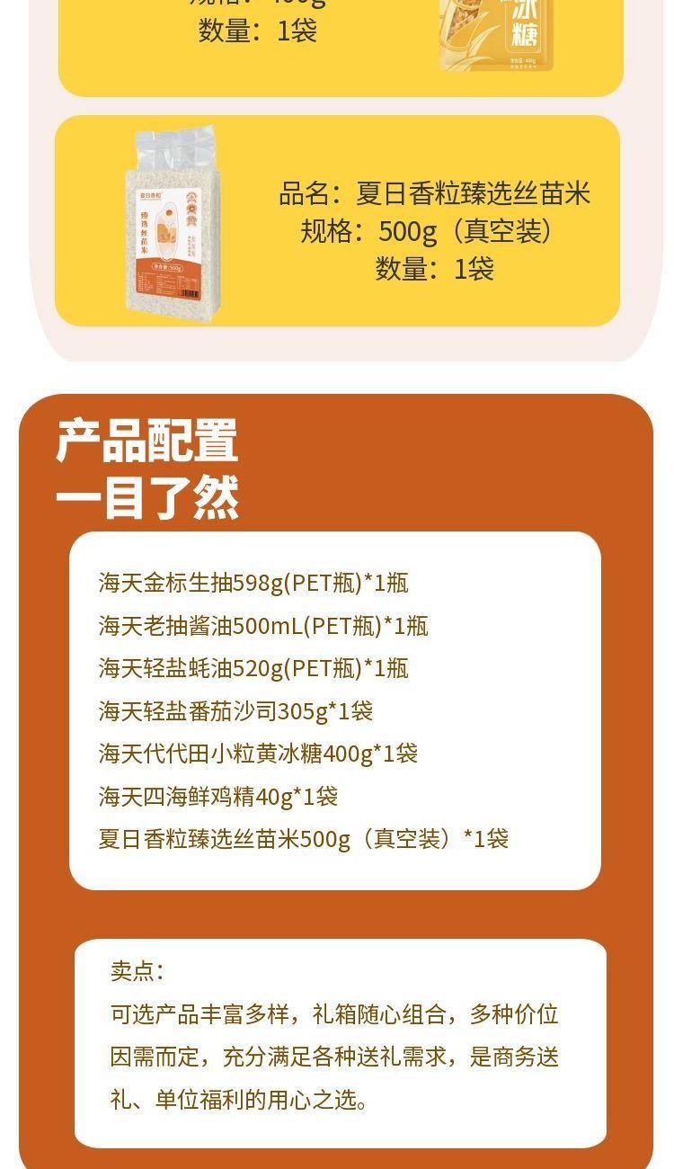 产品配置: 海天金 标生抽598g(PET瓶)*1瓶 海天老抽酱油500mL(PET瓶)*1瓶 海天轻盐蚝油520g(PET瓶)*1瓶 海天轻盐番茄沙司305g*1袋 海天代代田小粒黄冰糖400g*1袋 海天四海鲜鸡精40g*1袋 夏日香粒臻选丝苗米500g(真空装)*1袋 卖点: 可选产品丰富多样,礼箱随心组合,多种价位因需而定,充分满足各种送礼需求,是商务送礼、单位福利的用心之选。
