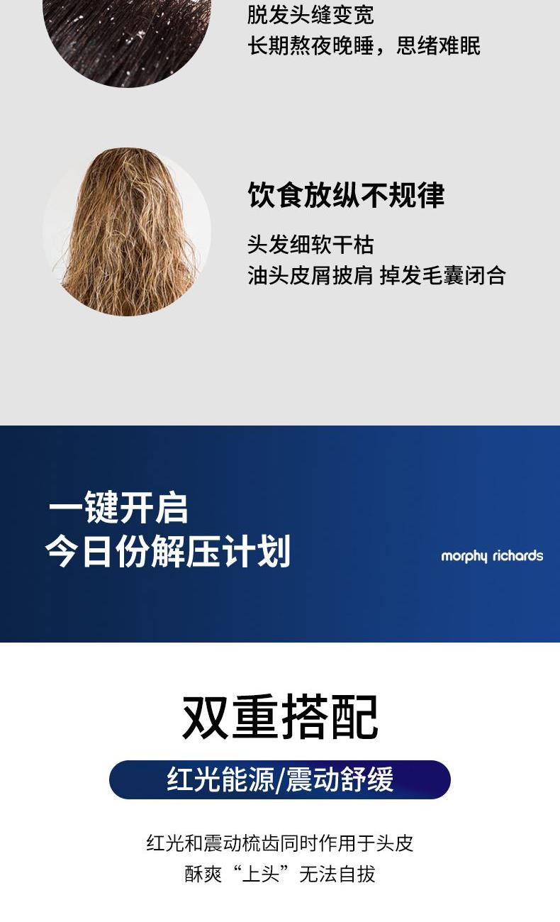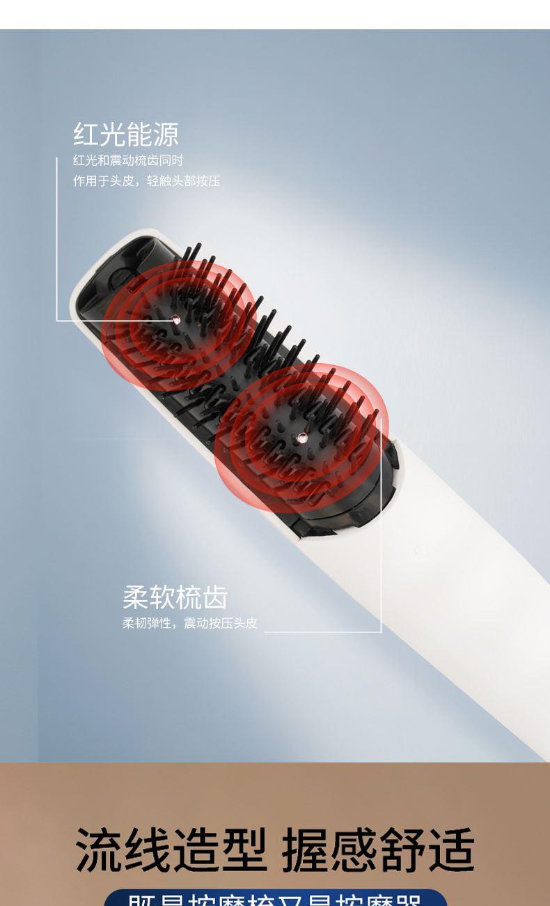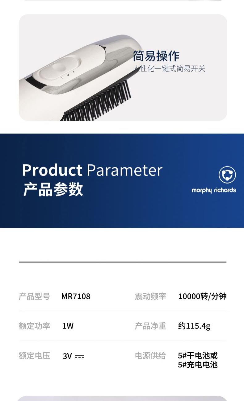 型号 MR7108 产地 广东深圳 69条码 6975660320376 净重 117.3g(不含电池) 毛重 260.5g 包装尺寸 250X100X70mm 大箱尺寸 450×495×508mm 电源供应:AAA电池 额定电压:3V 电机功率:1W 震动频率:10000转/min 材质:ABS+PE 执行标准:GB4706.1-2005 配件:主机,电池*2,说明书 卖点: 微波震动头皮,疏通毛囊放松大脑 红光照射,温热毛囊 可拆卸梳齿,一机多用 赠送电池 流线型握把,符合人体美学,轻巧易握