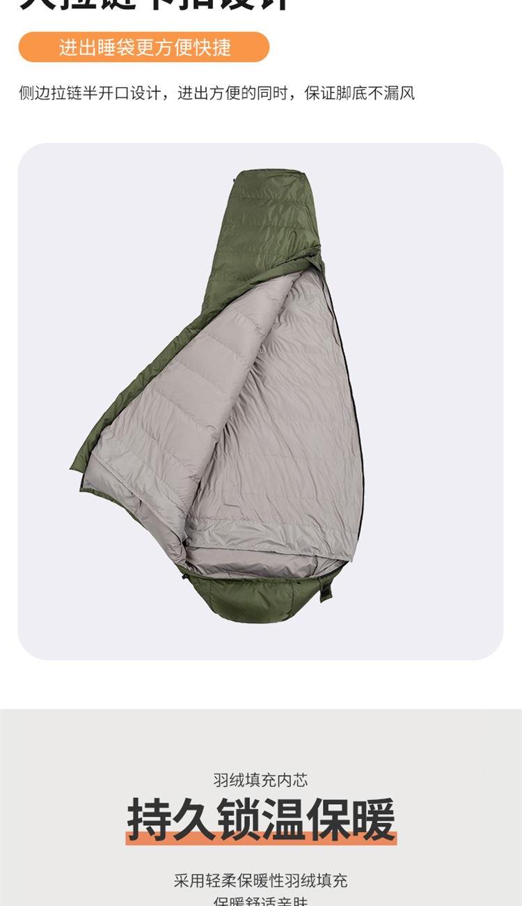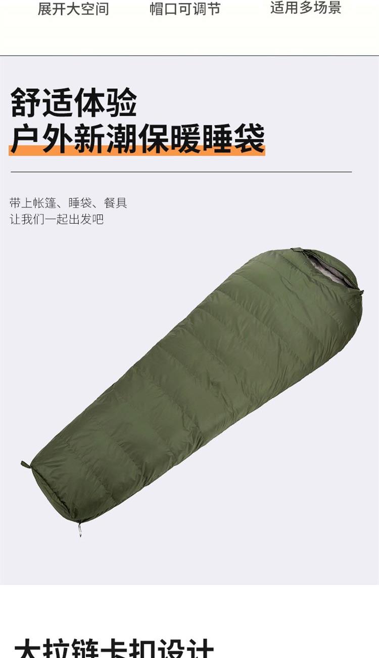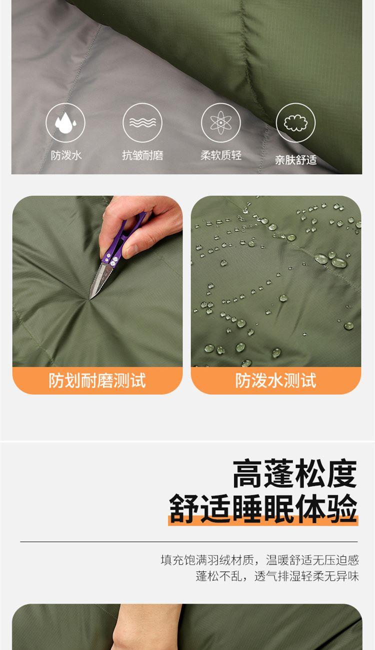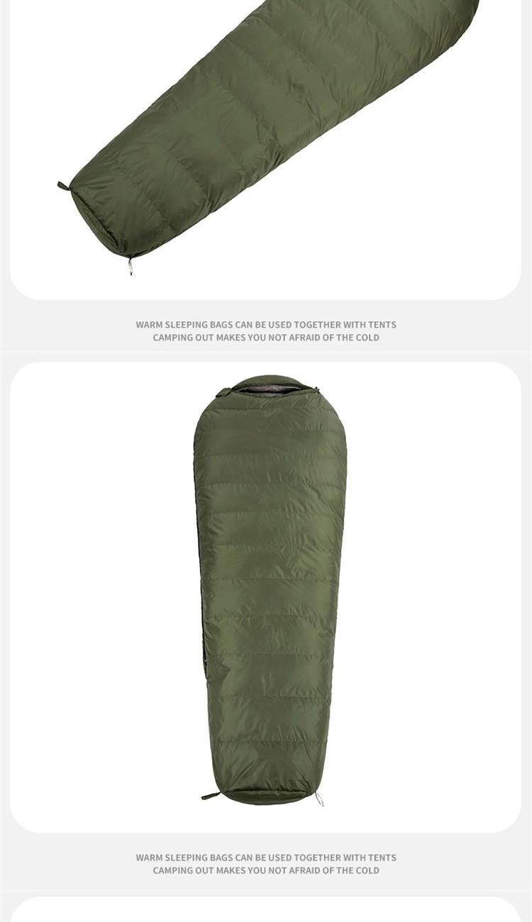 材质:320T抗撕裂尼龙 填充:600克羽绒 颜色:军绿色 规格:210*80*50cm 重量:1.4kg/条