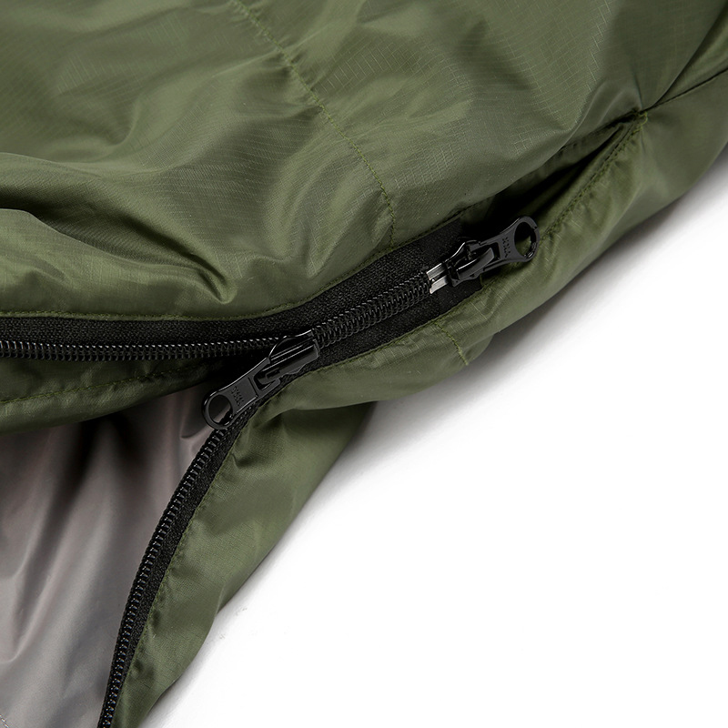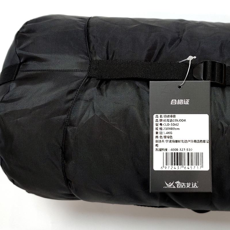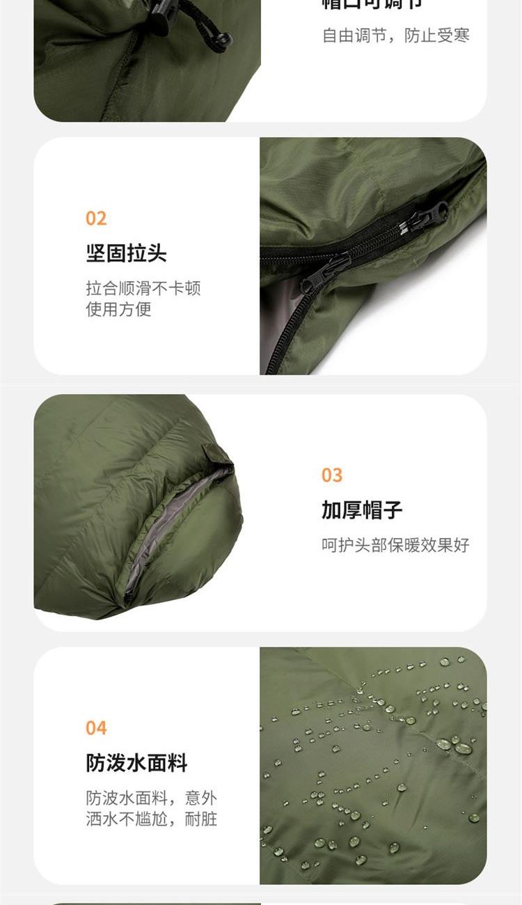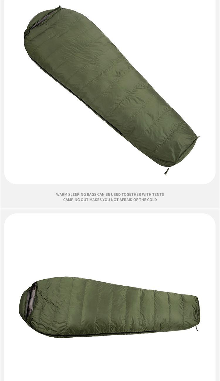 材质:320T抗撕裂尼龙 填充:600克羽绒 颜色:军绿色 规格:210*80*50cm 重量:1.4kg/条