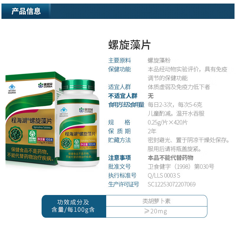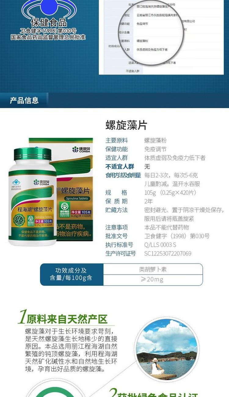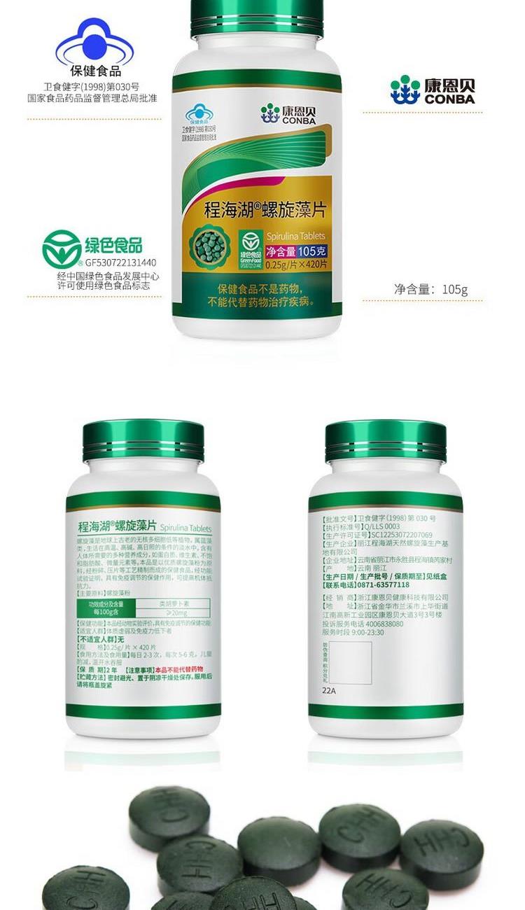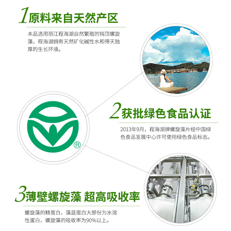 0.25g/片*420片 选用丽江程海湖自然繁殖的钝顶螺旋藻 程海湖牌螺旋藻片为绿色食品 螺旋藻的吸收率为90%以上