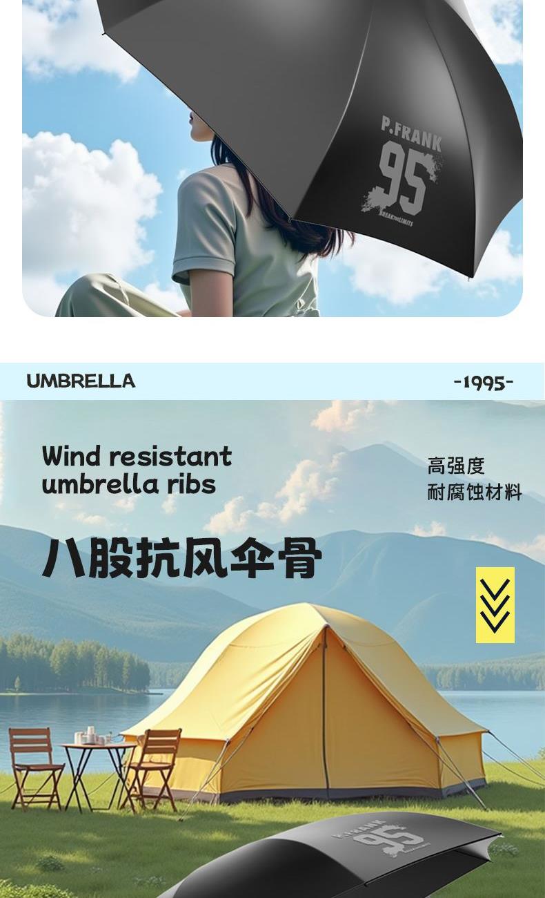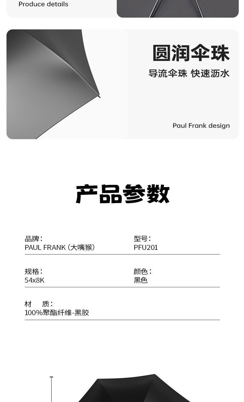 产品型号:PFU201 产品容量:54cm*8K 颜 色:黑色 产品材质:铁/半遮光黑胶 产品配置: 伞*1